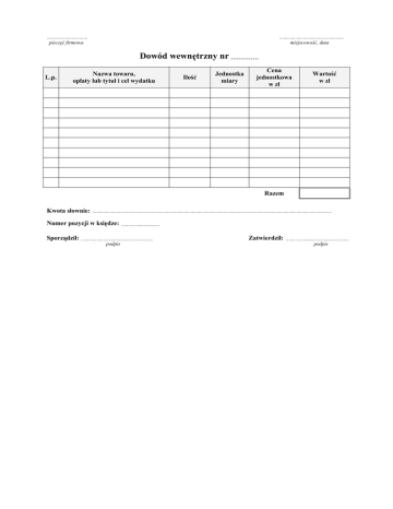 ............................... pieczęć firmowa ................................................. miejscowość, data Dowód wewnętrzny nr .............. L.p. Nazwa towaru, opłaty lub tytuł i cel wydatku Ilość Jednostka miary Cena jednostkowa w zł Wartość w zł Razem Kwota słownie: ....................................................................................................................................................................................... Numer pozycji w księdze: ............................. Sporządził: ....................................................... podpis Zatwierdził: ................................................ podpis