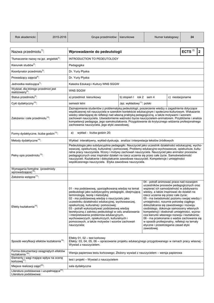 Rok akademicki: Grupa przedmiotów: kierunkowe 2015-2016 1) Nazwa przedmiotu : Wprowadzenie do pedeutologii Tłumaczenie nazwy na jęz. angielski3): INTRODUCTION TO PEDEUTOLOGY 4) Kierunek studiów : 24 Numer katalogowy: ECTS 2) 2 Pedagogika Koordynator przedmiotu5): 6) Dr. Yuriy Plyska Prowadzący zajęcia : Dr. Yuriy Plyska Jednostka realizująca7): Katedra Edukacji i Kultury WNS SGGW Wydział, dla którego przedmiot jest realizowany8): WNS SGGW Status przedmiotu9): a) przedmiot kierunkowy 10) Cykl dydaktyczny : semestr letni Założenia i cele przedmiotu12): Formy dydaktyczne, liczba godzin13): Metody dydaktyczne14): Pełny opis przedmiotu15): b) stopień I rok 2 sem 4 c) niestacjonarne 11) Jęz. wykładowy : polski Zaznajomienie studentów z problematyką pedeutologii, poszerzenie wiedzy o zagadnienia dotyczące współczesnej roli nauczyciela w szerokim kontekście edukacyjnym i społeczno-kulturowym. Wskazanie wiedzy skłaniającej do refleksji nad własną praktyką pedagogiczną, a także motywami i wzorami zachowań nauczyciela. Uświadomienie ważności bycia nauczycielem-animatorem. Przybliżenie i analiza kompetencji pedagoga, jego samokształcenia. Przygotowanie do krytycznego widzenia profesjonalnego zachowania nauczyciela, jego etyki zawodowej. a) wykład - liczba godzin 20; Wykład interaktywny, wykład-dyskusja, analiza i interpretacja tekstów źródłowych Pedeutologia jako subdyscyplina pedagogiki. Nauczyciel jako uczestnik działalności edukacyjnej, wychowawczej, opiekuńczej, kulturalnej i pomocowej. Problemy edukacyjno-wychowawcze, opiekuńcze, kulturalne pracy nauczyciela. Wzory i motywy zachowań nauczyciela. Nauczyciel jako animator procesów pedagogicznych oraz inspirator działań na rzecz uczenia się przez całe życie. Samoświadomość nauczycieli. Kształcenie i dokształcanie zawodowe nauczycieli. Kompetencje i umiejętności współczesnego nauczyciela. Etyka zawodowa nauczyciela. Wymagania formalne (przedmioty wprowadzające)16): Założenia wstępne17): 04 - potrafi animować prace nad rozwojem uczestników procesów pedagogicznych oraz wspierać ich samodzielność w zdobywaniu wiedzy, a także inspirować do działań na rzecz uczenia się przez całe życie; 05 - ma świadomość poziomu swojej wiedzy i umiejętności, rozumie potrzebę ciągłego dokształcania się zawodowego i rozwoju osobistego, dokonuje samooceny własnych kompetencji i doskonali umiejętności, wyznacza kierunki własnego rozwoju i kształcenia; 06 - ma przekonanie o wadze zachowania się w sposób profesjonalny, refleksji na tematy etyczne i przestrzegania zasad etyki zawodowej. Efekty kształcenia18): 01 - ma podstawową, uporządkowaną wiedzę na temat pedeutologii jako subdyscypliny pedagogiki, obejmującą terminologię, teorię i metodykę; 02 - ma podstawową wiedzę o nauczycielu jako uczestniku działalności edukacyjnej, wychowawczej, opiekuńczej, kulturalnej i pomocowej; 03 - potrafi wykorzystywać podstawową wiedzę teoretyczną z zakresu pedeutologii w celu analizowania i interpretowania problemów edukacyjnych, wychowawczych, opiekuńczych, kulturalnych i pomocowych, a także motywów i wzorów zachowań nauczyciela; Sposób weryfikacji efektów kształcenia19): Efekty 01, 02 – test końcowy Efekty: 03, 04, 05, 06 – opracowanie projektu edukacyjnego przygotowanego w ramach pracy własnej Wywiad z nauczycielem. Forma dokumentacji osiągniętych efektów kształcenia 20): Elementy i wagi mające wpływ na ocenę końcową21): 22) Miejsce realizacji zajęć : Literatura podstawowa i uzupełniająca23): Literatura podstawowa: Wersja papierowa testu końcowego; Złożony wywiad z nauczycielem – wersja papierowa test i projekt – Wywiad z nauczycielem sala dydaktyczna 1. 2. 3. Dawid J.W., O duszy nauczycielstwa, Lublin 2002. Kwiatkowska H., Pedeutologia, Wyd. Akademickie i Profesjonalne, Warszawa 2008 Kwieciński Z., Śliwerski B., Pedagogika. Podręcznik akademicki, cz. 2, PWN, Warszawa 2003. Literatura uzupełniająca: 1. Kwiatkowska H., Tożsamość nauczycieli. Miedzy anomia a autonomia, Gdańskie Wydawnictwo Psychologiczne, Gdańsk 2005. 2. Kotusiewicz Alicja A. red., Etos nauczyciela w jednoczącej się Europie, Trans Humana Wydawnictwo Uniwersyteckie, Białystok 2004. 3. Plyska Y., Czy uczelnia kształcąca nauczycieli wychowuje wychowawców?, w: Nauczyciel akademicki z refleksji nad własną praktyką edukacyjną, red. G. Koć-Seniuch, A.A. Kotusiewicz. ŻAK Wydawnictwo Akademickie, Warszawa 2008, s. 180-187. 4. Plyska Y., Kompetencje kulturowe jako podstawa pracy nauczyciela w środowisku wielokulturowym, w: K. Najder-Stefaniak, Y. Plyska (red.), Człowiek w przestrzeni spotkań, Zakład Filozofii WNH SGGW, Warszawa 2010, s. 147-155. UWAGI24): Wskaźniki ilościowe charakteryzujące moduł/przedmiot25) : Szacunkowa sumaryczna liczba godzin pracy studenta (kontaktowych i pracy własnej) niezbędna dla osiągnięcia zakładanych efektów kształcenia18) - na tej podstawie należy wypełnić pole ECTS2: Wykład – 20h – 0,8 ECTS Przygotowanie do testu -15h - 0,6 ECTS Konsultacje – 15h – 0,6 ECTS Łączna liczba punktów ECTS, którą student uzyskuje na zajęciach wymagających bezpośredniego udziału nauczycieli akademickich: Wykład – 20h – 0,8 ECTS Łączna liczba punktów ECTS, którą student uzyskuje w ramach zajęć o charakterze praktycznym, takich jak zajęcia laboratoryjne, projektowe, itp.: Tabela zgodności kierunkowych efektów kształcenia efektami przedmiotu Nr /symbol efektu 01 02 03 04 05 06 50 h 0,8 ECTS ECTS 26) Wymienione w wierszu efekty kształcenia: ma podstawową, uporządkowaną wiedzę na temat pedeutologii jako subdyscypliny pedagogiki, obejmującą terminologię, teorię i metodykę ma podstawową wiedzę o nauczycielu jako uczestniku działalności edukacyjnej, wychowawczej, opiekuńczej, kulturalnej i pomocowej potrafi wykorzystywać podstawową wiedzę teoretyczną z zakresu pedeutologii w celu analizowania i