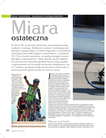 Miara ostateczna Foto: Roberto Bettini Temat: mocometry - rewolucja w treningu kolarskim W latach 80. przenośne pulsometry zrewolucjonizowały myślenie o treningu. Możliwość pomiaru i późniejszej analizy tętna zapisywanego w trakcie aktywności w warunkach naturalnych pozwoliła najpierw zawodnikom, a od jakichś 10-15 lat również amatorom, na analizy dostępne wcześniej tylko w laboratoriach. Tętno okazało się dla większości sportowców nieporównywalnie lepszą miarą wysiłku i wytrenowania niż wcześniej stosowana subiektywna ocena. Podobna rewolucja dzieje się obecnie w kolarstwie za sprawą pomiaru generowanej na rowerze mocy. Foto: Getty Images / Eurosport Najlepszy polski kolarz - Sylwester Szmyd z grupy Liquigas zwyciężył na królewskim 5. etapie „Małego Tour de France” - Critérium du Dauphiné Libéré. Czy dane z jego błękitnego SRM wróżą mu sukces i w Wielkiej Pętli? Najlepiej przekonać się samemu od 4 lipca śledząc relacje na kanale Eurosport, który przeprowadzi ponad 80 godzin transmisji „na żywo” z przebiegu „Wielkiej Pętli” 30 bi ke Bo ar d # 7 l i pi e c 2009 J ednym z pierwszych zawodników, stosujących pomiar mocy na rowerze niestacjonarnym, był w drugiej połowie lat 80. trzykrotny triumfator Tour de France, Amerykanin Greg LeMond. Obecnie większość kolarzy na międzynarodowym poziomie trenuje w oparciu o pomiar mocy. W międzyczasie oferta producentów czujników i oprogramowania oraz trenerów oferujących programy o nie oparte znacznie się rozszerzyła, a ceny sprzętu zeszły z poziomu samochodów do skuterów. W mocometry zaczęli się obecnie wyposażać półprofesjonaliści i ambitni amatorzy. Na początek jednak słowo ostrzeżenia. Pomiar mocy wymaga pracowitego analizowania danych. Jeszcze więcej niż pomiar samego tętna, ponieważ mierzenie mocy nie oznacza, że przestaje się zwracać uwagę na inne parametry, w tym tętno. Zawodowcy wyposażają się w mierniki mocy jako narzędzia treningowe, amatorzy czasem jako najnowsze gadżety i żeby upodobnić się do idoli (ilu z tych, z ogolonymi nogami ma codzienne masaże, przy których to robi różnicę?). To prawda, że fajnie jest porównać się do żarówki, ale prawdopodobnie mocometr nie jest czymś, co przyda się statystycznemu Kowalskiemu, który na rower wsiada raz, dwa w tygodniu, a w teren wybiera się bardziej przygodowo i krajoznawczo, niż dla osiągnięcia konkretnego wyniku sportowego. Więc po co to komu? Pomiar tętna jest jednym z najprostszych sposobów określenia wysiłku, ma jednak szereg wad - przy tym samym natężeniu treningu tętno może zmieniać się w zależności od wyspania, diety, pobudzenia i stresu, nawodnienia i tem-