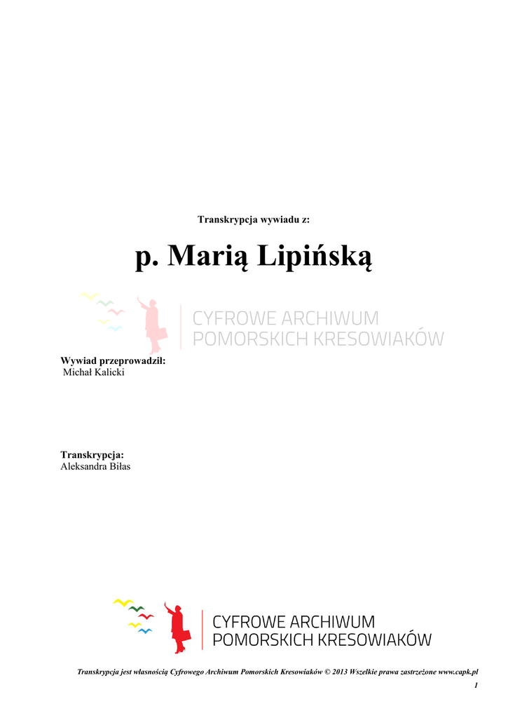 Transkrypcja wywiadu z: p. Marią Lipińską Wywiad przeprowadził: Michał Kalicki Transkrypcja: Aleksandra Biłas Transkrypcja jest własnością Cyfrowego Archiwum Pomorskich Kresowiaków © 2013 Wszelkie prawa zastrzeżone www.capk.pl 1 -Mieszkaliśmy na Konarskiego.. to było tak…była zima ’39, ’40 rok, no bardzo zimna…nie przepraszam, wtedy mieszkaliśmy na małej Pohulance i potem gdzieś w ’40 roku już na Konarskiego, to była wiosna, to ja chodziłam jeszcze do Nazaretanek, jeszcze były siostry Nazaretanki i tam byłam u pierwszej komunii. Normalnie siostry brały dzieci z trzeciej klasy, ale ponieważ przewidywały, że to ostatnia chwilka, więc i nas, czyli drugą klasę, a być może, że i pierwszą, już tego nie pamiętam, przygotowały…i była pierwsza komunia. Było to wszystko bardzo skromnie oczywiście urządzone. Sukienkę miałam białą, zrobioną z mamy welonu ślubnego, uszytą…no i po pierwszej komunii, w kaplicy sióstr był taki poczęstunek i wiem, że on był bardzo przepyszny, bo było kakao i bułeczka taka troszkę słodzona, więc to pamiętam doskonale jak to wszystko smakowało, no bo w ogóle było głodno, nie bardzo było co jeść. No i w tym czasie…no już skończył się rok szkolny…i potem już sióstr nie było. Już siostry wywieźli chyba z Wilna…Nazaretanki, w każdym razie już zamknęli tę szkołę i ja zaczęłam chodzić do trzeciej klasy do szkoły gdzieś w okolicy Mickiewicza ulicy, dokładnie nie pamiętam gdzie to było, ale to już była taka szkoła, no właściwie można powiedzieć litewska, pół-litewska, bo to już jak Ruscy przyszli, to jakoś tak Litwini przyszli, że tak powiem do głosu, no i tam litewskiego trzeba się było uczyć i trochę po litewsku nas uczono, trochę po polsku i chodziłam do tej szkoły…nie wiem czy to co ja mówię jest ważne…no… Tak, wszystko… To co po prostu pamiętam…do tej szkoły chodziło się przez górę „Buffalową” tak zwaną, nazywała się Góra Buffalowa ona była w mojej pamięci bardzo wysoka, i to trzeba było na nią wleźć i zleźć, ale to oczywiście jak miałam 9 lat to nie było problemu żadnego i do tej szkoły się biegało, ale nic takiego z wojny w tej chwili nie pamiętam wojennej, chodziłam do szkoły po prostu potem przybiegałam do domu. Teraz żebym nie poplątała, kiedy mój tata był chory taki, ciężko, taki ciężko chory…to był za Rusków…tak, zaraz na początku wojny, nie wiem co strzeliło mojemu tacie do głowy, poddać się operacji wrzodów żołądka, zdecydował się i wykonał tę operację profesor Michejda, to wam powinno coś wszystkim mówić, bo to znane dosyć nazwisko i w Wilnie było bardzo znane i profesor Michejda potem chyba…on nie był w Gdańsku…on potem chyba do Lwowa wyjechał, w każdym razie profesor Michejda operował mego tatę, no i potem tata leżał bardzo długo w domu i dostał z tego wszystkiego… miał ropień w płucu, a nie było penicyliny, więc już był na umarcie, że tak powiem przeznaczony, no i tak leżał, leżał, leżał, a mama pracowała gdzieś… nie wiem gdzie…już nie na Wilczej Łapie, pewnie nie było Wilczej Łapy…w każdym razie wychodziła do pracy, ja opiekowałam się tatą, ale teraz gdzie się mieści ten fragment, który ja chciałam opowiedzieć, otóż fragment jest taki, że to była zima, wszystko było oblodzone i studnia na naszym podwórku, taka pompa z rączką, co tak się pompowało, była oblodzona, trzeba było iść dwa domy dalej, tam za domem państwa Kalickich, gdzie była studnia, gdzie wciągało się wodę wiadrem. To wszystko było strasznie zalodziałe. Bardzo ciężko było wyciągnąć tą wodę, no i mama poszła po tę wodę, ale była w ciąży w tym czasie już…no i był mróz i niosła dwa wiadra wody, z trudem wyciągnięte, bo był wielki mróz… i szła, w którymś momencie pośliznęła się i upadła i ta woda wylała się, mama siedziała i płakała, a przechodził tamtędy twój pradziadek, pan Tadeusz Kalicki, to pradziadek tak? To pradziadek jego… Transkrypcja jest własnością Cyfrowego Archiwum Pomorskich Kresowiaków © 2013 Wszelkie prawa zastrzeżone www.capk.pl 2 Tak, pradziadek… …a twój ojciec, pan Tadeusz, nie powiedział ani słowa, podszedł, pomógł mamie wstać, potem wziął wiadra w milczeniu, poszedł do studni, nabrał wody, potem z powrotem przyniósł do nas do domu…taki o, moment był…poza tym, pradziadek twój pracował w czymś, co miało związek z mąką i przynosił tą mąkę w takim…. Transkrypcja jest własnością Cyfrowego Archiwum Pomorskich Kresowiaków © 2013 Wszelkie prawa zastrzeżone www.capk.pl 3 -Tak w piekarni… w takim czymś… nie wiem czy to była piekarnia czy to był młyn, w każdym bądź razie przynosił mąkę w takim…pasek taki miał uszyty, to pewno wiecie z rodzinnych opowiadań, że tą mąkę przynosił, prawda, bo był głód straszny, więc dzięki temu mieliście mąkę, a z kolei, moja mama brała w sobotę plecak, brała jakieś zabaweczki drobne, które z domu pobraliśmy z Wywólskiego moje, takie zwierzątka lubiłam mieć małe drewniane , takich miałam pełno, małych drewnianych, takich kotków, piesków, królików, kogutków i tak dalej, niosła te zwierzątka i pewnie różne inne rzeczy i szła na wieś. Wracała na drugi dzień z plecakiem i przynosiła słoninę, jajka, masło…tam takie różne, inne rzeczy…Jeżeli to jest istotne w sensie socjologicznym, powiedzmy, moment to pamiętam dokładnie jak mama wyciągała to wszystko z plecaka, układała na stole, potem układała na półkę masło, tą słoninę, to, to, to, wkładała do woreczka i mówiła „Teraz biegnij i zanieś to do państwa Kalickich, bo tam są małe dzieci”. To opowiadam wyłącznie jako moment socjologiczny, nie…dotyczący mojej Mamy jako osoby, po prostu… no tak już było. I ja wtedy biegłam i to zanosiłam. No i... co jes