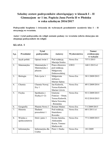 Szkolny zestaw podręczników obowiązujący w klasach I – II Gimnazjum nr 1 im. Papieża Jana Pawła II w Płońsku w roku szkolnym 2016/2017 Podręczniki bezpłatne i ćwiczenia do wybranych przedmiotów uczniowie klas I – II otrzymają we wrześniu. Autor i tytuł podręcznika do religii zostanie podany we wrześniu (oferta dotacyjna nie obejmuje podręczników do religii) KLASA I Lp. Przedmiot Tytuł podręcznika 1. Język polski Opisać świat 1 2. Matematyka Matematyka 1 Matematyka z plusem 3. Biologia Puls życia 1 4. Chemia Chemia Nowej Ery 1 5. Fizyka Spotkania z fizyką (1+2) 6. 7. Geografia Historia Planeta Nowa 1 Śladami przeszłości 1 8. Wiedza o społeczeństwie Dziś i jutro 1 9. Informatyka Informatyka dla Ciebie Autorzy Pod redakcją Macieja Szulca Praca zbiorowa pod redakcją Małgorzaty Dobrowolskiej Małgorzata Jefimow, Marian Sęktas Jan Kulawik, Teresa Kulawik, Marian Litwin Grażyna Francuz – Ornat, Teresa Kulawik, Maria Nowotny - Różańska Roman Malarz Pod redakcją Stanisława Roszaka Iwona Janicka, Aleksandra Kucia, Tomasz Maćkowski Piotr J. Durka Numer Wydawnictwo ewidencyjny w wykazie Nowa Era 757/1/2015 GWO 168/1/2015/z1 Nowa Era 58/1/2009/2015 Nowa Era 49/1/2009/2014 Nowa Era 93/1/2009/2015 93/2/2010/2015 Nowa Era Nowa Era 7/1/2009/2015 60/1/2011/z1 Nowa Era 77/1/2009/2015 Nowa Era 181/2009 10. 11. Muzyka Język angielski Gra muzyka! New English Puls 2 12. Język niemiecki Kompass neu 1 13. Język rosyjski Wsio prosto! 1 15. Wychowanie do życia w rodzinie Wędrując ku dorosłości Jan Oleszkowicz Ben Wetz, James Styring, Nicholas Tims, Jenny Quintana, Alicja Gałązka Agnieszka Sibiga, Elżbieta Reymont, Małgorzata Jezierska Wiejak Barbara Chlebda, Irena Danecka Pod redakcją Teresy Król Nowa Era Oxford University Press 20/2009/2015 732/2/2015 WSZ PWN 622/1/2012/2015 WSZ PWN 706/1/2014/2015 Rubikon 205/2011/z1/2015 KLASA II Przedmiot Tytuł podręcznika 1. Język polski Opisać świat 2 2. Matematyka 3. Biologia Matematyka 2 Matematyka z plusem Puls życia 2 4. Chemia Chemia Nowej Ery 2 5. Fizyka Spotkania z fizyką 3 6. Geografia Planeta Nowa 2 Lp. Autorzy Pod redakcją Macieja Szulca Praca zbiorowa pod redakcją M. Dobrowolskiej Małgorzata Jefimow Jan Kulawik, Teresa Kulawik, Marian Litwin Grażyna Francuz – Ornat, Teresa Kulawik, Maria Nowotny - Różańska Dawid Szczypiński, Mirosław Wójtowicz Numer Wydawnictwo ewidencyjny w wykazie Nowa Era 757/2/2016 GWO 168/2/2015/z1 Nowa Era 58/2/2009/2015 Nowa Era 49/2/2009/2015 Nowa Era 93/3/2010/2015 Nowa Era 7/2/2009/2015 7. Historia 8. Wiedza o społeczeństwie 9. Plastyka 10. Zajęcia techniczne Śladami przeszłości 2 Dziś i jutro 2 Sztuka tworzenia Technika w praktyce Zajęcia mechaniczno – motoryzacyjne. Materiały edukacyjne do zajęć technicznych dla gimnazjum Technika w praktyce Zajęcia elektryczno elektroniczne. Materiały edukacyjne do zajęć technicznych dla gimnazjum New English Puls 3 11. Język angielski 12. Język niemiecki Kompass neu 2 13. Język rosyjski Wsio prosto! 2 Stanisław Roszak Iwona Janicka, Arkadiusz Janicki, Aleksandra Kucia, Tomasz Maćkowski Natalia Mrozkowiak Waldemar Czyżewski, Waldemar Lib, Wojciech Walat Nowa Era 60/2/2010 Nowa Era 77/2/2010/2015 Nowa Era 725/2014 Nowa Era 196/2/2010 Waldemar Czyżewski Nowa Era 196/1/2009 Ben Wetz, James Styring, Nicholas Tims, Jenny Quintana, Alicja Gałązka Agnieszka Sibiga, Elżbieta Reymont, Małgorzata Jezierska Wiejak Barbara Chlebda, Irena Oxford University Press 732/3/2015 WSZ PWN 622/2/2012/2015 WSZ PWN 706/2/2015 15. Wychowanie do życia w rodzinie Wędrując ku dorosłości Danecka Pod redakcją Teresy Król Rubikon 205/2011/z1/2015