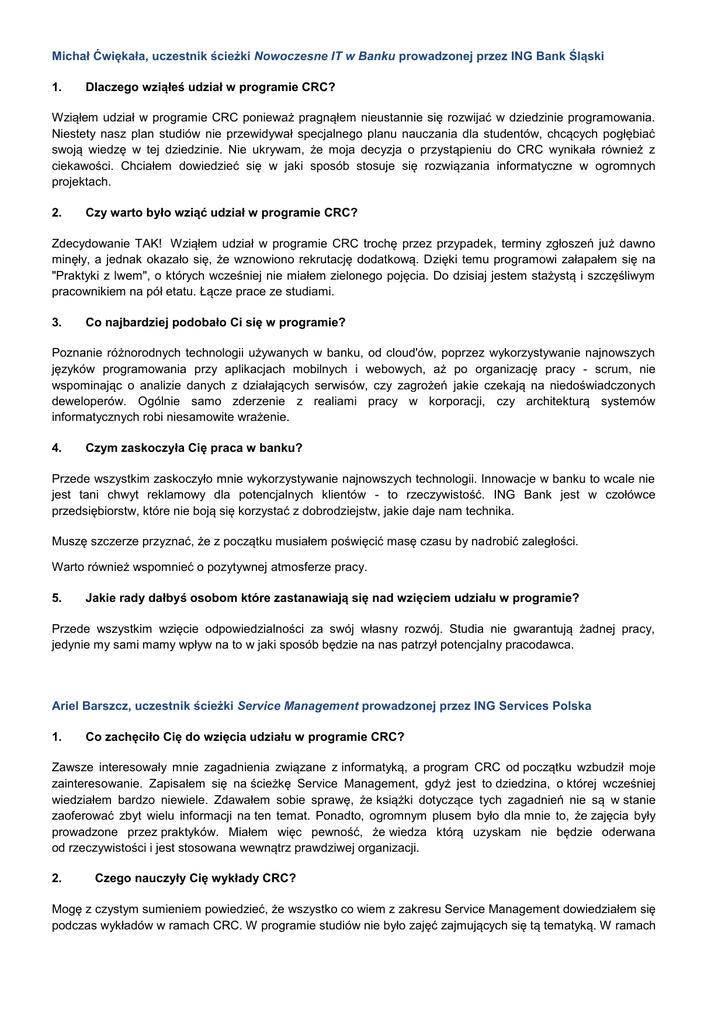 Michał Ćwiękała, uczestnik ścieżki Nowoczesne IT w Banku prowadzonej przez ING Bank Śląski 1. Dlaczego wziąłeś udział w programie CRC? Wziąłem udział w programie CRC ponieważ pragnąłem nieustannie się rozwijać w dziedzinie programowania. Niestety nasz plan studiów nie przewidywał specjalnego planu nauczania dla studentów, chcących pogłębiać swoją wiedzę w tej dziedzinie. Nie ukrywam, że moja decyzja o przystąpieniu do CRC wynikała również z ciekawości. Chciałem dowiedzieć się w jaki sposób stosuje się rozwiązania informatyczne w ogromnych projektach. 2. Czy warto było wziąć udział w programie CRC? Zdecydowanie TAK! Wziąłem udział w programie CRC trochę przez przypadek, terminy zgłoszeń już dawno minęły, a jednak okazało się, że wznowiono rekrutację dodatkową. Dzięki temu programowi załapałem się na "Praktyki z lwem", o których wcześniej nie miałem zielonego pojęcia. Do dzisiaj jestem stażystą i szczęśliwym pracownikiem na pół etatu. Łącze prace ze studiami. 3. Co najbardziej podobało Ci się w programie? Poznanie różnorodnych technologii używanych w banku, od cloud'ów, poprzez wykorzystywanie najnowszych języków programowania przy aplikacjach mobilnych i webowych, aż po organizację pracy - scrum, nie wspominając o analizie danych z działających serwisów, czy zagrożeń jakie czekają na niedoświadczonych deweloperów. Ogólnie samo zderzenie z realiami pracy w korporacji, czy architekturą systemów informatycznych robi niesamowite wrażenie. 4. Czym zaskoczyła Cię praca w banku? Przede wszystkim zaskoczyło mnie wykorzystywanie najnowszych technologii. Innowacje w banku to wcale nie jest tani chwyt reklamowy dla potencjalnych klientów - to rzeczywistość. ING Bank jest w czołówce przedsiębiorstw, które nie boją się korzystać z dobrodziejstw, jakie daje nam technika. Muszę szczerze przyznać, że z początku musiałem poświęcić masę czasu by nadrobić zaległości. Warto również wspomnieć o pozytywnej atmosferze pracy. 5. Jakie rady dałbyś osobom które zastanawiają się nad wzięciem udziału w programie? Przede wszystkim wzięcie odpowiedzialności za swój własny rozwój. Studia nie gwarantują żadnej pracy, jedynie my sami mamy wpływ na to w jaki sposób będzie na nas patrzył potencjalny pracodawca. Ariel Barszcz, uczestnik ścieżki Service Management prowadzonej przez ING Services Polska 1. Co zachęciło Cię do wzięcia udziału w programie CRC? Zawsze interesowały mnie zagadnienia związane z informatyką, a program CRC od początku wzbudził moje zainteresowanie. Zapisałem się na ścieżkę Service Management, gdyż jest to dziedzina, o której wcześniej wiedziałem bardzo niewiele. Zdawałem sobie sprawę, że książki dotyczące tych zagadnień nie są w stanie zaoferować zbyt wielu informacji na ten temat. Ponadto, ogromnym plusem było dla mnie to, że zajęcia były prowadzone przez praktyków. Miałem więc pewność, że wiedza którą uzyskam nie będzie oderwana od rzeczywistości i jest stosowana wewnątrz prawdziwej organizacji. 2. Czego nauczyły Cię wykłady CRC? Mogę z czystym sumieniem powiedzieć, że wszystko co wiem z zakresu Service Management dowiedziałem się podczas wykładów w ramach CRC. W programie studiów nie było zajęć zajmujących się tą tematyką. W ramach CRC poznałem podstawy ITIL-a, który jest szeroko stosowany w zarządzaniu usługami IT. Dziś tą wiedzę wykorzystuję w codziennej pracy. Gdybym nie uczestnictwo w programie CRC, z całą pewnością nie byłbym na tym etapie zawodowym, na którym jestem dzisiaj. 3. Czy jest coś, co w szczególności Ci się podobało w trakcie trwania programu? Najbardziej doceniam to, że wykładowcy pokazywali nam, jak modele teoretyczne wyglądają w praktyce, wewnątrz organizacji. Takich informacji nie da się wyczytać z książek. Bardzo ciekawym punktem wykładów była wizyta w firmie, której pracownicy prowadzili wykłady, czyli w siedzibie ING Services Polska. Biuro firmy zrobiło na mnie duże wrażenie - przytulne, udekorowane interesującymi motywami, a zarazem bardzo nowoczesne. To między innymi spowodowało, że chciałem pracować w ISP. 4. Co oceniasz jako główny pozytywny efekt twojego udziału w CRC z dzisiejszego punktu widzenia? Najważniejsze dla mnie jest to, że dzięki programowi CRC zaraz po studiach otrzymałem dobrą pracę, w obszarze, który mnie interesuje. Dzisiaj pracuję z osobami, które prowadziły zajęcia i uczestniczę w operacjach, które były tematem wykładów. 5. Gdybyś dzisiaj miał podjąć decyzję, to czy wziął byś udział w kolejnej edycji CRC? Oczywiście, bez wahania. Uważam, że to był bardzo dobrze spożytkowany czas. W tym roku znowu jest wiele bardzo interesujących przedmiotów. Jestem przekonany, że w żaden inny sposób student nie jest w stanie uzyskać podobnej wiedzy w tak przyjazny sposób. 6. Jak zachęciłbyś studentów do uczestnictwa w tegorocznej edycji programu? Drogi studencie! Przed Tobą ogromna szansa. Udział w wykładach prowadzonych w ramach programu CRC może zaowocować bardzo ciekawym rozwojem zawodowym w dobrej firmie, na dobrym stanowisku, z ciekawymi perspektywami. Taki program daje naprawdę dużo. Tym bardziej, że CRC to nie jednorazowe wykłady, a cykl spotkań, dzięki czemu poznajesz temat w sposób pogłębiony. To powoduje, że CRC jest programem unikatowym. Daniel Palonek, uczestnik ścieżki Nowoczesne IT w Banku prowadzonej przez ING Bank Śląski 1. Dlaczego wziąłeś udział w programie CRC? Wziąłem udział w programie CRC, ponieważ chciałem mieć możliwość pozyskania wiedzy na temat branży IT rozwijanej w banku. Istotnym dla mnie było, że wiedza ta będzie przekazywana bezpośrednio od specjalistów. Do udziału zmotywowała mnie również informacja, że dla najlepszych studentów oferowane będą staże i oferty pracy. 2. Czy warto było wziąć udział w prog