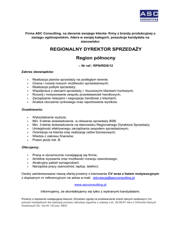 Firma ASC Consulting, na zlecenie swojego klienta- firmy z branży produkcyjnej o zasięgu ogólnopolskim, lidera w swojej kategorii, poszukuje kandydata na stanowisko: REGIONALNY DYREKTOR SPRZEDAŻY Region północny – Nr ref.: RPN/RDS/12 Zakres obowiązków: • • • • • • • Realizacja planów sprzedaży na podległym terenie; Ocena i rozwój nowych możliwości sprzedażowych; Realizacja polityki sprzedaży; Współpraca z sieciami sprzedaży i kluczowymi klientami hurtowymi; Rozwój i motywowanie zespołu przedstawicieli handlowych; Zarządzanie relacjami i negocjacje handlowe z klientami; Analiza otoczenia rynkowego oraz raportowanie wyników. Oczekiwania: • • • • • • • Wykształcenie wyższe; Min. 5-letnie doświadczenie w obszarze sprzedaży B2B; Min. 3-letnie doświadczenie na stanowisku Regionalnego Dyrektora Sprzedaży; Umiejętność efektywnego zarządzania zespołem sprzedażowym; Orientacja na klienta oraz realizację celów biznesowych; Wiedza z zakresu finansów; Prawo jazdy kat. B. Oferujemy: • • • • Pracę w dynamicznie rozwijającej się firmie; Ambitne wyzwania oraz możliwość rozwoju zawodowego; Atrakcyjny pakiet wynagrodzeń; Narzędzia pracy (samochód, laptop, telefon). Osoby zainteresowane naszą ofertą prosimy o kierowanie CV wraz z listem motywacyjnym z dopisanym nr referencyjnym na adres e-mail: [email protected] www.ascconsulting.pl Informujemy, że skontaktujemy się tylko z wybranymi kandydatami. Prosimy o dopisanie następującej klauzuli „Wyrażam zgodę na przetwarzanie moich danych osobowych dla potrzeb niezbędnych dla realizacji procesu rekrutacji (zgodnie z ustawą z dn. 29.08.97 roku o Ochronie Danych Osobowych Dz. Ust Nr 133 poz. 883)”