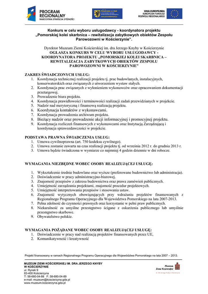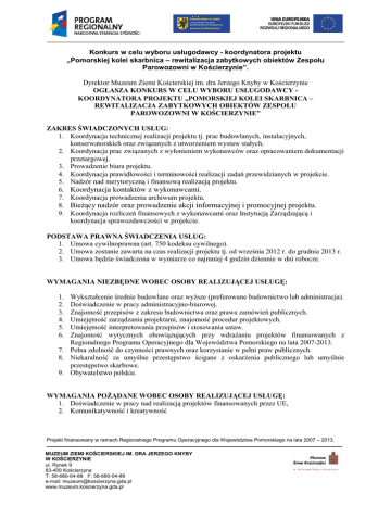 Konkurs w celu wyboru usługodawcy - koordynatora projektu „Pomorskiej kolei skarbnica – rewitalizacja zabytkowych obiektów Zespołu Parowozowni w Kościerzynie”. Dyrektor Muzeum Ziemi Kościerskiej im. dra Jerzego Knyby w Kościerzynie OGŁASZA KONKURS W CELU WYBORU USŁUGODAWCY KOORDYNATORA PROJEKTU „POMORSKIEJ KOLEI SKARBNICA – REWITALIZACJA ZABYTKOWYCH OBIEKTÓW ZESPOŁU PAROWOZOWNI W KOŚCIERZYNIE” ZAKRES ŚWIADCZONYCH USŁUG: 1. Koordynacja technicznej realizacji projektu tj. prac budowlanych, instalacyjnych, konserwatorskich oraz związanych z utworzeniem wystaw stałych. 2. Koordynacja prac związanych z wyłonieniem wykonawców oraz opracowaniem dokumentacji przetargowej. 3. Prowadzenie biura projektu. 4. Koordynacja prawidłowości i terminowości realizacji zadań przewidzianych w projekcie. 5. Nadzór nad merytoryczną i finansową realizacją projektu. 6. Koordynacja kontaktów z wykonawcami. 7. Koordynacja prowadzenia archiwum projektu. 8. Bieżący nadzór oraz prowadzenie akcji informacyjnej i promocyjnej projektu. 9. Koordynacja rozliczeń finansowych z wykonawcami oraz Instytucją Zarządzającą i koordynacja sprawozdawczości w projekcie. PODSTAWA PRAWNA ŚWIADCZENIA USŁUG: 1. Umowa cywilnoprawna (art. 750 kodeksu cywilnego). 2. Umowa zostanie zawarta na czas realizacji projektu tj. od września 2012 r. do grudnia 2013 r. 3. Umowa będzie świadczona w wymiarze co najmniej 4 godzin dziennie w dni robocze. WYMAGANIA NIEZBĘDNE WOBEC OSOBY REALIZUJĄCEJ USŁUGĘ: 1. 2. 3. 4. 5. 6. Wykształcenie średnie budowlane oraz wyższe (preferowane budownictwo lub administracja). Doświadczenie w pracy administracyjno-biurowej. Znajomość przepisów z zakresu budownictwa oraz prawa zamówień publicznych. Umiejętność zarządzania projektami, znajomość procedur projektowych. Umiejętność interpretowania przepisów i stosowania ustaw. Znajomość wytycznych obowiązujących przy wdrażaniu projektów finansowanych z Regionalnego Programu Operacyjnego dla Województwa Pomorskiego na lata 2007-2013. 7. Pełna zdolność do czynności prawnych oraz korzystanie w pełni praw publicznych. 8. Niekaralność za umyślne przestępstwo ścigane z oskarżenia publicznego lub umyślnie przestępstwo skarbowe. 9. Obywatelstwo polskie. WYMAGANIA POŻĄDANE WOBEC OSOBY REALIZUJĄCEJ USŁUGĘ: 1. Doświadczenie w pracy nad realizacją projektów finansowanych przez UE, 2. Komunikatywność i kreatywność Projekt finansowany w ramach Regionalnego Programu Operacyjnego dla Województwa Pomorskiego na lata 2007 – 2013. MUZEUM ZIEMI KOŚCIERSKIEJ IM. DRA JERZEGO KNYBY W KOŚCIERZYNIE ul. Rynek 9 83-400 Kościerzyna T: 58-680-04-88 F: 58-680-04-89 e-mail: [email protected] www.muzeum.koscierzyna.gda.pl UMIEJĘTNOŚCI: 1. Dobra obsługa sprzętu biurowego (ksero, fax., skaner), 2. Dobra obsługa komputera i urządzeń peryferyjnych (edytory tekstu, arkusze kalkulacyjne, Internet, poczta elektroniczna), WYMAGANE DOKUMENTY: 1. Życiorys/CV/, 2. List motywacyjny, 3. Kopie dokumentów poświadczających wykształcenie 4. Inne dodatkowe dokumenty o posiadanych kwalifikacjach i umiejętnościach. 5. Kopie dokumentów potwierdzających doświadczenie zawodowe 6. Oświadczenie o niekaralności za przestępstwo popełnione umyślnie, 7. Oświadczenie o pełnej zdolności do czynności prawnych oraz korzystania z pełni praw publicznych 8. Oświadczenie o wyrażeniu zgody na przetwarzanie danych osobowych do celów naboru zgodnie z ustawą z dnia 29 sierpnia 1997r. o ochronie danych osobowych /Dz.U. z 2002 r Nr 101, poz. 926 z póź.zm./. 9. W przypadku osób prowadzących działalność gospodarczą: a) aktualne zaświadczenie właściwego naczelnika urzędu skarbowego potwierdzające, że oferent nie zalega z opłacaniem podatków wystawione nie wcześniej niż 3 miesiące przed upływem terminu składania ofert, b) aktualne zaświadczenie właściwego oddziału ZUS lub KRUS potwierdzające, że oferent nie zalega z opłacaniem składek na ubezpieczenia zdrowotne i społeczne. Oferty należy składać w zamkniętych kopertach z podanym adresem zwrotnym i dopiskiem „Konkurs w celu wyboru usługodawcy - koordynatora projektu „Pomorskiej kolei skarbnica – rewitalizacja zabytkowych obiektów Zespołu Parowozowni w Kościerzynie” w terminie do 24.08.2012 r. do godziny 15.00, na adres: Muzeum Ziemi Kościerskiej w Kościerzynie, ul. Rynek 9, 83-400 Kościerzyna. Zgłoszenia kandydatów niespełniające wymogów określonych w niniejszym ogłoszeniu oraz złożone po upływie terminu określonego do ich przyjmowania, nie podlegają rozpatrzeniu. O przyjęciu zgłoszenia decyduje data doręczenia. Wyboru usługodawcy spełniającego w największym stopniu postawione wymagania dokona Komisja Kwalifikacyjna powołana przez dyrektora Muzeum Ziemi Kościerskiej. O terminie przeprowadzenia rozmów kwalifikacyjnych kandydaci będą informowani drogą elektroniczną lub telefonicznie. Dyrektor Muzeum Ziemi Kościerskiej zastrzega sobie prawo unieważnienia niniejszego konkursu bez podania przyczyny. Informacja o wyniku naboru będzie umieszczona www.muzeum.koscierzyna.gda.pl oraz www.bip.koscierzyna.gda.pl na stronie internetowej: Dyrektor Krzysztof Jażdżewski Kościerzyna, 16.08.2012 r. Projekt finansowany w ramach Regionalnego Programu Operacyjnego dla Województwa Pomorskiego na lata 2007 – 2013. MUZEUM ZIEMI KOŚCIERSKIEJ IM. DRA JERZEGO KNYBY W KOŚCIERZYNIE ul. Rynek 9 83-400 Kościerzyna T: 58-680-04-88 F: 58-680-04-89 e-mail: [email protected] www.muzeum.koscierzyna.gda.pl Konkurs w celu wyboru usługodawcy - specjalisty ds. księgowości i rozliczania projektu „Pomorskiej kolei skarbnica – rewitalizacja zabytkowych obiektów Zespołu Parowozowni w Kościerzynie”. Dyrektor Muzeum Ziemi Kościerskiej im. dra Jerzego Knyby w Kościerzynie OGŁASZA KONKURS W CELU WYBORU USŁUGODAWCY SPECJALISTY DS. KSIĘGOWOŚCI I ROZLICZANIA PROJEKTU „POMORSKIEJ KOLEI SKARBNICA – REWITALI