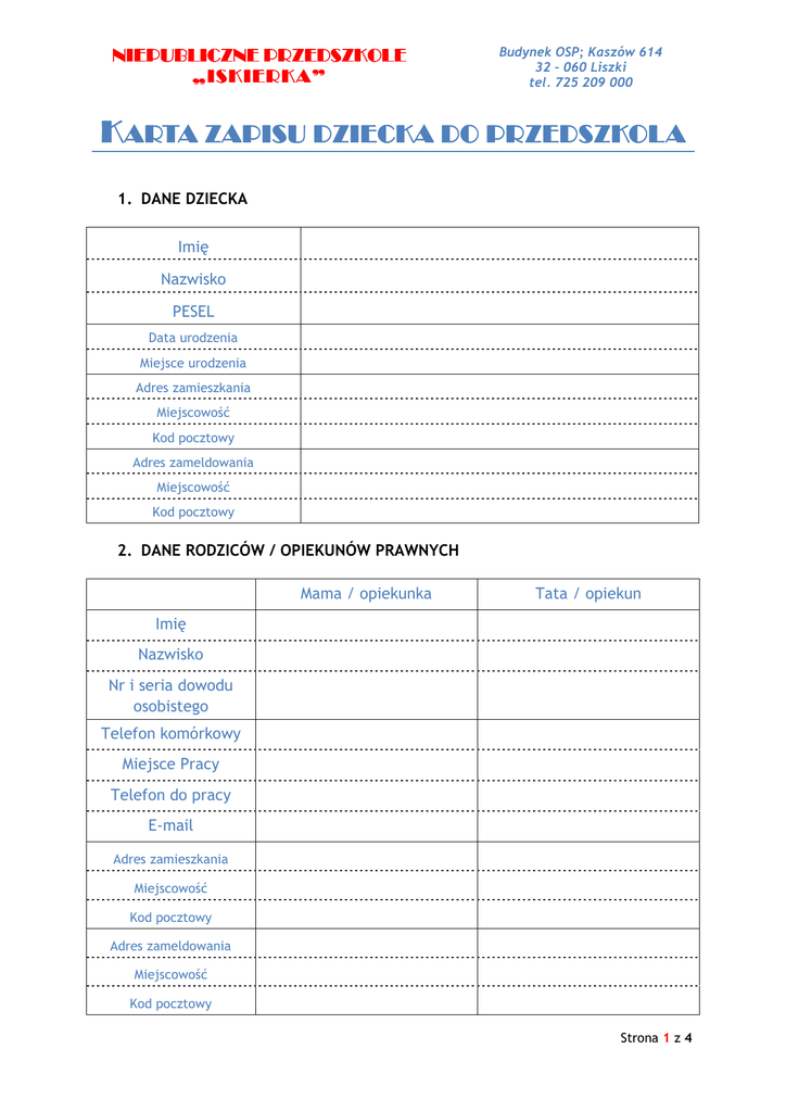 NIEPUBLICZNE PRZEDSZKOLE „ISKIERKA” Budynek OSP; Kaszów 614 32 – 060 Liszki tel. 725 209 000 KARTA ZAPISU DZIECKA DO PRZEDSZKOLA 1. DANE DZIECKA Imię Nazwisko PESEL Data urodzenia Miejsce urodzenia Adres zamieszkania Miejscowość Kod pocztowy Adres zameldowania Miejscowość Kod pocztowy 2. DANE RODZICÓW / OPIEKUNÓW PRAWNYCH Mama / opiekunka Tata / opiekun Imię Nazwisko Nr i seria dowodu osobistego Telefon komórkowy Miejsce Pracy Telefon do pracy E-mail Adres zamieszkania Miejscowość Kod pocztowy Adres zameldowania Miejscowość Kod pocztowy Strona 1 z 4 Budynek OSP; Kaszów 614 32 – 060 Liszki tel. 725 209 000 NIEPUBLICZNE PRZEDSZKOLE „ISKIERKA” 3. OSOBY UPOWAŻNIONE DO ODBIORU DZIECKA Z PRZEDSZKOLA Imię i Nazwisko Lp. Stopień pokrewieństwa Nr i seria dowodu osobistego 1. 2. 3. 4. 4. RODZEŃSTWO DZIECKA Lp. Imię i Nazwisko Wiek 1. 2. 3. 4. 5. 5. POBYT DZIECKA W PRZEDSZKOLU 5.1.Godziny pobytu dziecka w przedszkolu od . . . . . . . . do . . . . . . . .. 5.2.Czy dziecko pozostaje w stałym leczeniu? (jeśli tak, prosimy podać rodzaj dolegliwości i metody leczenia): ............................................................. . . . . . . . . . . . . . . . . . . . . . . . . . . . . . . . . . . . . . . . . . . . . . . . . . . . . . . . . . . . . .. 5.3.Przebyte choroby zakaźne oraz urazy lub kontuzje: ............................................................. . . . . . . . . . . . . . . . . . . . . . . . . . . . . . . . . . . . . . . . . . . . . . . . . . . . . . . . . . . . . .. 5.4.Czy istnieją pokarmy, na które dziecko jest uczulone? (jeśli tak, prosimy podać rodzaje lub nazwy produktów): ............................................................. . . . . . . . . . . . . . . . . . . . . . . . . . . . . . . . . . . . . . . . . . . . . . . . . . . . . . . . . . . . . .. 5.5.Czy istnieją sytuacje lub przedmioty, które wywołują u dziecka szczególne uczucie lęku? (jeśli tak, prosimy podać): ............................................................. . . . . . . . . . . . . . . . . . . . . . . . . . . . . . . . . . . . . . . . . . . . . . . . . . . . . . . . . . . . . .. Strona 2 z 4 Budynek OSP; Kaszów 614 32 – 060 Liszki tel. 725 209 000 NIEPUBLICZNE PRZEDSZKOLE „ISKIERKA” 5.6.W jaki sposób dziecko się najchętniej bawi? (prosimy wymienić typ zabawki lub rodzaj zabawy): ............................................................. . . . . . . . . . . . . . . . . . . . . . . . . . . . . . . . . . . . . . . . . . . . . . . . . . . . . . . . . . . . . .. 5.7.Prosimy zaznaczyć cechy najlepiej opisujące dziecko: spokojne wrażliwe łatwo zapamiętuje mówi niewyraźnie ma bujną wyobraźnię lubi nieład pogodne absorbujące ruchliwe jest otwarte bywa agresywne ma poczucie humoru lubi porządek sprytne jest płaczliwe łatwo ulega wpływom innych ma kłopoty z . . . . . . . . . . . . . . . . . . . . . . . . . . . . . . . . . . . . . . . . . . . . . . . . . . . . . . . . . . . . . . . . . . . . . . . . . . . . . . . . . . . . . . . . . . . . . . . . . . . . . . . . . . . . . . .. 5.8. Prosimy zaznaczyć umiejętności i zainteresowania dziecka: potrafi się ubrać tak / nie samodzielnie je posiłki samodzielnie korzysta z toalety tak / nie chętnie porządkuje zabawki tak / nie lubi towarzystwo innych tak / nie potrafi się dzielić tak / nie tak / nie ma konkretne zainteresowania (jakie?) : . . . . . . . . . . . . . . . . . . . . . . . . . . . . . . . . . . . . . . . . . . . . . . . . . . . . . . . . . . . . . . . . . . . . . . . . . . . . . . . . . . . . . . . . . . . . .. ma konkretne uzdolnienia (jakie?): . . . . . . . . . . . . . . . . . . . . . . . . . . . . . . . . . . . . . . . . . . . . . . . . . . . . . . . . . . . . . . . . . . . . . . . . . . . . . . . . . . . . . . . . . . . . . . . . .. 5.9. Informacje o dziecku skierowane do wychowawcy, nauczycieli zajęć dodatkowych (nawyki, zachowania, na które należy zwrócić szczególną uwagę, inne sugestie): . . . . . . . ............................................................. . . . . . . . . . . . . . . . . . . . . . . . . . . . . . . . . . . . . . . . . . . . . . . . . . . . . . . . . . . . .. 6. ZOBOWIĄZANIA RODZICÓW / OPIEKUNÓW PRAWNYCH: 1) Terminowego dokonywania wpłat za przedszkole. 2) Podawanie do wiadomości przedszkola zmian w podanych wyżej informacji. 3) Przyprowadzania i odbierania dziecka osobiście lub przez osobę dorosłą wskazaną do odbierania. 4) Przyprowadzanie do przedszkola tylko zdrowego dziecka. 5) Wyrażam zgodę na publikację zdjęć dziecka z imprez i uroczystości przedszkolnych na stronie internetowej promującej placówkę. 6) Oświadczam, że zapoznałem(-am) się ze statutem i regulaminem przedszkola. Strona 3 z 4 NIEPUBLICZNE PRZEDSZKOLE „ISKIERKA” Budynek OSP; Kaszów 614 32 – 060 Liszki tel. 725 209 000 1) Uprzedzony o odpowiedzialności karnej z art. 233 § 1 k.k. oświadczam, że dane przedstawione w karcie zapisu do przedszkola są prawdziwe. 2) Wyrażam zgodę na przetwarzanie danych osobowych zawartych w karcie do celów edukacyjnych, związanych z realizacją zadań statutowych przedszkola oraz przeprowadzoną rekrutacją przedszkola, zgodnie z ustawą z dnia 29 sierpnia 1997r. o ochronie danych osobowych (Dz. U. z 2002r. nr 101, poz. 926 z późn. zm.) oraz Rozporządzeniem MENiS z dnia 19 lutego 2002r. (Dz. U. z 2002r. poz. 225 z późn. zm.) 3) W razie potrzeby, zgadzamy się na przeprowadzenie wszelkich niezbędnych czynności, zabiegów lub hospitalizację dziecka w celu ratowania zdrowia lub życia. Podpisy (czytelne): ................ Mama / opiekunka prawna ................ Tata / opiekun prawny ZGODA RODZICÓW / OPIEKUNÓW PRAWNYCH NA UDZIAŁ DZIECKA W SPACERACH I WYCIECZKACH ORGANIZOWANYCH PRZEZ PRZEDSZKOLE POZA TEREN PRZEDSZKOLA Zezwalamy naszemu dziecku . . . . . . . . . . . . . . . . . . . . . . . . . . . . . . . . . . . na udział w wycieczkach i spacerach . Jednocześnie informujemy, że nie widzimy przeci