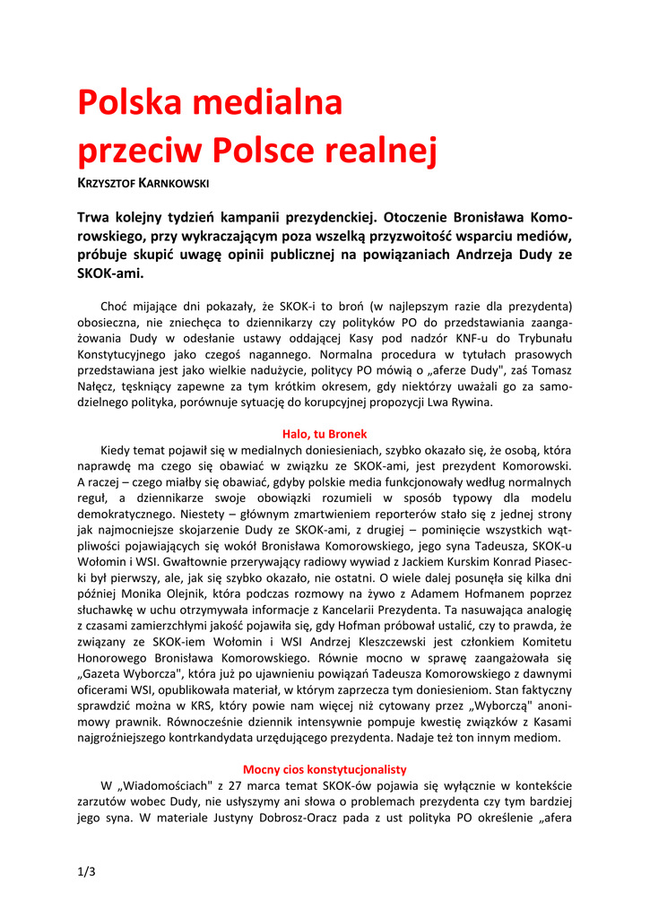 Polska medialna przeciw Polsce realnej KRZYSZTOF KARNKOWSKI Trwa kolejny tydzień kampanii prezydenckiej. Otoczenie Bronisława Komorowskiego, przy wykraczającym poza wszelką przyzwoitość wsparciu mediów, próbuje skupić uwagę opinii publicznej na powiązaniach Andrzeja Dudy ze SKOK-ami. Choć mijające dni pokazały, że SKOK-i to broń (w najlepszym razie dla prezydenta) obosieczna, nie zniechęca to dziennikarzy czy polityków PO do przedstawiania zaangażowania Dudy w odesłanie ustawy oddającej Kasy pod nadzór KNF-u do Trybunału Konstytucyjnego jako czegoś nagannego. Normalna procedura w tytułach prasowych przedstawiana jest jako wielkie nadużycie, politycy PO mówią o „aferze Dudy", zaś Tomasz Nałęcz, tęskniący zapewne za tym krótkim okresem, gdy niektórzy uważali go za samodzielnego polityka, porównuje sytuację do korupcyjnej propozycji Lwa Rywina. Halo, tu Bronek Kiedy temat pojawił się w medialnych doniesieniach, szybko okazało się, że osobą, która naprawdę ma czego się obawiać w związku ze SKOK-ami, jest prezydent Komorowski. A raczej – czego miałby się obawiać, gdyby polskie media funkcjonowały według normalnych reguł, a dziennikarze swoje obowiązki rozumieli w sposób typowy dla modelu demokratycznego. Niestety – głównym zmartwieniem reporterów stało się z jednej strony jak najmocniejsze skojarzenie Dudy ze SKOK-ami, z drugiej – pominięcie wszystkich wątpliwości pojawiających się wokół Bronisława Komorowskiego, jego syna Tadeusza, SKOK-u Wołomin i WSI. Gwałtownie przerywający radiowy wywiad z Jackiem Kurskim Konrad Piasecki był pierwszy, ale, jak się szybko okazało, nie ostatni. O wiele dalej posunęła się kilka dni później Monika Olejnik, która podczas rozmowy na żywo z Adamem Hofmanem poprzez słuchawkę w uchu otrzymywała informacje z Kancelarii Prezydenta. Ta nasuwająca analogię z czasami zamierzchłymi jakość pojawiła się, gdy Hofman próbował ustalić, czy to prawda, że związany ze SKOK-iem Wołomin i WSI Andrzej Kleszczewski jest członkiem Komitetu Honorowego Bronisława Komorowskiego. Równie mocno w sprawę zaangażowała się „Gazeta Wyborcza", która już po ujawnieniu powiązań Tadeusza Komorowskiego z dawnymi oficerami WSI, opublikowała materiał, w którym zaprzecza tym doniesieniom. Stan faktyczny sprawdzić można w KRS, który powie nam więcej niż cytowany przez „Wyborczą" anonimowy prawnik. Równocześnie dziennik intensywnie pompuje kwestię związków z Kasami najgroźniejszego kontrkandydata urzędującego prezydenta. Nadaje też ton innym mediom. Mocny cios konstytucjonalisty W „Wiadomościach" z 27 marca temat SKOK-ów pojawia się wyłącznie w kontekście zarzutów wobec Dudy, nie usłyszymy ani słowa o problemach prezydenta czy tym bardziej jego syna. W materiale Justyny Dobrosz-Oracz pada z ust polityka PO określenie „afera 1/3 Dudy". Widzowie mogą też zobaczyć dość interesujący błąd przygotowujących materiał. Dariusz Joński z SLD, mówiący o Andrzeju Dudzie jako „listonoszu Biereckiego", podpisany zostaje jako „Marcin Mastalerek, rzecznik PiS". Nieszczęśliwa pomyłka czy próba wywołania w widzu wrażenia, że nawet macierzysta partia nie do końca ufa swojemu kandydatowi? Chwilę później w audycji „Minęła 20" dziennikarz, powołując się na publikację „Wyborczej", pyta, czy „zaangażowanie Andrzeja Dudy w SKOK-i powinno spowodować, by zawiesił swoją kampanię i członkostwo w PiS-ie oraz zrezygnował z wyścigu prezydenckiego?". Pytaniu towarzyszy pasek z tytułem „Cień SKOK--ów nad Andrzejem Dudą?". Plan się sypie, gdy konstytucjonalista Ryszard Piotrowski zauważa, że nie doszło do niczego niewłaściwego. „Zarzut, że rozmowy się odbywały w Kancelarii Prezydenta jest całkowicie nietrafny. To lepiej niż w restauracji czy na cmentarzu" – mówi, gdy prowadzący wspomina o rozmowach, jakie przed prezydenckim wetem miał prowadzić z Dudą Grzegorz Bierecki. Drugi z gości, Ryszard Kalisz, choć nie może, oczywiście, wprost bronić Andrzeja Dudy, de facto potwierdza słowa Piotrowskiego. Przez kolejne dwa dni audycja jest szeroko komentowana przez internautów, którzy rozsyłają sobie link do nagrania. Warto spojrzeć na sposoby dezinformowania opinii publicznej w sprawie SKOK-ów: traktowanie wszystkich Kas jako jedności, a także celowe mieszanie zdjęć i informacji z czasów, gdy problematyczny Wołomin podlegał jeszcze kontroli Grzegorza Biereckiego i okresu, gdy znalazł się pod nadzorem KNF-u. To wtedy zaczęto wyprowadzać pieniądze, doszło do napadu na wiceszefa komisji, zaś imprezy odbywały się już wyłącznie z udziałem ludzi władzy. Nadużycia i przestępstwa, do jakich doszło w czasie, gdy Bierecki nie miał już żadnego wpływu na działanie wołomińskiej Kasy, mają najwyraźniej iść na jego konto. Równolegle przeciwstawia się mu nadzór finansowy, którego powołaniu to politycy PO, nie PiS-u byli przeciwni. Pojawia się wreszcie fałszywa troska o to, że zwykli ciułacze stracą swoje oszczędności, podczas gdy pieniądze zostały już zwrócone. Tego wszystkiego jednak mało jest Tomaszowi Lisowi, który karze swoim grafikom pastwić się nad Dudą, sam zaś narzeka, że po ujawnieniu sprawy SKOK-ów powinien on już być „domordowywany". Odważne słowa w kraju Ryszarda C. Granie Smoleńskiem W kampanię wyborczą postanowiła włączyć się również Naczelna Prokuratura Wojskowa. Przekazanie opinii publicznej kolejnej porcji ustaleń smoleńskiego śledztwa można uznać za zupełnie naturalne, gdy zbliża się kolejna rocznica 10 kwietnia. Jednak powrót do wersji zbliżonej do raportu Millera, kładącej nacisk na winę polskich pilotów, wreszcie – sugerowanie obecności w kabinie generała Błasika, bez przedstawienia jakichkolwiek dowodów, pozwala uznać aktywność NPW za próbę przemeblowania kampanii wyborczej. Powtarzanie starych tez służy