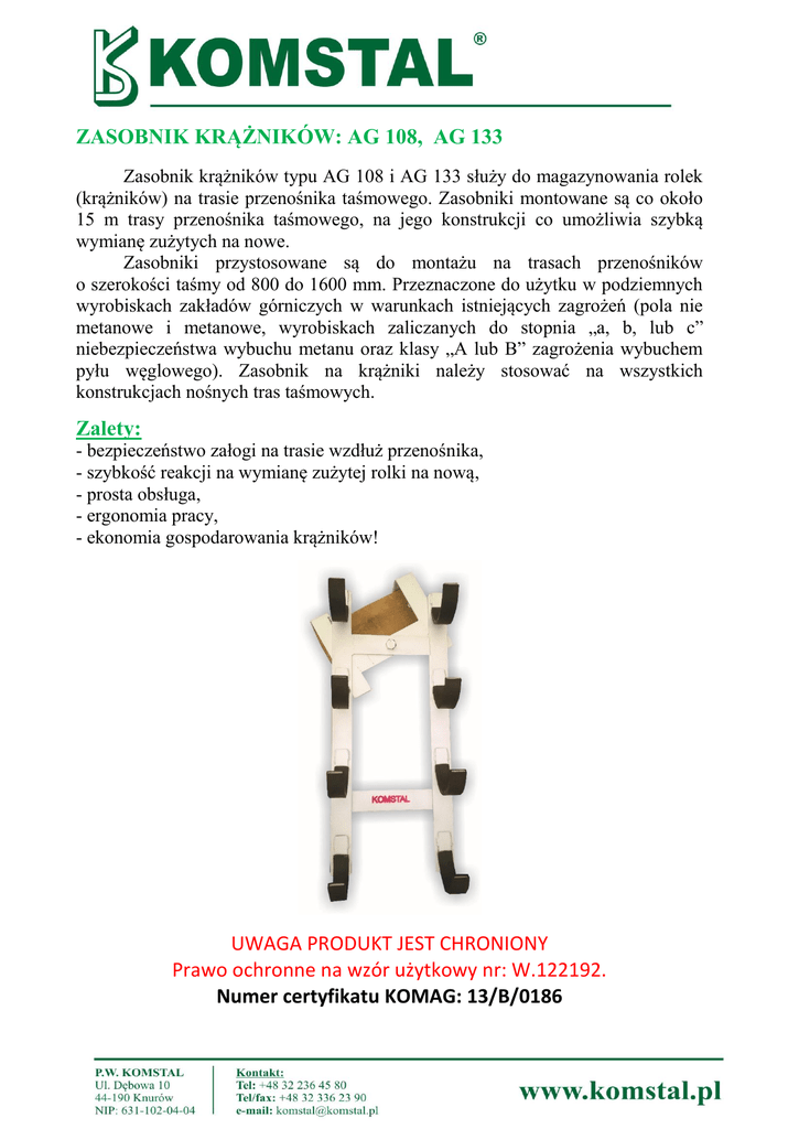 ZASOBNIK KRĄŻNIKÓW: AG 108, AG 133 Zasobnik krążników typu AG 108 i AG 133 służy do magazynowania rolek (krążników) na trasie przenośnika taśmowego. Zasobniki montowane są co około 15 m trasy przenośnika taśmowego, na jego konstrukcji co umożliwia szybką wymianę zużytych na nowe. Zasobniki przystosowane są do montażu na trasach przenośników o szerokości taśmy od 800 do 1600 mm. Przeznaczone do użytku w podziemnych wyrobiskach zakładów górniczych w warunkach istniejących zagrożeń (pola nie metanowe i metanowe, wyrobiskach zaliczanych do stopnia „a, b, lub c” niebezpieczeństwa wybuchu metanu oraz klasy „A lub B” zagrożenia wybuchem pyłu węglowego). Zasobnik na krążniki należy stosować na wszystkich konstrukcjach nośnych tras taśmowych. Zalety: - bezpieczeństwo załogi na trasie wzdłuż przenośnika, - szybkość reakcji na wymianę zużytej rolki na nową, - prosta obsługa, - ergonomia pracy, - ekonomia gospodarowania krążników! UWAGA PRODUKT JEST CHRONIONY Prawo ochronne na wzór użytkowy nr: W.122192. Numer certyfikatu KOMAG: 13/B/0186