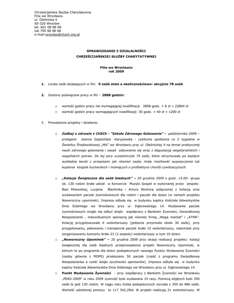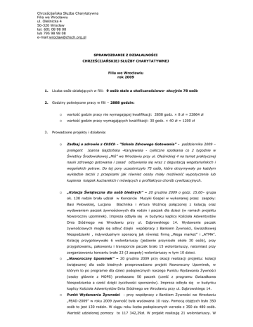 Chrześcijańska Służba Charytatywna Filia we Wrocławiu ul. Oleśnicka 4 50-320 Wrocław tel. 601 08 98 08 lub 795 98 98 08 e-mail:[email protected] SPRAWOZDANIE Z DZIAŁALNOŚCI CHRZEŚCIJAŃSKIEJ SŁUŻBY CHARYTATYWNEJ Filia we Wrocławiu rok 2009 1. Liczba osób działających w filii: 9 osób stale a okolicznościowo- akcyjnie 78 osób 2. Godziny poświęcone pracy w filii – 2888 godzin: o o 3. wartość godzin pracy nie wymagającej kwalifikacji: 2858 godz. × 8 zł = 22864 zł wartość godzin pracy wymagających kwalifikacji: 30 godz. × 40 zł = 1200 zł Prowadzone projekty i działania: o Zadbaj o zdrowie z ChSCh - "Szkoła Zdrowego Gotowania" - października 2009 – prelegent Joanna Gajdzińska -Karyjewska - cykliczne spotkania co 2 tygodnie w Świetlicy Środowiskowej „Miś” we Wrocławiu przy ul. Oleśnickiej 4 na temat praktycznej nauki zdrowego gotowania i zasad odżywiania się wraz z degustacją wegetariańskich i wegańskich potraw. Do tej pory uczestniczyło 75 osób, które otrzymywały po każdym wykładzie teczki z przepisami jak również osoby miały możliwość wypożyczenia lub kupienia książek kucharskich i mówiących o profilaktyce chorób cywilizacyjnych. o „Kolacja Świąteczna dla osób biednych” – 20 grudnia 2009 o godz. 15.00– grupa ok. 130 rodzin brała udział w Koncercie Muzyki Gospel w wykonanej przez zespoły: Basi Pelowskiej, Lucjana Blachnika i Artura Woźnicę połączonej z kolacją oraz wydawaniem paczek żywnościowych dla rodzin i paczek dla dzieci (w ramach projektu Noworoczny upominek). Impreza odbyła się w budynku kaplicy Kościoła Adwentystów Dnia Siódmego we Wrocławiu przy ul. Dąbrowskiego 14. Wydawanie paczek żywnościowych mogło się odbyć dzięki współpracy z Bankiem Żywności, Gwiazdkowej Niespodzianki , indywidualnym sponsorą jak również firmą „Wega market” i „ATMA”. Kolację przygotowywało 6 wolontariuszy (jedzenie przyniosło około 30 osób), przy przygotowaniu, pakowaniu i transporcie paczek brało 15 wolontariuszy, natomiast przy zorganizowaniu koncertu brało 23 (3 zespoły) wolontariuszy w tym 10 dzieci. o „Noworoczny Upominek” – 20 grudnia 2009 przy okazji realizacji projektu: kolacji świątecznej dla osób biednych przeprowadzono projekt Noworoczny Upominek, w którym to po programie dla dzieci podopiecznych naszego Punktu Wydawania Żywności (osoby głównie z MOPS) przekazano 50 paczek (cześć z programu Gwiazdkowa Niespodzianka a cześć dzięki życzliwości sponsorów). Impreza odbyła się w budynku kaplicy Kościoła Adwentystów Dnia Siódmego we Wrocławiu przy ul. Dąbrowskiego 14. o Punkt Wydawania Żywności - przy współpracy z Bankiem Żywności we Wrocławiu „PEAD-2009” w roku 2009 żywność była wydawana 10 razy. Pomocą objętych było 350 osób to jest 130 rodzin. W ciągu roku liczba podopiecznych wzrosła z 350 do 480 osób. Wartość udzielonej pomocy to 117 342,29zł. W projekt realizuję 21 wolontariuszy. W ramach tego projektu wolontariusze ChSCh wzięli udział w dwóch zbiórkach żywności – wrześniowa „Podziel się posiłkiem” (zebrano 679,90 kg) oraz grudniowa (zebrano 714 kg żywności). Dzięki tym zbiórką pomoc żywnościową uzyskało 150 rodzin objętych opieką ChSCh i 23 dzieci uczęszczających do naszej Świetlicy Środowiskowej „MIŚ”. W akcjach brało udział 78 wolontariuszy. o Punkt Wydawania Odzieży - przy ul. Oleśnickiej 4 przekazywano naszym podopiecznym odzież przekazywana głównie z ChSCh jak również od osób prywatnych i firm z terenu Wrocławia. Z pomocy punktu korzysta około 480 osób – 150 rodzin w tym kilku bezdomnych. Wartość udzielonej pomocy 36 641,5 zł o Świetlica Środowiskowa „MIŚ” - od marca do czerwca na zasadzie wolontariatu od lipca do grudnia uzyskano dofinansowanie z Urzędu Miasta wysokości 14 659,88 zł. Całkowity koszt projektu to 34 584,77 zł. o Pomoc indywidualna - zakup leków i kosztów rehabilitacji :2531,83. zakup opału na zimę 3697,8, zapłata zaległych rachunków 1081,41 oraz pomoc w zapłacie kaucji mieszkaniowej 960,00 zł. Całkowity koszt projektu to 8456,04 zł. Jedną z naszych podopiecznych jest Pani Edyta Terka która od 5 lat jest w stanie śpiączki. Matka walczy o odszkodowanie i przyznanie renty na potrzeby leczenia córki. Sytuacja rodziny jest tragiczna. 4. Udzielono wsparcia innym organizacją: brak 5. Sponsorzy: „Wega market” sponsor kosztów prawie całego transportu, „ATMA” przekazanie zabawek dla dzieci na paczki w kwocie 486zł, Kościół Adwentystów Dnia Siódmego we Wrocławiu (Kościół Adwentystów D.S. Wrocław) oraz osoby prywatne Część finansowa Liczba osób Lp. Rodzaj udzielonej pomocy objętych Liczba pomocą I Wartość w PLN Źródła finansowania Zadbaj o zdrowie z ChSCh - "Szkoła Zdrowego Gotowania" października-grudnia 2009 rok 1 Praca wolontarystyczna 2 wynajęcie pomieszczenia 3 Prelegenci 4 Plakaty 5 Materiały szkoleniowe- przepisy 6 potrawy na degustację 7 telefony 4 x 5h * 8 zł x 5 spotkań 800 Wolontariusze 4 h* 20 zł x 5 spotkań 400 Bezpłatne użyczenie 3 h * 2 dni m-c * 40 zł x 5 sp. 1 200,00 zł Wolontariusze 30 szt x 1,50 zł 45 Fundacja Źródła Życia 20 szt x 0,50 zł x5 50 Sponsor 80złx 5 spotkań 400 Wolontariusze 0 50 Wolontariusze 75 osób 8 Wartość projektu II 2945 „Noworoczny upominek” - 20 grudnia 2009 1 Praca wolontarystyczna 32 h *8 zł 256 Wolontariusze 7 Paczki Gwiazdkowa Niespodzianka 40szt x 150żł 6000 „Gwiazdkowa Niespodzianka” 8 Paczki Gwiazdkowa Niespodzianka 10 szt x 150zł 1500 CHSCH 9 Paczki dla dzieci 15 szt x 50 zł 750,00 zł Prywatni sponsorzy 300szt 102,00 zł sponsor 11 reklamówki 80 dzieci 12 Wartość projektu II 8608 „Kolacja Świąteczna dla osób biednych” 20 grudnia 2009 1 Praca wolontarystyczna 78 wol. 77 h *8 zł + 25 osób * 3 h * 40 zł 3616 2 wynajęcie pomieszczenia 0 15h * 50 zł 750 3 Naczynia jednorazowe na 160 osób 150 4 pot