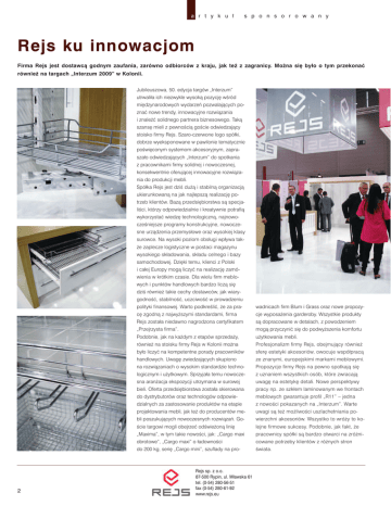 a r t y k u ∏ s p o n s o r o w a n y Rejs ku innowacjom Firma Rejs jest dostawcà godnym zaufania, zarówno odbiorców z kraju, jak te˝ z zagranicy. Mo˝na si´ było o tym przekonaç równie˝ na targach „Interzum 2009” w Kolonii. Jubileuszowa, 50. edycja targów „Interzum” utrwaliła ich niezwykle wysokà pozycj´ wÊród mi´dzynarodowych wydarzeƒ pozwalajàcych poznaç nowe trendy, innowacyjne rozwiàzania i znaleêç solidnego partnera biznesowego. Takà szans´ mieli z pewnoÊcià goÊcie odwiedzajàcy stoisko firmy Rejs. Szaro-czerwone logo spółki, dobrze wyeksponowane w pawilonie tematycznie poÊwi´conym systemom akcesoryjnym, zapraszało odwiedzajàcych „Interzum” do spotkania z pracownikami firmy solidnej i nowoczesnej, konsekwentnie oferujàcej innowacyjne rozwiàzania do produkcji mebli. Spółka Rejs jest dziÊ du˝à i stabilnà organizacjà ukierunkowanà na jak najlepszà realizacj´ potrzeb klientów. Bazà przedsi´biorstwa sà specjaliÊci, którzy odpowiedzialnie i kreatywnie potrafià wykorzystaç wiedz´ technologicznà, najnowoczeÊniejsze programy konstrukcyjne, nowoczesne urzàdzenia przemysłowe oraz wysokiej klasy surowce. Na wysoki poziom obsługi wpływa tak˝e zaplecze logistyczne w postaci magazynu wysokiego składowania, składu celnego i bazy samochodowej. Dzi´ki temu, klienci z Polski i całej Europy mogà liczyç na realizacj´ zamówienia w krótkim czasie. Dla wielu firm meblowych i punktów handlowych bardzo liczà si´ dziÊ równie˝ takie cechy dostawców, jak wiarygodnoÊç, stabilnoÊç, uczciwoÊç w prowadzeniu 2 polityki finansowej. Warto podkreÊliç, ˝e za pra- wadnicach firm Blum i Grass oraz nowe propozy- c´ zgodnà z najwy˝szymi standardami, firma cje wyposa˝enia garderoby. Wszystkie produkty Rejs została niedawno nagrodzona certyfikatem sà dopracowane w detalach, z powodzeniem „Przejrzysta firma”. mogà przyczyniç si´ do podwy˝szenia komfortu Podobnie, jak na ka˝dym z etapów sprzeda˝y, u˝ytkowania mebli. równie˝ na stoisku firmy Rejs w Kolonii mo˝na Profesjonalizm firmy Rejs, obejmujàcy równie˝ było liczyç na kompetentne porady pracowników sfer´ estetyki akcesoriów, owocuje współpracà handlowych. Uwag´ zwiedzajàcych skupiono ze znanymi, europejskimi markami meblowymi. na rozwiàzaniach o wysokim standardzie techno- Propozycje firmy Rejs na pewno spotkajà si´ logicznym i u˝ytkowym. Sprzyjała temu nowocze- z uznaniem wszystkich osób, które zwracajà sna aran˝acja ekspozycji utrzymana w surowej uwag´ na estetyk´ detali. Nowe perspektywy bieli. Oferta przedsi´biorstwa została skierowana pracy np. ze szkłem laminowanym we frontach do dystrybutorów oraz technologów odpowie- meblowych gwarantuje profil „R11” – jedna dzialnych za zastosowanie produktów na etapie z nowoÊci pokazanych na „Interzum”. Warte projektowania mebli, jak te˝ do producentów me- uwagi sà te˝ mo˝liwoÊci uszlachetniania po- bli poszukujàcych nowoczesnych rozwiàzaƒ. Go- wierzchni akcesoriów. Wszystko to wró˝y to ko- Êcie targowi mogli obejrzeç odÊwie˝onà lini´ lejne firmowe sukcesy. Podobnie, jak fakt, ˝e „Maxima”, w tym takie nowoÊci, jak: „Cargo maxi pracownicy spółki sà bardzo otwarci na zró˝ni- obrotowe”, „Cargo maxi” o ładownoÊci cowane potrzeby klientów z ró˝nych stron do 200 kg, seri´ „Cargo mini”, szuflady na pro- Êwiata. Rejs sp. z o.o. 87-500 Rypin, ul. Mławska 61 tel. (0-54) 280-56-51 fax (0-54) 280-61-92 www.rejs.eu