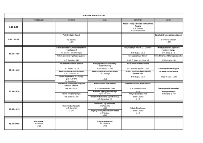 KURSY MONOGRAFICZNE PONIEDZIAŁEK WTOREK ŚRODA PIĄTEK Kobiety i obrazy kobiecości w Chinach i na Tajwanie dr A. Zemanek s. 0.25 od 6 listopada 8:00-9:30 9:45 - 11:15 Praktyki religijne Japonii Obraz kobiety we współczesnej Japonii dr D. Barańska s. 048 dr J. Wolska-Lenarczyk s. 048 Kultura popularna w Chinach nowożytnych i współczesnych 11.30-13.00 Nacjonalizmy w Iranie w XX i XXI wieku dr A. Zemanek s. 049 od 18 listopada dr M. Rzepka - s. 0.48 dr P. Dybała- s. 146 Ewolucja doktryny dzihadu Birma. Historia, polityka i społeczeństwo dr hab. P. Siwiec, prof. UJ - s. 146 dr M. Lubina - s. 0.48 dr D. Barańska s. 0.48 13.15-14.45 Ruchy reformatorskie w Islamie dr D. Rudnicka - Kassem - s.0.25 Lokalna i globalna polityka Islamskiej Republiki Iranu Konflikty kulturowe i religijne dr M. Rzepka - s. 0.48 dr hab. M. Kurcz - s. 048 dr I. Balwierz - s. 129 dr R. Czekalska - S. 146 Współczesne społeczeństwo chińskie - dr J. Wardęga Chińska myśl narodowa - dr J. Wardęga godz. 13.45-15.15 IK - Radziwiłłowska 4 s. 0.48 we współczesnym Sudanie Współczesne koncepcje socjologiczne w świecie arabskim Muslim Societes in the Western Kurdowie - historia i współczesność dr K. Rak - s. 0.48 dr D. Rudnicka-Kassem s. 049 dr R. Kurpiewska-Korbut Półwysep Koreański w stosunkach Kulturowe aspekty j.koreańskiego międzynarodowych dr M. Lubina - s. 0.48 Tajwan - historia i polityka mgr G. Kim s 048 s. 025 Polityka zagraniczna Chin dr B. Zemanek s. 129 Dynastie muzułmańskie Azji Południowej dr R. Czekalska s. 129 dr hab. Ł. Gacek s. 146 Piśmiennictwo hebrajskie dr D. Starzyński s. 049 Film Izraelski dr P. Weiser s. 129 Funkcja przekładu w komunikacji międzykulturowej Współczesne społeczeństwo Japonii - dr J. Guzik - s. 0.49 15.00-16.30 16.45-18.15 Metody tłumaczenia japońskich komiksów manga Kultura popularna współczesnej Japonii Reklama i PR w świecie arabskim 18.30-20.00 CZWARTEK Sztuka Indii i Azji Południowej dr R. Czekalska s. 025 Instytucje kultury na Dalekim Wschodzie dr J. Wardęga s.0 49 Tradycje religijne Indii dr K. Jakubczak s. 049 Relacje Chiny Europa dr hab. Ł. Gacek s. 146