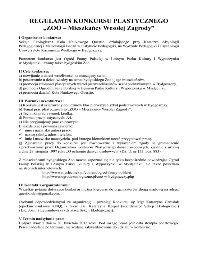 REGULAMIN KONKURSU PLASTYCZNEGO „ZOO – Mieszkańcy Wesołej Zagrody” I Organizator konkursu: Sekcja Ekologiczna Koła Naukowego Questio, działającego przy Katedrze Aksjologii Pedagogicznej i Metodologii Badań w Instytucie Pedagogiki, na Wydziale Pedagogiki i Psychologii Uniwersytetu Kazimierza Wielkiego w Bydgoszczy. Partnerem konkursu jest Ogród Fauny Polskiej w Leśnym Parku Kultury i Wypoczynku w Myślęcinku, zwany także bydgoskim Zoo. II Cele konkursu: a) rozwijanie u dzieci wrażliwości na otaczający świat, b) poszerzanie u dzieci wiedzy na temat bydgoskiego Zoo i jego mieszkańców, c) promocja zdolności plastycznych wśród pierwszoklasistów szkół podstawowych w Bydgoszczy, d) promocja Ogrodu Fauny Polskiej w Leśnym Parku Kultury i Wypoczynku w Myślęcinku, e) promocja działań Koła Naukowego Questio. III Warunki uczestnictwa: a) Konkurs jest skierowany do uczniów klas pierwszych szkół podstawowych w Bydgoszczy. b) Temat prac plastycznych to „ZOO – Mieszkańcy Wesołej Zagrody”. c) Technika prac: rysunek kredką. d) Format prac plastycznych: A4. e) Nie przyjmujemy prac zbiorowych. f) Każda praca powinna zawierać: imię i nazwisko autora pracy, nazwę szkoły, adres i telefon, imię i nazwisko nauczyciela, pod którego kierunkiem uczeń przygotował pracę. g) Zgłoszenie pracy do konkursu jest równoważne z wyrażeniem zgody na gromadzenie i przetwarzanie przez Organizatora Konkursu Plastycznego danych osobowych, zgodnie z ustawą z dnia 29. sierpnia 1997 roku „O ochronie danych osobowych” (Dz. U. nr 133, poz. 883). Z mieszkańcami bydgoskiego Zoo można zapoznać się nie tylko bezpośrednio odwiedzając Ogród Fauny Polskiej w Leśnym Parku Kultury i Wypoczynku w Myślęcinku, ale także pośrednio na stronach internetowych: http://www.myslecinek.pl/content/ogrod-fauny-polskiej http://www.ogrodyzoologiczne.pl/zoo-w-bydgoszczy.php IV Kontakt z organizatorami: Wszelkie pytania dotyczące konkursu można kierować do organizatorów drogą mailową na adres: [email protected]. Osobami odpowiedzialnymi za organizację i przebieg Konkursu są: Mgr Katarzyna Grzesiak (opiekun naukowy KNQ), a także Lic. Katarzyna Korpal (koordynator Sekcji Ekologicznej) i Lic. Joanna Lewandowska (działacz Sekcji Ekologicznej). V Termin nadsyłania prac: Upływa wraz z dniem 30. kwietnia 2013 roku. Pod uwagę brana jest data stempla pocztowego. Prace nadesłane po terminie, nie zostaną zakwalifikowane do udziału w konkursie. VI Prace prosimy nadsyłać pocztą tradycyjną na adres: Uniwersytet Kazimierza Wielkiego Katedra Aksjologii Pedagogicznej i Metodologii Badań Koło Naukowe Questio ul. Chodkiewicza 30, 85-064 Bydgoszcz z dopiskiem „KONKURS ZOO” VII Jury konkursu: W skład jury wchodzą przedstawiciele Koła Naukowego Questio oraz bydgoskiego ZOO. VIII Wyniki konkursu: Zostaną zamieszczone na stronie Organizatora konkursu: www.questio.ukw.edu.pl, do dnia 15. maja 2013 roku. Finał konkursu będzie miał miejsce 24. maja 2013 roku podczas Bydgoskiego Festiwalu Nauki w Ogrodzie Fauny Polskiej w Leśnym Parku Kultury i Wypoczynku w Myślęcinku, gdzie uroczyście zostaną ogłoszone wyniki oraz wręczone nagrody. Wydarzeniu będzie towarzyszyła wystawa nadesłanych na konkurs prac. UWAGA! Każde dziecko – Uczestnik, w dniu finału konkursu tj. 24. maja 2013 roku, ma zapewnione darmowe wejście na teren bydgoskiego Zoo. Pozostałe osoby – dzieci niebiorące udziału w konkursie, rodzice, opiekunowie i wychowawcy – obowiązuje wejście odpłatne zgodnie z aktualnym cennikiem dla odwiedzających Zoo. IX Nagrody: Organizator gwarantuje dyplomy uczestnictwa wszystkim dzieciom, biorącym udział w konkursie oraz wystawienie prac w bydgoskim ZOO przez okres 30 dni, licząc od dnia finału konkursu. Dla laureatów konkursu Organizator przewiduje nagrody rzeczowe w postaci artykułów szkolnych, zabawek oraz książek. Fundatorem nagród jest Uniwersytet Kazimierza Wielkiego w Bydgoszczy, Wydawnictwo UKW oraz Ogród Fauny Polskiej w Leśnym Parku Kultury i Wypoczynku w Myślęcinku. Organizator informuje, iż z przyczyn obiektywnych może nastąpić zmiana nagród, jak i ich fundatorów, na przykład poprzez rozszerzenie grupy sponsorów. X Postanowienia końcowe: a) Każde dziecko – Uczestnik może zgłosić na konkurs tylko jedną pracę. b) Prace niezgodne z regulaminem nie będą brały udziału w konkursie. c) Udział w konkursie jest jednoznaczny z udzieleniem prawa Organizatorowi do wystawienia prac plastycznych w bydgoskim Zoo przez miesiąc, licząc od dnia finału konkursu. Po zakończeniu wystawy, prace zostaną przeniesione do siedziby KNQ, skąd dzieci – autorzy prac będą mogą je odebrać do 10. lipca 2013 roku. Po upływie tego terminu nieodebrane prace przechodzą nieodpłatnie na własność KNQ, które to od 11. lipca 2013 roku stanie się ich pełnoprawnym dysponentem. d) Szkoły zostaną powiadomione pisemnie lub telefonicznie o wygranej ucznia. Informacja ta będzie także umieszczona na stronie internetowej Organizatorów. e) Udział w konkursie oznacza zgodę na dostosowanie się do wszystkich zasad konkursu.