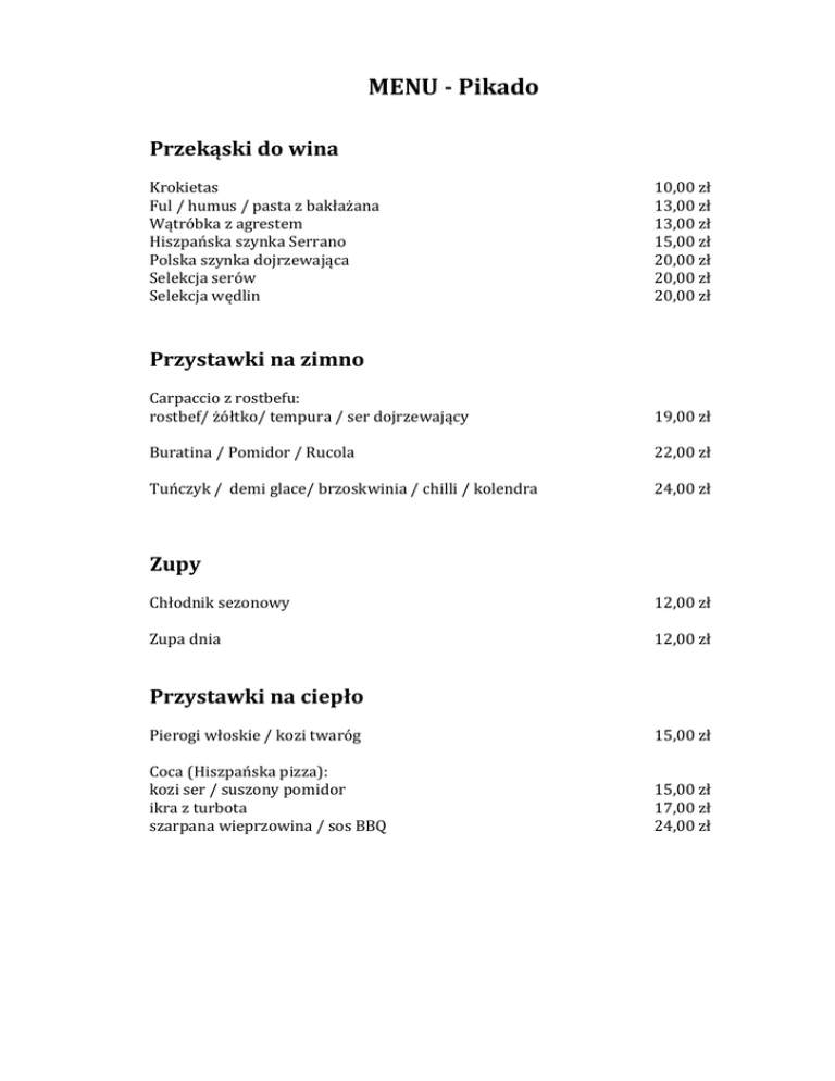 MENU - Pikado Przekąski do wina Krokietas Ful / humus / pasta z bakłażana Wątróbka z agrestem Hiszpańska szynka Serrano Polska szynka dojrzewająca Selekcja serów Selekcja wędlin 10,00 zł 13,00 zł 13,00 zł 15,00 zł 20,00 zł 20,00 zł 20,00 zł Przystawki na zimno Carpaccio z rostbefu: rostbef/ żółtko/ tempura / ser dojrzewający 19,00 zł Buratina / Pomidor / Rucola 22,00 zł Tuńczyk / demi glace/ brzoskwinia / chilli / kolendra 24,00 zł Zupy Chłodnik sezonowy 12,00 zł Zupa dnia 12,00 zł Przystawki na ciepło Pierogi włoskie / kozi twaróg 15,00 zł Coca (Hiszpańska pizza): kozi ser / suszony pomidor ikra z turbota szarpana wieprzowina / sos BBQ 15,00 zł 17,00 zł 24,00 zł Dania główne Risotto pięć grzybów / ser dojrzewający 24,00 zł Pierś z kaczki polenta / szpinak / agrest / czereśnia 35,00 zł Ryba dnia: zapytaj obsługę 35,00 zł Steki Antrykot sezonowany, cena za 100 g 18,00 zł Rostbef sezonowany, cena za 100 g 19,00 zł Polędwica sezonowana, cena za 100 g 27,00 zł Dodatki do steków w cenie Desery Beza z owocami 12,00 zł Selekcja lodów i sorbetów 14,00 zł Tort czekoladowy 16,00 zł MENU DEGUSTACYJNE Zestaw „S” Trzy dania plus deser 60,00 zł Zestaw „M” Cztery dania plus deser 80,00 zł Zestaw „L” Pięć dań plus deser 100,00 zł Zestaw „XL” Sześć dań plus deser 120,00 zł Razem z sommelierem wybierzcie wina naszej karty pasujące do Ciebie i do dań.
