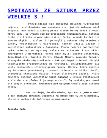 SPOTKANIE ZE WIELKIE S ! SZTUKĄ PRZEZ Przyglądając się obrazowi malarza tworzącego pejzaże, wielokrotnie zastanawiamy się, jakich kolorów użył artysta, aby oddać widzianą przez siebie barwę nieba i wody. Wbrew temu, co wydaje się najprostszymi rozwiązaniami, malując niebo nie trzeba używać niebieskiej farby, a woda to też nie zawsze błękit i zieleń. O tym mogli przekonać się uczniowie Szkoły Podstawowej w Wierzbnie, którzy wzięli udział w warsztatach malarskich w Poznaniu. Praca twórcza poprzedzona była zwiedzaniem wystawy malarstwa artystów francuskich tworzących w Normandii. Wśród nich byli: Eugene Delacroix, Jean-Baptiste, Camille Corot, Claude Monet, Auguste Renoir. Niezwykłe stało się spotkanie z tak wybitnymi dziełami. Dzięki wspaniałemu przewodnikowi po wystawie, dowiedzieliśmy się wielu ciekawych i interesujących rzeczy. Obrazy, które obecnie są bezcenne powstawały czasami zaledwie w kilka chwil, stanowiły skończone dzieło. Prace plastyczne dzieci, które powstały podczas warsztatów można oglądać w Szkole Podstawowej w Wierzbnie w „Galerii jednego obrazu”. Są zaskakujące nawet dla samych artystów. Tworzenie pod wpływem chwili daje ciekawe efekty. Mam nadzieję, że dla wielu, spotkanie „oko w oko” z tak znanymi obrazami zapadnie na długo nie tylko w pamięci, ale może zachęci do twórczego poszukiwania. Jolanta Hała