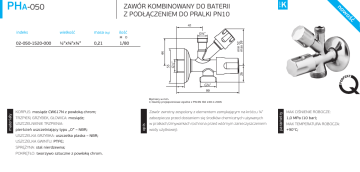 grupa ZAWÓR KOMBINOWANY DO BATERII Z PODŁĄCZENIEM DO PRALKI PN10 K oś w no PHA-050 ć 41 wielkość masa (kg) ilość M ½”x⅜”x¾” 0,21 1/80 26 55 G½” 44 02-050-1520-000 G3⁄8” D min 52 max 59 indeks G¾” 99 Zawór zwrotny zespolony z elementem zamykającym na króćcu ¾” TRZPIEŃ, GRZYBEK, GŁOWICA: mosiądz; zabezpiecza przed dostaniem się środków chemicznych używanych USZCZELNIENIE TRZPIENIA: w pralkach/zmywarkach (ochrona przed wtórnym zanieczyszczeniem pierścień uszczelniający typu „O” – NBR; USZCZELKA GRZYBKA: uszczelka plaska – NBR; USZCZELKA GWINTU: PTFE; SPRĘŻYNA: stal nierdzewna; POKRĘTŁO: tworzywo sztuczne z powłoką chrom. wody użytkowej). parametry KORPUS: mosiądz CW617N z powłoką chrom; opis materiały Wymiary w mm. 1) Gwinty przyłączeniowe zgodne z PN-EN ISO 228-1:2005 MAX CIŚNIENIE ROBOCZE: 1,0 MPa (10 bar); MAX TEMPERATURA ROBOCZA: +90°C;