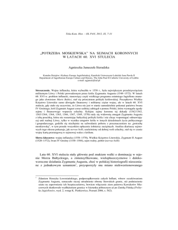 Teka Kom. Hist. – OL PAN, 2012, IX, 7-31 „POTRZEBA MOSKIEWSKA” NA SEJMACH KORONNYCH W LATACH 60. XVI STULECIA Agnieszka Januszek-Sieradzka Katedra Dziejów i Kultury Europy Jagiellońskiej, Katolicki Uniwersytet Lubelski Jana Pawła II Department of Jagiellonian Europe Culture and History, The John Paul II Catholic University of Lublin e-mail: [email protected] Streszczenie. Wojna inflancka, która wybuchła w 1558 r., była największym przedsięwzięciem militarnym Litwy i Polski prowadzonym przez króla Zygmunta Augusta (1548–1572). W latach 60. XVI w. problem inflancki, stanowiący część wielkiego programu ostatniego Jagiellona znanego jako dominium Maris Baltici, stał się priorytetem polityki królewskiej. Początkowo Wielkie Księstwo Litewskie samo dźwigało finansowy i militarny ciężar wojny, ale w latach 60. XVI stulecia, gdy stało się oczywiste, że Litwa nie jest w stanie samodzielnie pokonać państwa Iwana IV Groźnego, król Zygmunt August coraz usilniej zabiegał o pomoc Polski, która wymagała zgody sejmu i finansowego wsparcia szlachty. Kolejne sejmy koronne tej dekady (1562/1563, 1563/1564, 1564, 1565, 1566, 1567, 1569, 1570) stały się widownią zmagań Zygmunta Augusta z izbą poselską, która nie rozumiejąc bałtyckiej polityki króla i nie chcąc wspomagać odmawiającej unii realnej Litwy, tylko w wyniku ustępstw króla w innych dziedzinach życia politycznego i gospodarczego, godziła się niechętnie na uchwalanie poboru z przeznaczeniem na „potrzebę moskiewską”, w tym przede wszystkim opłacenie żołnierzy zaciężnych. Analiza diariuszy sejmowych tego okresu pokazuje, jak nervus belli, uzależniony od dobrej woli szlachty, stał się w czasie wojny kartą przetargową w sejmowej walce z królem. Słowa kluczowe: wojna inflancka (1558–1570), Wielkie Księstwo Litewskie, Zygmunt II August (1520–1572), Iwan IV Groźny (1530–1584), sejm walny, pobór (nervus belli) Lata 60. XVI stulecia stały głównie pod znakiem walki o dominację w rejonie Morza Bałtyckiego, a zintensyfikowane, wielopłaszczyznowe i dalekowzroczne działania Zygmunta Augusta, choć w polskiej historiografii nieoceniane z jednakowym uznaniem1, przysporzyły mu miano niekwestionowanego 1 Zdaniem Henryka Łowmiańskiego, podporządkowanie całych Inflant, wbrew oczekiwaniom Zygmunta Augusta, oznaczało raczej utrudnienie obrony litewskich granic, niż podniesienie szans na zapewnienie ich bezpieczeństwa, bowiem włączenie ziem państwa Kawalerów Mieczowych skutkowało wydłużeniem granicy w kierunku północnym aż po Zatokę Fińską (Polityka Jagiellonów, wyd. 2, wstęp K. Pietkiewicz, Poznań 2006, s. 562). 8 A. Januszek-Sieradzka twórcy polskiej polityki bałtyckiej2. Punkt ciężkości polityki północnej ostatniego Jagiellona stanowiło podporządkowanie Inflant, obszaru leżącego w strefie interesów Litwy i Moskwy, a w ocenie króla newralgicznego dla bezpieczeństwa Wielkiego Księstwa. W zdobyciu przez Iwana IV Groźnego dostępu do Bałtyku widział Zygmunt August nie tylko oczywisty punkt wyjścia dla dalszej ekspansji na ziemie litewskie. Monarcha dostrzegał również niebezpieczeństwo podniesienia gospodarczego i militarnego potencjału wrogiego sąsiada poprzez intensyfikację kontaktów handlowych i intelektualnych z zachodnią Europą3. Inkorporację tego nadbałtyckiego obszaru monarcha widział początkowo jedynie w związku z Litwą i swoje działania w tym kierunku, najpierw dyplomatyczne, a później także militarne, podejmował właśnie jako wielki książę litewski, przede wszystkim na sejmie Księstwa i w gronie swych zaufanych litewskich współpracowników z Mikołajami Radziwiłłami „Czarnym” i „Rudym” na czele. Zygmunt August pragnął podnieść znaczenie Wielkiego Księstwa Litewskiego w systemie monarchii jagiellońskiej i właśnie stosunek do Litwy w największym stopniu wpływał na kształtowanie się poglądów władcy na rozwiązanie kwestii inflanckiej4. W pierwszym okresie litewsko-moskiewskiego konfliktu zbrojnego także jego finansowanie Zygmunt August usiłował zabezpieczyć ze środków wielkoksiążęcych. Ciężar zaangażowania Litwy w konflikt zbrojny z Moskwą ponosiła przede wszystkim ludność zamieszkująca ziemie Auksztoty i Białorusi, którą obciążono świadczeniami podatkowymi oraz powołaniem mężczyzn do pospolitego ruszenia5. Jednak już od początku lat 60. XVI stulecia „stawało się coraz bardziej widoczne, że Wielkie Księstwo nie zdoła samo udźwignąć wysiłku militarnego oraz finansowego związanego z frontem północnym i wschodnim”6. Gdy w 1563 r. konflikt o Inflanty przerodził się w siedmioletnią wojnę północną, wymagającą w dodatku walki na dwu frontach, inflanckim i litewskim, naraz – niełatwa sytuacja finansowa króla stała się jeszcze trudniejsza, a kwestią najistotniejszą było znalezienie źródeł funduszy na pokrycie rosnących 2 3 4 5 6 Ilustracją tego poglądu w polskiej historiografii może być opinia Fryderyka Papeé, który stwierdził, iż „jest to nieśmiertelną zasługą Zygmunta Augusta i głównym dziełem jego polityki zagranicznej, że wprowadził na porządek dzienny sprawę bałtycką” (Jagiellonowie a Moskwa, „Kwartalnik Historyczny” 36 (1922), s. 44); por. W. Konopczyński, Dzieje Polski nowożytnej, wyd. 4, wstęp J. Maternicki, posłowie J. Dzięgielewski, oprac. i przyp. J. Dzięgielewski, M. Nagielski, Warszawa 1999, s. 138–139; S. Bodniak, Polska a Bałtyk, s. 229–240). F. Papeé, Jagiellonowie a Moskwa, s. 49; H. Łowmiański, Polityka Jagiellonów, s. 562–563. A. Sucheni-Grabowska, Zygmunt August król polski i wielki książę litewski 1520–1562, Warszawa 1996, s. 377, 388; J. Heyde, Kość niezgody – Inflanty w polityce wewnętrznej Rzeczypospolitej w XVI–XVII w., w: Prusy i Inflanty między średniowieczem a nowożytnością. Państwo, społeczeństwo, kultura, red. B. Dybaś, D. Makił