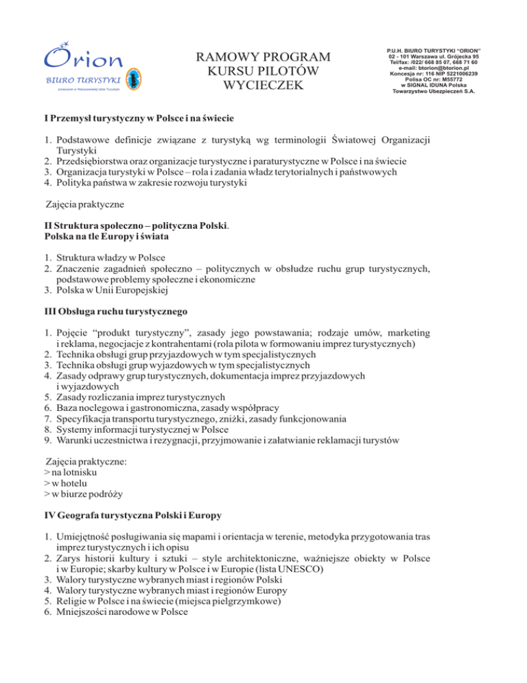 YKI WAR SZA W S IZBA ST RY TU HA C zrzeszone w Warszawskiej Izbie Turystyki O F TO U W SA RISM W AR BIURO TURYSTYKI KA M BE R RAMOWY PROGRAM KURSU PILOTÓW WYCIECZEK P.U.H. BIURO TURYSTYKI “ORION” 02 - 101 Warszawa ul. Grójecka 95 Tel/fax: /022/ 668 85 07, 668 71 60 e-mail: [email protected] Koncesja nr: 116 NIP 5221006239 Polisa OC nr: M55772 w SIGNAL IDUNA Polska Towarzystwo Ubezpieczeñ S.A. I Przemys³ turystyczny w Polsce i na œwiecie 1. Podstawowe definicje zwi¹zane z turystyk¹ wg terminologii Œwiatowej Organizacji Turystyki 2. Przedsiêbiorstwa oraz organizacje turystyczne i paraturystyczne w Polsce i na œwiecie 3. Organizacja turystyki w Polsce – rola i zadania w³adz terytorialnych i pañstwowych 4. Polityka pañstwa w zakresie rozwoju turystyki Zajêcia praktyczne II Struktura spo³eczno – polityczna Polski. Polska na tle Europy i œwiata 1. Struktura w³adzy w Polsce 2. Znaczenie zagadnieñ spo³eczno – politycznych w obs³udze ruchu grup turystycznych, podstawowe problemy spo³eczne i ekonomiczne 3. Polska w Unii Europejskiej III Obs³uga ruchu turystycznego 1. Pojêcie “produkt turystyczny”, zasady jego powstawania; rodzaje umów, marketing i reklama, negocjacje z kontrahentami (rola pilota w formowaniu imprez turystycznych) 2. Technika obs³ugi grup przyjazdowych w tym specjalistycznych 3. Technika obs³ugi grup wyjazdowych w tym specjalistycznych 4. Zasady odprawy grup turystycznych, dokumentacja imprez przyjazdowych i wyjazdowych 5. Zasady rozliczania imprez turystycznych 6. Baza noclegowa i gastronomiczna, zasady wspó³pracy 7. Specyfikacja transportu turystycznego, zni¿ki, zasady funkcjonowania 8. Systemy informacji turystycznej w Polsce 9. Warunki uczestnictwa i rezygnacji, przyjmowanie i za³atwianie reklamacji turystów Zajêcia praktyczne: > na lotnisku > w hotelu > w biurze podró¿y IV Geografa turystyczna Polski i Europy 1. Umiejêtnoœæ pos³ugiwania siê mapami i orientacja w terenie, metodyka przygotowania tras imprez turystycznych i ich opisu 2. Zarys historii kultury i sztuki – style architektoniczne, wa¿niejsze obiekty w Polsce i w Europie; skarby kultury w Polsce i w Europie (lista UNESCO) 3. Walory turystyczne wybranych miast i regionów Polski 4. Walory turystyczne wybranych miast i regionów Europy 5. Religie w Polsce i na œwiecie (miejsca pielgrzymkowe) 6. Mniejszoœci narodowe w Polsce Zajêcia praktyczne > kilkugodzinna wycieczka po Starym Mieœcie w Warszawie > w Klubie Pilota - spotkania z pilotami, podró¿nikami, prelekcje, porady, pokazy slajdów itp. V Przepisy prawne w turystyce i ubezpieczenia turystyczne 1. Przepisy prawne normuj¹ce obs³ugê ruchu turystycznego * prawa i obowi¹zki pilota * zatrudnienie pilotów * odpowiedzialnoœæ prawna pilota * odpowiedzialnoœæ prawna organizatora * ochrona konsumenta * umowy zawierane w turystyce * turystyczny kodeks etyczny 2. Przepisy paszportowe, celne, wizowe, dewizowe, opieka konsularna 3. Rodzaje i formy ubezpieczenia turystów, protokó³ szkód Zajêcia praktyczne > w biurze podró¿y VI Bezpieczeñstwo, profilaktyka i ochrona zdrowia, higiena w turystyce 1. Zagro¿enie dla zdrowia i ¿ycia wystêpuj¹ce w trakcie realizacji imprez turystycznych; podstawowe zasady ochrony zdrowia w turystyce 2. Pierwsza pomoc 3. Sk³ad podstawowy apteczki VII Pilot a grupa 1. Podstawowe komunikowanie siê pilota wycieczki z grup¹, procesy grupowe i techniki negocjacji, cechy psychofizyczne pilota wycieczek, program osobistego rozwoju pilota 2. Kszta³towanie pozytywnego wizerunku kraju, biura podró¿y i imprezy turystycznej 3. Rozwi¹zywanie konfliktów, Ÿród³a i objawy stresu 4. Postêpowanie pilota w sytuacjach nadzwyczajnych, zasady sporz¹dzania protoko³ów zdarzeñ 5. Emisja g³osu 6. Animacja grupy 7. Elementy savoir-vivre'u i protokó³ w biznesie Zajêcia praktyczne: > w autokarze (podczas wycieczki szkoleniowej) > w Klubie Pilota VIII Zajêcia praktyczne Oprócz wymienionych powy¿ej zajêæ praktycznych program kursu obejmujê 3 - dniow¹ wycieczkê egzaminacyjno - szkoleniow¹ do Pragi Czeskiej, podczas której uczestnicy maj¹ mo¿liwoœæ praktycznej nauki zasad pilota¿u w zakresie technik obs³ugi (przygotowanie do trasy, transfery, zakwaterowanie grupy, wspó³praca z hotelem i restauracj¹, procedury na przejœciu granicznym, wspó³praca z kierowc¹ i lokalnym przewodnikiem itp.)