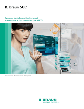 B. Braun SGC System do kontrolowanej insulinoterapii - wyposażony w algorytm predykcyjny (eMPC) Nowoczesność. Bezpieczeństwo. Oszczędność. Space GlucoseControl – SGC zawiera inteligentny ulepszony algorytm predykcyjny (eMPC) Dane wejściowe Stężenie glukozy we krwi nPoprzednia szybkość podawania insuliny nZawartość węglowodanóww żywieniu dojelitowym n Zawartość glukozy w żywieniu pozajelitowym n Masa ciała pacjenta Wynik n nWłaściwa eMPC n n szybkość podawania insuliny Czas kolejnego oznaczenia stężenia glukozy Ulepszony algorytm predykcyjny Definicja: eMPC Wartości docelowe stężenia glukozy t1 = Krótszy odstęp pomiędzy oznaczeniami glikemii, większa dokładność 115 ± 35 predykcji Algorytm eMPC (enhanced model predictive control- ulepszony algorytm predykcyjny) tworzy fizjologiczny model metabolizmu glukozy i insuliny, biorący pod uwagę ilość wcześniej podawanej insuliny oraz glukozy podawanej dojelitowo i/lub pozajelitowo. Ponadto algorytm dostosowuje się do aktualnych warunków fizjologicznych pacjenta zgodnie z zależnościami pomiędzy danymi wyjściowymi, a wynikami wyjściowymi, obserwowanymi podczas kontroli glukozy np. wrażliwości lub oporności na insulinę. Podczas dostosowywania terapii do indywidualnego pacjenta, eMPC (patrz definicja powyżej) używa modelu regulacji glikemii naśladującego procesy fizjologiczne w organizmie w celu ustalenia optymalnej szybkości wlewu insuliny koniecznej do ustabilizowania stężenia glukozy na docelowym poziomie. Także czas pomiędzy pomiarami stężenia glukozy obliczany jest na podstawie modelu prognostycznego tworzonego przez algorytm, obliczający jak może zmieniać się stężenie glukozy we krwi w kolejnych godzinach. 130 ± 30 Lejek prognostyczny Granice akceptacji Stężenie docelowe Tolerancja przy stężeniu docelowym 95 ± 15 Krótszy odstęp i większa dokładność prognozy prowadzi do mniejszej zmienności 80-110 80-150 100 -160 t1 t2 t3 Glukoza (mmol/l) 20 15 10 5 Czas (godz.) Konwencjonalna kontrola glikemii 2 B. Braun SGC-System do kontrolowanej insulinoterapii Konwencjonalna kontrola glukozy Bądź w kontakcie z przyszłością B. Braun Space GlucoseControl zapewnia bezpieczne i niezawodne utrzymanie prawidłowego stężenia glukozy we krwi u krytycznie chorych pacjentów przy znacząco zmniejszonym ryzyku hiper- i hipoglikemii. Dzięki inteligentnemu algorytmowi, B. Braun Space GlucoseControl integruje żywienie dojelitowe i pozajelitowe i dokładnie określa szybkość podawania insuliny i czas pobrania kolejnej próbki krwi- ułatwiając kontrolę nad złożonymi procedurami pracy i zapewniając bezpieczniejszą terapię dzięki zminimalizowaniu ryzyka wystąpienia epizodów potencjalnie niebezpiecznej hiper- i hipoglikemii. 1.Pobieranie i analiza krwi Automatyczne podanie insuliny 3.Zatwierdzenie proponowanej szybkości wlewu insuliny Automatyczne uwzględnianie danych żywieniowych 2.Wprowadzenie wartości glikemii do SpaceControl Automatyczne obliczenie odpowiedniej szybkości wlewu insuliny i czasu pobrania następnej próbki B. Braun Space GlucoseControl Rozwiązanie pozwalające uzyskać bezpieczną i powtarzalną kontrolę nad stężeniem glukozy we krwi Automatyczna integracja żywienia Większe bezpieczeństwo codziennych procedur klinicznych Optymalizacja procedur i ułatwienie podejmowania decyzji w celu poprawy bezpieczeństwa w codziennej pracy Wybór trzech docelowych stężeń glukozy we krwi (95, 115, 130 mg/dl = 5.3, 6.3, 7.2 mmol/l), zapewniających maksymalną elastyczność regulacji glikemii Nowy zakres stężenia docelowego glukozy: 7.2 mmol/l = 130 mg/dl (100 – 160 mg/dl = 5.6 – 8.9 mmol/l) żywienie dojelitowe żywienie pozajelitowe pompa insulinowa moduł SGC ekran dotykowy SpaceControl 3 HC-PH-022 01/2015