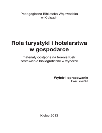 Pedagogiczna Biblioteka Wojewódzka w Kielcach Rola turystyki i hotelarstwa w gospodarce materiały dostępne na terenie Kielc zestawienie bibliograficzne w wyborze Wybór i opracowanie Ewa Lewicka Kielce 2013 Korekta Edyta Smolińska Redakcja techniczna opracowanie graficzne i skład komputerowy Robert Kardas Wydawca: Pedagogiczna Biblioteka Wojewódzka w Kielcach, ul. Jana Pawła II 5, 25-025 Kielce e-mail: [email protected] www.pbw.kielce.pl 1. Butowski, Leszek : Turystyka jako czynnik rozwoju w świetle wybranych teorii rozwoju regionalnego / Leszek Butowski // „Turyzm”. – T. 20, z. 1 (2010), s. 5-11 Uniwersytet Jana Kochanowskiego: Czytelnia Matematyczno-Przyrodnicza 2. Dąbrowska, Barbara Jolanta : Istota polityki turystycznej w krajach Europy / Barbara Jolanta Dąbrowska // „Euroekspert”. – 2008, nr 4/5, s. 94-99 Uniwersytet Jana Kochanowskiego: Czytelnia Zarządzania i Administracji 3. Dąbrowska, Barbara Jolanta : Turystyka międzynarodowa w globalnej gospodarce / Barbara J. Dąbrowska. – Warszawa : Polskie Wydawnictwo Ekonomiczne, 2011. – 146 s. Wojewódzka Biblioteka Publiczna 4. Ekonomiczne i organizacyjne aspekty rozwoju turystyki / pod red. Jana Krupy i Tomasza Solińskiego ; Wyższa Szkoła Informatyki i Zarządzania z siedzibą w Rzeszowie. – Rzeszów : Wydawnictwo Wyższa Szkoła Informatyki i Zarządzania, 2004. – 214 s. Uniwersytet Jana Kochanowskiego: Czytelnia Matematyczno-Przyrodnicza, Czytelnia Zarządzania i Administracji 5. Gospodarka społeczna na bursztynowym szlaku // „Aura”. – 2007, nr 1, dod. „Dodatek ekologiczny dla szkół”, nr 148, s. 10 [Aktywne spędzanie czasu wolnego. Wykorzystanie lokalnych zasobów przyrody i kultury – powstanie i rozwój firm społecznych działających w związku z realizacją projektu Inicjatywy Wspólnotowej Equal, mającego na celu tworzenie nowych miejsc pracy (w pięciu regionach południowej Polski)] Czytelnia Pedagogicznej Biblioteki Wojewódzkiej 6. Gospodarka turystyczna / red. nauk. Aleksander Panasiuk ; aut.: Anna Gardzińska [et al.]. – Warszawa : Wydawnictwo Naukowe PWN, 2008. – 281, [1] s. Uniwersytet Jana Kochanowskiego: Czytelnia Matematyczno-Przyrodnicza 7. Gospodarka turystyczna : wybrane zagadnienia jej funkcjonowania / [red. nauk. Andrzej Rapacz]. – Wrocław : Akademia Ekonomiczna, 2000. – 127, [1] s. Wojewódzka Biblioteka Publiczna 4 8. Grzeszak, Adam : Przemysł czasu wolnego / Adam Grzeszak // „Polityka”. – 2007, nr 31, s. 4-11 [Przemysł turystyczny w Polsce] Czytelnia Pedagogicznej Biblioteki Wojewódzkiej 9. Knecht, Damian : Agroturystyka w agrobiznesie / Damian Knecht. – Warszawa : Wydawnictwo C. H. Beck, 2009. – 184 s. Uniwersytet Jana Kochanowskiego: Czytelnia Matematyczno-Przyrodnicza 10. Kowalczyk, Andrzej : Zagospodarowanie turystyczne / Andrzej Kowalczyk, Marta Derek. – Warszawa : Wydawnictwo Naukowe PWN, 2010. – 423 s. Uniwersytet Jana Kochanowskiego: Czytelnia Matematyczno-Przyrodnicza 11. Kozak, Marek W. : Turystyka i polityka turystyczna a rozwój : między starym a nowym paradygmatem / Marek W. Kozak ; Euroreg. Centrum Europejskich Studiów Regionalnych i Lokalnych. Uniwersytet Warszawski. – Warszawa : „Scholar”, cop. 2009. – 325 s. Uniwersytet Jana Kochanowskiego: Czytelnia Matematyczno-Przyrodnicza 12. Lenartowicz, Agnieszka : Turystyka – sposób na biznes za unijne pieniądze / Agnieszka Lenartowicz // „Euroekspert”. – 2008, nr 1, s. 32-37 [W Polsce coraz częściej obserwuje się dynamiczny rozwój inwestycji w tym sektorze gospodarki] Uniwersytet Jana Kochanowskiego: Czytelnia Zarządzania i Administracji 13. Meyer, Beata : Kształtowanie układów przestrzenno-funkcjonalnych przez turystykę / Beata Meyer. – Szczecin : Wydawnictwo Naukowe Uniwersytetu Szczecińskiego, 2008. – 206 s. Uniwersytet Jana Kochanowskiego: Czytelnia Matematyczno-Przyrodnicza 14. Olszewski, Michał : Knajpy, wyciągi, hotele / Michał Olszewski // „Tygodnik Powszechny”. – 2008, nr 25, s. 6 [Artykuł dostępny w Internecie: http://tygodnik.onet.pl/30,0,11311,knajpy__ wyciagi__hotele,artykul.html] Czytelnia Pedagogicznej Biblioteki Wojewódzkiej 15. Piński, Aleksander : Chłodna Riwiera / Aleksander Piński, Małgorzata Zdziechowska // „Wprost”. – 2007, nr 35, s. 48-[50] [Artykuł dostępny w Internecie: http://www.wprost.pl/ar/112722/Chlodna-riwiera/?I=1288] Wojewódzka Biblioteka Publiczna 5 16. Przedsiębiorstwo turystyczne : ujęcie statyczne i dynamiczne : praca zbiorowa / pod red. Grzegorza Gołembskiego ; [aut. Marlena Bednarska et. al.]. – Warszawa : Polskie Wydawnictwo Ekonomiczne, 2007. – 300 s. Uniwersytet Jana Kochanowskiego: Czytelnia Zarządzania i Administracji 17. Przestrzenne, gospodarcze i humanistyczne aspekty turystyki / pod red. Krzysztofa Szpary i Marka Gwoździa. – Kraków [etc.] : Konsorcjum Akademickie, 2009. – 196 s. Uniwersytet Jana Kochanowskiego: Czytelnia Matematyczno-Przyrodnicza 18. Rekreacja, turystyka i agroturystyka w gospodarce przestrzennej – wyzwanie XXI wieku / red. nauk. Witold Czarnecki ; Wyższa Szkoła Finansów i Zarządzania w Białymstoku. – Białystok : Wydawnictwo Wyższej Szkoły Finansów i Zarządzania, 2007. – 389 s. Uniwersytet Jana Kochanowskiego: Czytelnia Zarządzania i Administracji 19. Rola turystyki w rozwoju gospodarczym obszarów wiejskich i leśnych / red. nauk. Mieczysław Sirko, Janusz Bek ; Wyższa Szkoła Ekonomiczna w Stalowej Woli. – Stalowa Wola : Wyższa Szkoła Ekonomiczna, 2006. – 215 s. Uniwersytet Jana Kochanowskiego: Czytelnia Matematyczno-Przyrodnicza 20. Stachnik-Czapla, Monika : Sposób na ochronę dziedzictwa i rozwój lokalny / Monika Stachnik-Czapla // „Aura”. – 2007, nr 12, s. 27 Czytelnia Pedagogicznej Biblioteki Wojewódzkiej 21. Staszewska, Jolanta : Klaster perspektywą dla przedsiębiorców : na polskim rynku turystycznym / Jolanta Staszewska. – Warszawa : „Difin”, 2009. – 152 s. Uniwersytet Jana Kochanowskiego:
