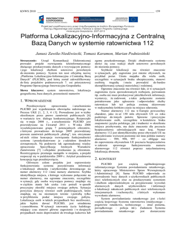 KNWS 2010 ______________________________________________________________________________ 159 Platforma Lokalizacyjno-Informacyjna z Centralną Bazą Danych w systemie ratownictwa 112 Janusz Zawiła-Niedźwiecki, Tomasz Karamon, Marian Podniesiński Streszczenie: Urząd Komunikacji Elektronicznej prowadzi projekt rozwiązania teleinformatycznego służącego przekazywaniu danych o wzywającym pomocy i jego lokalizacji służbom ustawowo powołanym do niesienia pomocy. System ten nosi oficjalną nazwę „Platforma Lokalizacyjno-Informacyjna z Centralną Bazą Danych” (PLICBD), pod którą został zakwalifikowany do listy projektów podstawowych 7. osi priorytetowej Programu Operacyjnego Innowacyjna Gospodarka. Słowa kluczowe: system ratownictwa, lokalizacja geograficzna, baza danych, przenośność numerów 1. WPROWADZENIE Przedsięwzięcie opracowania i uruchomienia PLICBD jest wypełnieniem obowiązku nałożonego na Prezesa UKE [1, 2, 3, 4 i 5]. Prowadzone jest w trybie określonym przez prawo zamówień publicznych [6] w wariancie tzw. dialogu konkurencyjnego. Rozpoczęło się w maju 2008 r., a uruchomienie PLICBD jest przewidywane na I kwartał 2011 r. W roku 2008 wyselekcjonowano grupę 7 potencjalnych oferentów, z którymi prowadzono do lutego 2009 przewidziany prawem zamówień publicznych „dialog”, tzn. otrzymano od nich różne koncepcje rozwiązania funkcjonalności systemu i przedyskutowano je z udziałem doradców zewnętrznych. Na podstawie tak zgromadzonej wiedzy opracowano Specyfikację Istotnych Warunków Zamówienia [7] i oficjalnie przekazano ją oferentom. Rozstrzygnięcie przetargu nastąpiło w sierpniu, a projekt rozpoczął się w październiku 2009 r. Artykuł przedstawia koncepcję tego przedsięwzięcia. Głównym celem projektu jest usprawnienie funkcjonowania systemu pozyskiwania informacji o lokalizacji abonenta i użytkownika dzwoniącego na numer alarmowy 112 i inne numery alarmowe. Szybka identyfikacja miejsca, z którego wykonano połączenie na numer alarmowy, ma ogromne znaczenie, szczególnie w sytuacji, gdy osoba wzywająca pomocy znajduje się w ciężkim stanie lub szoku i nie potrafi w sposób precyzyjny określić miejsca swojego pobytu. Sytuacja powyższa dotyczy również osób podróżujących, które znajdują się na nieznanym terenie i potrafią tylko w przybliżeniu podać miejsce swojego pobytu. Lokalizacja osób w takich przypadkach bez możliwości, jakie będzie dawać PLICBD, jest utrudniona i czasochłonna. W sytuacji ratowania życia ludzkiego mijający czas stanowi główne zagrożenie i w skrajnych przypadkach może doprowadzić do trwałego kalectwa lub zgonu poszkodowanego. Dzięki zbudowaniu systemu skróci się czas reakcji służb ustawowo powołanych do niesienia pomocy. Szybkość lokalizacji ma również znaczenie w sytuacjach, gdy zagrożone jest mienie obywateli, na przykład pożar. Utrata majątku dla wielu osób, szczególnie w sytuacjach braku ubezpieczenia, stanowi osobistą tragedię i może prowadzić do bardzo skomplikowanej sytuacji materialnej i rodzinnej. Ogromne znaczenie ma również fakt, iż w sytuacjach zagrożenia życia spowodowanych rozbojem, porwaniem itp. osoba nie musi przekazywać jakichkolwiek informacji, wystarczy, że zadzwoni, a takie połączenie zostanie potraktowane jako zgłoszenie i odpowiednie służby ratownicze lub też policja zostaną skierowane w maksymalnie krótkim czasie na miejsce zdarzenia. Numer alarmowy 112 ma w Europie powszechny charakter, jako że aż 150 mln obywateli UE co roku podróżuje do innych państw. Sprawne i precyzyjne lokalizowanie osób, szczególnie w kontekście braku znajomości języka polskiego, jak i trudności w określeniu miejsca przebywania, ma duże znaczenie dla poczucia bezpieczeństwa odwiedzających nasz kraj. Numer alarmowy 112 jest identyfikowalny przez obywateli UE na zdecydowanie wyższym poziomie niż inne polskie numery alarmowe – 999, 998, 997 – co obliguje nas do zapewnienia obywatelom UE poczucia bezpieczeństwa w zakresie sprawnego funkcjonowania numeru alarmowego 112 również poprzez natychmiastową lokalizację abonenta. 2. KONTEKST PLICBD jest częścią ogólnokrajowego informatycznego Systemu powiadamiania ratunkowego, który opracowuje Ministerstwo Spraw Wewnętrznych i Administracji [8]. Sama PLICBD odpowiada za prowadzenie bazy danych o użytkownikach publicznych sieci telefonicznych oraz za przekazywanie systemom i służbom odpowiedzialnym za przyjmowanie wywołań alarmowych danych użytkowników i informacji o lokalizacji zakończeń publicznych sieci telefonicznych (stacjonarnych i ruchomych), z których wykonano wywołanie alarmowe. System powiadamiania ratunkowego jest z kolei częścią krajowego Systemu ratownictwa (medycznego – pogotowie ratunkowe, technicznego – straż pożarna, porządkowego – policja itd.). Zadaniem Systemu powiadamiania ratunkowego jest dostarczenie 160 ______________________________________________________________________________ KNWS 2010 odpowiednim służbom, powołanym do niesienia pomocy, informacji umożliwiających dotarcie przez ratowników do osoby wzywającej pomocy, a także na - podstawie cech użytkownika numeru - ewentualnego charakteru wezwania. System ten składa się z Centrów Powiadamiania Ratunkowego (CPR), gdzie pracują operatorzy przyjmujący wezwania o pomoc. To ich pracę ma wspierać PLICBD (por. rys. 1). Liczba CPR zostanie określona przez wojewodów poszczególnych województw. Szacuje się, że CPR może być zorganizowane nawet w każdym powiecie. Funkcjonalność PLICBD posłuży dostarczaniu informacji do poszczególnych CPR, natomiast fizyczna realizacja łączności odbywać się będzie przez centralny punkt systemu centrów powiadamiania ratunkowego, będący brzegowym elementem tej części systemu powiadamiania ratunkowego, która jest tworzona przez MSWiA. Poza Systemem centrów powiadamiania ratunkowego PLICBD będzie obsługiwać, w zak