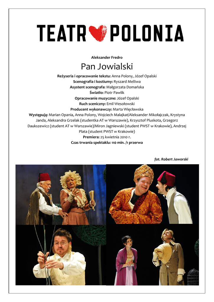 Aleksander Fredro Pan Jowialski Reżyseria i opracowanie tekstu: Anna Polony, Józef Opalski Scenografia i kostiumy: Ryszard Melliwa Asystent scenografa: Małgorzata Domańska Światło: Piotr Pawlik Opracowanie muzyczne: Józef Opalski Ruch sceniczny: Emil Wesołowski Producent wykonawczy: Marta Więcławska Występują: Marian Opania, Anna Polony, Wojciech Malajkat/Aleksander Mikołajczak, Krystyna Janda, Aleksandra Grzelak (studentka AT w Warszawie), Krzysztof Pluskota, Grzegorz Daukszewicz (student AT w Warszawie)/Miron Jagniewski (student PWST w Krakowie), Andrzej Plata (student PWST w Krakowie) Premiera: 25 kwietnia 2010 r. Czas trwania spektaklu: 110 min. /1 przerwa fot. Robert Jaworski Opis spektaklu: „Pan Jowialski” Aleksandra Fredry to jedna z najbardziej kochanych przez teatr i publiczność komedii. Obok „Zemsty” i „Ślubów panieńskich” budzi też najżywsze dyskusje krytyki. Jednocześnie to utwór stwarzający wyjątkowe szanse na wielkie kreacje aktorskie i zawsze żywą reakcję publiczności. Bo „Pan Jowialski” jest komedią cudowną! Fredro nie moralizuje, nie poucza. Jego sztuka jest tekstem wspaniałym, ponadczasowym. To swoisty model świata, w którym każda z postaci każe się zastanowić nad cnotami i ułomnościami natury ludzkiej. Boy nazwał tę sztukę „sfinksem naszej literatury”. Dziś komedia Fredry pojawia się na scenie Teatru Polonia. Mamy szansę przejrzeć się w mądrości i humorze wielkiego komediopisarza. Skorzystajmy z niej. Fragmenty recenzji: Inscenizacja w Teatrze Polonia to dwie godziny oczyszczającej rozrywki. Do tego kilka świetnych ról aktorskich, a przede wszystkim zabawa w teatr, w której chętnie biorą udział zarówno aktorzy, jak i widzowie. Spektakl okazał się zabawnym moralitetem na temat cnót i ułomności natury ludzkiej. Seansem, który daje wytchnienie. Wytworzył wspólnotę śmiechu, do której tak bardzo tęsknimy. Warto to sprawdzić osobiście, bo jak mówi przysłowie, "Kto czego nie doznał, ten nie zrozumie". Jan Bończa-Szabłowski ***** "Pan Jowialski" w reżyserii Anny Polony i Józefa Opalskiego to inscenizacja, która ma przede wszystkim być pyszną i wykwintną zabawą. To też święto teatru, który odchodzi dziś już chyba do lamusa. Takiego, który ostentacyjnie wyrzeka się brudu - jest przejrzysty, precyzyjny, a tekst literacki traktuje z pokorą i respektem. (…) Przedstawienie Polony i Opalskiego to czysta, bezpretensjonalna rozrywka na wysokim poziomie. Czyż nie o to właśnie chodziło Fredrze - sprawić, by na chwilę stanął czas, i pozwolić, by w śmiechu odnaleźć odrobinę prawdy o nas samych? Agnieszka Michalak ***** Siła tego spektaklu tkwi w wyrazistych kreacjach aktorskich. Przy okazji miło jest odnosić wrażenie, że aktorzy bawią się tekstem i robią to z niewymuszoną lekkością. Ta atmosfera udzieliła się publiczności. „Pan Jowialski” jest sztuką, na którą powinien się wybrać każdy, kto chce w teatrze się serdecznie pośmiać. Sylwia Tomkiewicz IMPRESARIAT TEATRU POLONIA I OCH-TEATRU: Iwona Gradkowska kom. 609 062 817 / email: [email protected] www.teatrpolonia.pl