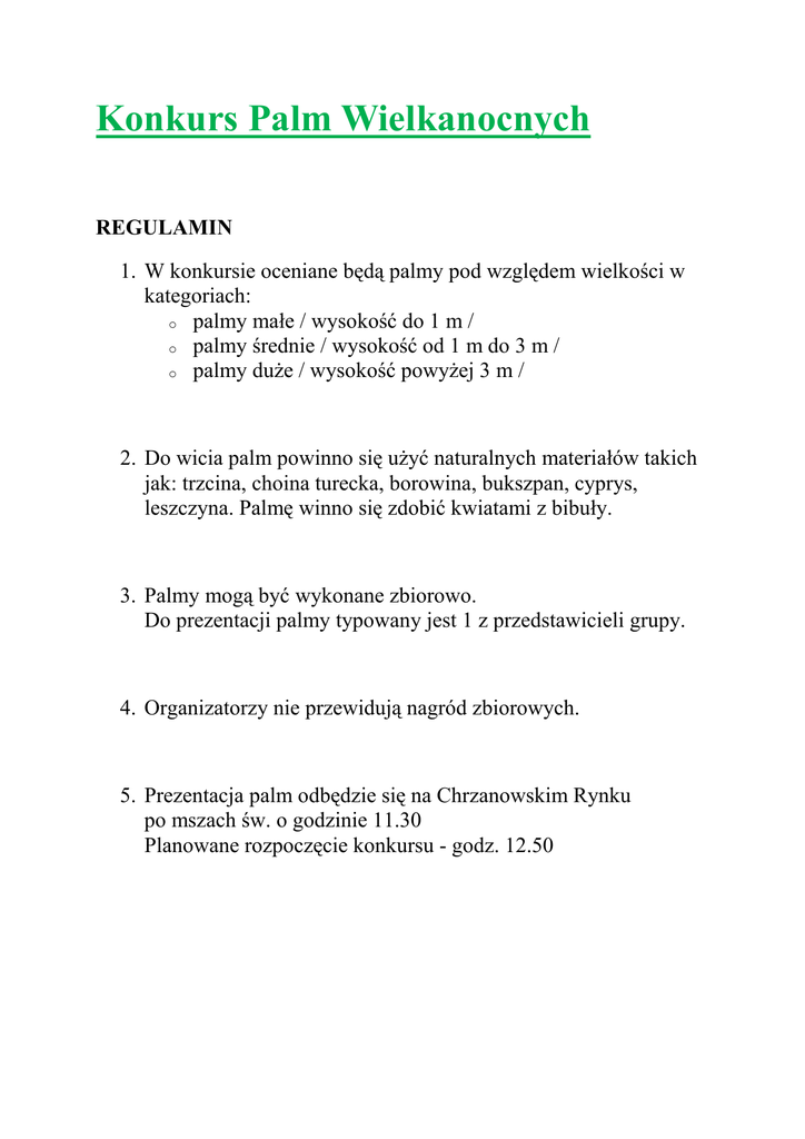 Konkurs Palm Wielkanocnych REGULAMIN 1. W konkursie oceniane będą palmy pod względem wielkości w kategoriach: o palmy małe / wysokość do 1 m / o palmy średnie / wysokość od 1 m do 3 m / o palmy duŜe / wysokość powyŜej 3 m / 2. Do wicia palm powinno się uŜyć naturalnych materiałów takich jak: trzcina, choina turecka, borowina, bukszpan, cyprys, leszczyna. Palmę winno się zdobić kwiatami z bibuły. 3. Palmy mogą być wykonane zbiorowo. Do prezentacji palmy typowany jest 1 z przedstawicieli grupy. 4. Organizatorzy nie przewidują nagród zbiorowych. 5. Prezentacja palm odbędzie się na Chrzanowskim Rynku po mszach św. o godzinie 11.30 Planowane rozpoczęcie konkursu - godz. 12.50