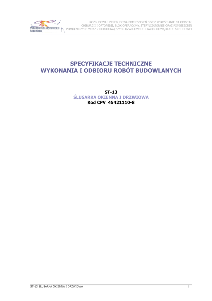ROZBUDOWA I PRZEBUDOWA POMIESZCZEŃ SPZOZ W KOŚCIANIE NA ODDZIAŁ CHIRURGII I ORTOPEDII, BLOK OPERACYJNY, STERYLIZATORNIĘ ORAZ POMIESZCZEŃ POMOCNICZYCH WRAZ Z DOBUDOWĄ SZYBU DŹWIGOWEGO I NADBUDOWĄ KLATKI SCHODOWEJ SPECYFIKACJE TECHNICZNE WYKONANIA I ODBIORU ROBÓT BUDOWLANYCH ST-13 ŚLUSARKA OKIENNA I DRZWIOWA Kod CPV 45421110-8 ST-13 ŚLUSARKA OKIENNA I DRZWIOWA 1 ROZBUDOWA I PRZEBUDOWA POMIESZCZEŃ SPZOZ W KOŚCIANIE NA ODDZIAŁ CHIRURGII I ORTOPEDII, BLOK OPERACYJNY, STERYLIZATORNIĘ ORAZ POMIESZCZEŃ POMOCNICZYCH WRAZ Z DOBUDOWĄ SZYBU DŹWIGOWEGO I NADBUDOWĄ KLATKI SCHODOWEJ SPIS TREŚCI 1. WSTĘP ..................................................................................................................... 2. MATERIAŁY .............................................................................................................. 3. SPRZĘT .................................................................................................................... 4. TRANSPORT ............................................................................................................. 5. WYKONANE ROBÓT .................................................................................................. 6. KONTROLA JAKOŚCI ROBÓT ..................................................................................... 7. OBMIAR ROBÓT ....................................................................................................... 8. ODBIÓR ROBÓT ....................................................................................................... 9. PODSTAWA PŁATNOŚCI ............................................................................................ 10. PRZEPISY ZWIĄZANE .............................................................................................. 3 3 9 9 10 14 15 15 15 15 NajwaŜniejsze oznaczenia i skróty: ST – Specyfikacja Techniczna PZJ – Program Zabezpieczenia Jakości ITB – Instytut Techniki Budowlanej 2 ST-13 ŚLUSARKA OKIENNA I DRZWIOWA ROZBUDOWA I PRZEBUDOWA POMIESZCZEŃ SPZOZ W KOŚCIANIE NA ODDZIAŁ CHIRURGII I ORTOPEDII, BLOK OPERACYJNY, STERYLIZATORNIĘ ORAZ POMIESZCZEŃ POMOCNICZYCH WRAZ Z DOBUDOWĄ SZYBU DŹWIGOWEGO I NADBUDOWĄ KLATKI SCHODOWEJ 1. WSTĘP 1.1. Przedmiot ST Przedmiotem niniejszej standardowej specyfikacji technicznej (ST) są wymagania dotyczące wykonania i odbioru ślusarki okiennej i drzwiowej, świetlików dla rozbudowy i przebudowy pomieszczeń szpitala SPZOZ w Kościanie na oddział chirurgii i ortopedii, blok operacyjny, sterylizatornię oraz pomieszczeń pomocniczych z dobudową szybu dźwigowego i nadbudową klatki schodowej 1.2. Zakres stosowania ST Niniejsza specyfikacja techniczna (ST) jest stosowana przy realizacji robót wymienionych w pkt. 1.1. Odstępstwa od wymagań podanych w niniejszej specyfikacji mogą mieć miejsce tylko w przypadkach prostych robót o niewielkim znaczeniu, dla których istnieje pewność, Ŝe podstawowe wymagania będą spełnione przy zastosowaniu metod wykonania wynikających z doświadczenia oraz uznanych reguł i zasad sztuki budowlanej oraz przy uwzględnieniu obowiązujących przepisów bhp. 1.3. Zakres robót objętych ST Roboty, których dotyczy specyfikacja, obejmują wszystkie czynności umoŜliwiające i mające na celu wykonanie ślusarki okiennej i drzwiowej aluminiowej i PVC , ścian osłonowych słupowo – ryglowych, klap oddymiających, pasm świetlnych. Wykonawca robót jest odpowiedzialny za jakość ich wykonania oraz za zgodność z dokumentacja projektowa, ST i poleceniami InŜyniera. 2. MATERIAŁY 2.1. Ogólne wymagania dotyczące materiałów Ogólne wymagania dotyczące materiałów i ich rodzaju podano w ST Kod CPV 45000000-7 „Wymagania ogólne” pkt 2. 2.2. Wymagania dotyczące materiałów 2.2.1. Profile PCV Okna powinny spełniać warunki wytrzymałościowe wynikające z obliczeń statycznych, w których naleŜy uwzględniać dopuszczalne obciąŜenie wiatrem wg PN-EN 1990:2004, PN-EN 1991-1-4:2008 Okna powinny spełniać wymagania ochrony cieplnej budynków zgodnie z – PN-EN ISO 6946:1998 Kształtowniki powinny być wykonane z wysokoudarowego PCV / pięciokomorowego – gł. min 70mm/, w kolorze białym wg określonych przez producenta norm. Szyby zespolone jednokomorowe o wartościach współczynnika przenikania ciepła infiltracji spełniających wymagania PN-EN ISO 6946:1998 i wg PN-B-02151-01-03;1987, PN-B-02152-02:1987 ochrona przeciwdźwiękowa pomieszczeń. Okucia – w oknach z kształtowników PCV naleŜy stosować kompletne objęte normami, certyfikatem ITB zgodności do aprobaty technicznej. Okucia winny być dostosowane do cięŜaru własnego skrzydła i do obciąŜeń eksploatacyjnych , skrzydła rozwieralne winny być wyposaŜone w ograniczniki rozwieralności. Uszczelki – uszczelki przylgowe winny być na całym obwodzie okna i odpowiadać normom Producenta Konstrukcja okien z kształtowników PCV/ jedno, dwu, trzy ,czteropłytowa winna spełniać wymagania normowe Producenta poparta aprobatą techniczną . Okna montowane powinny spełniać wymagania dotyczące przepuszczalności powietrza oraz winny być zaopatrzone w otwory odprowadzające wodę /skropliny/ . Szczegółowa specyfikacja wg zestawień 2.2.2. Profile aluminiowe wg PN - EN 515: 1996, PN - EN 573-3:1998 (fasada słupowo ryglowa) • Stop aluminium EN AW-6060 PN-EN 573-3:2004, stan T66 wg PN-EN 515:1996 (AlMgSi0,5F22 DIN1725 T.1) ST-13 ŚLUSARKA OKIENNA I DRZWIOWA 3 ROZBUDOWA I PRZEBUDOWA POMIESZCZEŃ SPZOZ W KOŚCIANIE NA ODDZIAŁ CHIRURGII I ORTOPEDII, BLOK OPERACYJNY, STERYLIZATORNIĘ ORAZ POMIESZCZEŃ POMOCNICZYCH WRAZ Z DOBUDOWĄ SZYBU DŹWIGOWEGO I NADBUDOWĄ KLATKI SCHODOWEJ • • • • • • • • • Gęstość 2700 [kg/m3] Współczynnik rozszerzalności liniowej α=23.5x10-6[1/K] Moduł spręŜystości wzdłuŜnej Younga E=70000[MPa] Współczynnik Poisson`a ν=0,3 Wytrzymałość na rozciąganie Rm min=215[MPa] Umowna granica plastyczn