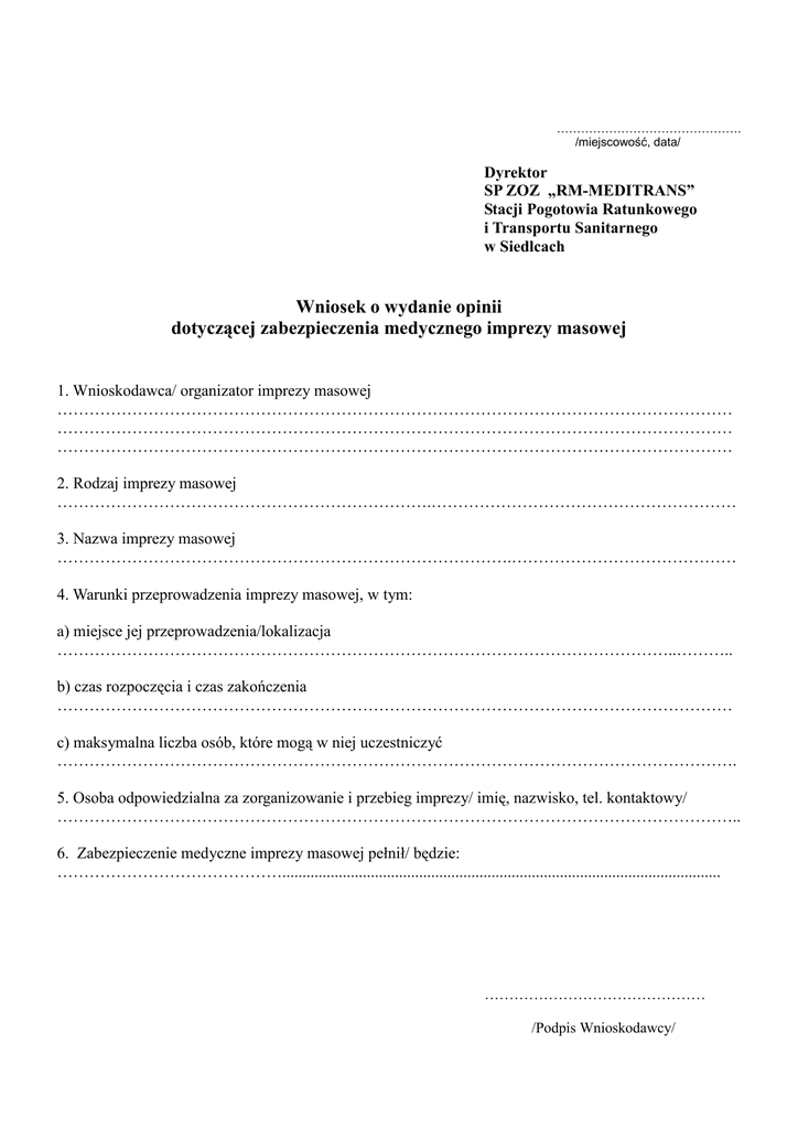 ………………………………………. /miejscowość, data/ Dyrektor SP ZOZ „RM-MEDITRANS” Stacji Pogotowia Ratunkowego i Transportu Sanitarnego w Siedlcach Wniosek o wydanie opinii dotyczącej zabezpieczenia medycznego imprezy masowej 1. Wnioskodawca/ organizator imprezy masowej ……………………………………………………………………………………………………………… ……………………………………………………………………………………………………………… ……………………………………………………………………………………………………………… 2. Rodzaj imprezy masowej …………………………………………………………….………………………………………………… 3. Nazwa imprezy masowej ………………………………………………………………………….…………………………………… 4. Warunki przeprowadzenia imprezy masowej, w tym: a) miejsce jej przeprowadzenia/lokalizacja ……………………………………………………………………………………………………..……….. b) czas rozpoczęcia i czas zakończenia ……………………………………………………………………………………………………………… c) maksymalna liczba osób, które mogą w niej uczestniczyć ………………………………………………………………………………………………………………. 5. Osoba odpowiedzialna za zorganizowanie i przebieg imprezy/ imię, nazwisko, tel. kontaktowy/ ……………………………………………………………………………………………………………….. 6. Zabezpieczenie medyczne imprezy masowej pełnił/ będzie: ……………………………………............................................................................................................. ……………………………………… /Podpis Wnioskodawcy/ Do wniosku należy dołączyć: 1) graficzny plan obiektu (terenu), na którym ma być przeprowadzona impreza masowa, wraz z jego opisem, zawierający: a) oznaczenie dróg dojścia i rozchodzenia się osób uczestniczących w imprezie masowej, dróg ewakuacyjnych i dróg dojazdowych dla pojazdów służb ratowniczych i Policji, b) oznaczenie punktów pomocy medycznej (planowanego miejsca stacjonowania zespołu ratownictwa medycznego), punktów czerpalnych wody do picia i do celów przeciwpożarowych oraz punktów informacyjnych, c) oznaczenie lokalizacji hydrantów przeciwpożarowych, zaworów, przyłączy wody, gazu i energii elektrycznej oraz innych elementów mających wpływ na bezpieczeństwo użytkowników obiektu lub terenu, d) informacje o rozmieszczeniu służb porządkowych oraz służb informacyjnych, rozmieszczeniu osób uczestniczących w imprezie masowej i ewentualnym rozdzieleniu ich według sektorów oraz o rozmieszczeniu punktów gastronomicznych i sanitariatów; 2) Instrukcję postępowania w przypadku powstania pożaru lub innego miejscowego zagrożenia w miejscu i w czasie imprezy masowej. 3) Liczebność służby porządkowej oraz służby informacyjnej 4) Terminarz rozgrywek meczów piłki nożnej lub terminarz innych imprez masowych - w przypadku imprez masowych organizowanych cyklicznie 5) Informację o: a) liczbie miejsc dla osób na imprezie masowej, b) przewidywanych zagrożeniach bezpieczeństwa i porządku publicznego, c) liczbie, organizacji, oznakowaniu, wyposażeniu i sposobie rozmieszczenia służby porządkowej oraz służby informacyjnej; 6) Informacje o osobie wyznaczonej na kierownika do spraw bezpieczeństwa, w tym jego dane obejmujące: imię, nazwisko, numer PESEL, numer i datę wydania zaświadczenia o ukończeniu kursu dla kierowników do spraw bezpieczeństwa imprez masowych, a w przypadku imprezy masowej podwyższonego ryzyka dodatkowo numer i datę wydania licencji pracownika ochrony fizycznej drugiego stopnia; 7) Informację o sposobie zapewnienia identyfikacji osób biorących udział w imprezie masowej - w przypadku meczu piłki nożnej lub imprezy masowej podwyższonego ryzyka; 8) Informację o zainstalowanych urządzeniach rejestrujących obraz i dźwięk, o których mowa wart. 11; 9) Informację o powiadomieniu podmiotów, o których mowa w art. 25 ust. 1 pkt 3 - w przypadku przeprowadzania imprezy masowej w strefie nadgranicznej lub na terenach będących w zarządzie jednostek organizacyjnych podległych, podporządkowanych lub nadzorowanych przez Ministra Obrony Narodowej. 10) Program i regulamin imprezy masowej, wraz z informacją o sposobie udostępnienia go uczestnikom imprezy masowej; 11) Regulamin obiektu (terenu), wraz z informacją o sposobie udostępnienia go uczestnikom imprezy masowej; 12) Pisemną instrukcję określającą zadania służby porządkowej oraz służby informacyjnej; 13) Warunki łączności pomiędzy podmiotami biorącymi udział w zabezpieczeniu imprezy masowej. 14) Dowód wpłaty za wydanie opinii. 15) Oświadczenie firmy/ podmiotu pełniącego zabezpieczenie medyczne imprezy o spełnieniu wymogów Rozporządzenia Ministra Zdrowia z dnia 6 lutego 2012 roku w sprawie minimalnych wymagań dotyczących zabezpieczenia pod względem medycznym imprezy masowej . Uwaga! 1. Niekompletne Wnioski o wydanie opinii o zabezpieczeniu medycznym imprezy masowej y z przyczyn formalnych nie będą rozpatrywane. 2. Termin wydania opinii- 14 dni od dnia otrzymania kompletnego wniosku. 3. Opinie zachowuje ważność przez 6 miesięcy od dnia ich wydania.