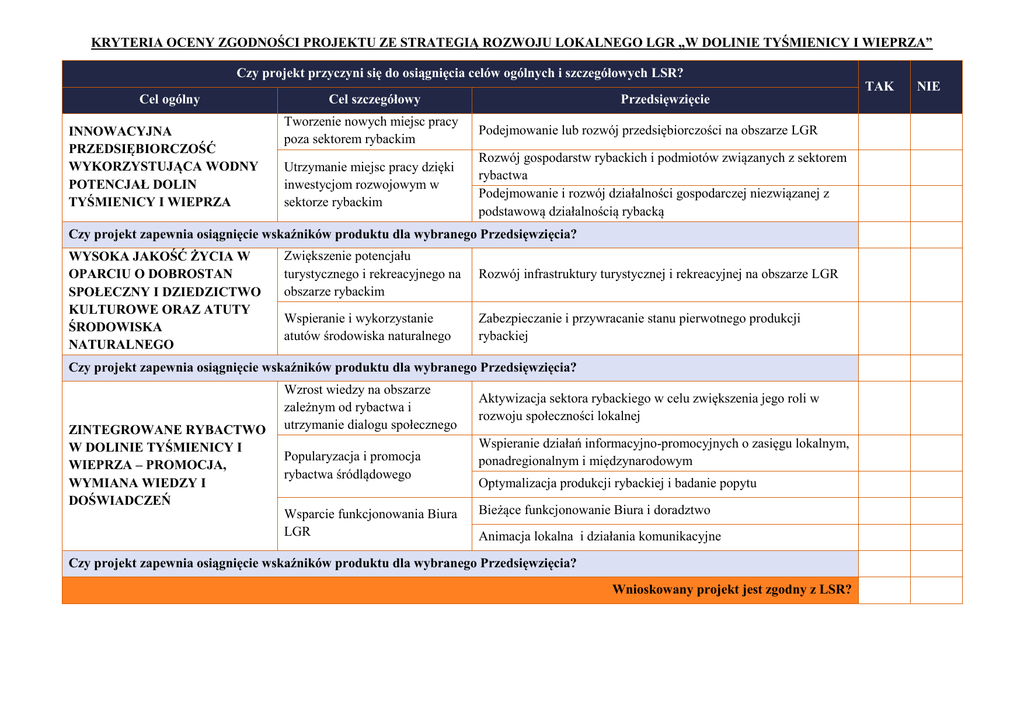KRYTERIA OCENY ZGODNOŚCI PROJEKTU ZE STRATEGIĄ ROZWOJU LOKALNEGO LGR „W DOLINIE TYŚMIENICY I WIEPRZA” Czy projekt przyczyni się do osiągnięcia celów ogólnych i szczegółowych LSR? Cel ogólny INNOWACYJNA PRZEDSIĘBIORCZOŚĆ WYKORZYSTUJĄCA WODNY POTENCJAŁ DOLIN TYŚMIENICY I WIEPRZA Cel szczegółowy Przedsięwzięcie Tworzenie nowych miejsc pracy poza sektorem rybackim Podejmowanie lub rozwój przedsiębiorczości na obszarze LGR Utrzymanie miejsc pracy dzięki inwestycjom rozwojowym w sektorze rybackim Rozwój gospodarstw rybackich i podmiotów związanych z sektorem rybactwa Podejmowanie i rozwój działalności gospodarczej niezwiązanej z podstawową działalnością rybacką Czy projekt zapewnia osiągnięcie wskaźników produktu dla wybranego Przedsięwzięcia? WYSOKA JAKOŚĆ ŻYCIA W OPARCIU O DOBROSTAN SPOŁECZNY I DZIEDZICTWO KULTUROWE ORAZ ATUTY ŚRODOWISKA NATURALNEGO Zwiększenie potencjału turystycznego i rekreacyjnego na obszarze rybackim Rozwój infrastruktury turystycznej i rekreacyjnej na obszarze LGR Wspieranie i wykorzystanie atutów środowiska naturalnego Zabezpieczanie i przywracanie stanu pierwotnego produkcji rybackiej Czy projekt zapewnia osiągnięcie wskaźników produktu dla wybranego Przedsięwzięcia? ZINTEGROWANE RYBACTWO W DOLINIE TYŚMIENICY I WIEPRZA – PROMOCJA, WYMIANA WIEDZY I DOŚWIADCZEŃ Wzrost wiedzy na obszarze zależnym od rybactwa i utrzymanie dialogu społecznego Popularyzacja i promocja rybactwa śródlądowego Wsparcie funkcjonowania Biura LGR Aktywizacja sektora rybackiego w celu zwiększenia jego roli w rozwoju społeczności lokalnej Wspieranie działań informacyjno-promocyjnych o zasięgu lokalnym, ponadregionalnym i międzynarodowym Optymalizacja produkcji rybackiej i badanie popytu Bieżące funkcjonowanie Biura i doradztwo Animacja lokalna i działania komunikacyjne Czy projekt zapewnia osiągnięcie wskaźników produktu dla wybranego Przedsięwzięcia? Wnioskowany projekt jest zgodny z LSR? TAK NIE Kryteria wyboru operacji: Wsparcie podejmowania i zakładania działalności gospodarczej niezwiązanej bezpośrednio z rybactwem (przedsięwzięcie 1.1.1. i 1.2.2.) Lp. 1. 2. 3. Nazwa kryterium Liczba nowoutworzonych miejsc pracy Koszt utworzenia jednego miejsca pracy Zintegrowanie gospodarcze obszaru – preferowane branże działalności 4. Doradztwo Biura LGR 5. Podejmowanie działalności przez grupy defaworyzowane (kobiety, osoby do 40 roku życia, rybacy) Opis W zakresie rozwijania działalności gospodarczej preferuje się projekty w ramach których wnioskodawca zobowiązała się do utworzenia miejsc pracy. W zakresie podejmowania działalności gospodarczej preferuje się projekty w ramach których wnioskodawca podejmie działalność w formie samozatrudnienia Preferuje się projekty w ramach których jest niższy iloraz kwoty dotacji do liczby deklarowanych miejsc pracy Preferuje się projekty w ramach których nowe miejsca pracy zostały utworzone w preferowanach branżach, tj. rybackiej, zakwaterowanie i usługi gastronomiczne, kultura, rozrywka i rekreacja Preferuje się projekty które były przedmiotem doradztwa udzielanego przez pracownika Biura LGR Preferuje się projekty których beneficjentem są osoby z grupy defaworyzowanej, tj. osoba młoda do 40 roku życia, kobieta, rybak Punktacja Wnioskodawca zobowiązał się w ramach operacji do utworzenia: 1 średniorocznego etatu zawartego w oparciu o umowę o pracę – 2 pkt 2 lub więcej średniorocznych etatów zawartych w oparciu o umowę o pracę – 4 pkt Wnioskodawca zobowiązał się w ramach operacji do utworzenia: Niezatrudnienie dodatkowej osoby (samozatrudnienie) – 2 pkt 1 lub więcej średniorocznych etatów zawartych w oparciu o umowę o pracę – 4 pkt Operacje w których wielkość dofinansowania do deklarowanych miejsc pracy stanowi (iloraz kwoty dotacji do liczby deklarowanych miejsc pracy): Koszt 1 miejsca pracy jest wyższy niż 250 000 zł dotacji – 2 pkt Koszt 1 miejsca pracy jest niższy równy 150 000 zł dotacji – 4 pkt Źródło weryfikacji Informacje zawarte w uzasadnieniu wniosku o przyznanie pomocy, rejestry LGR Informacje zawarte w uzasadnieniu wniosku o przyznanie pomocy, rejestry LGR Informacje zawarte we wniosku o przyznanie pomocy Uzasadnienie Kryterium ma wpływ na większą liczbę utworzonych nowych miejsc pracy i pozwoli ograniczyć opisany w diagnozie problem związany z dużym bezrobociem i niewystarczającą liczbą podmiotów gospodarczych generujących nowe miejsca pracy. Kryterium ma wpływ na większą liczbę utworzonych nowych miejsc pracy i pozwoli ograniczyć opisany w diagnozie problem związany z dużym bezrobociem i niewystarczającą liczbą podmiotów gospodarczych generujących nowe miejsca pracy. Kryterium odnosi się do zidentyfikowanej w diagnozie potrzeby zintegrowania wybranych branż działalności gospodarczej wskazanych w partycypacyjnym procesie opracowywania LSR i ma pozytywny wpływ na sektor rybacki. W ramach operacji nowe miejsca pracy utworzone zostały w branżach: Rybackiej – 6 pkt, lub Zakwaterowanie i usługi gastronomiczne – 3 pkt, lub Kultura, rozrywka i rekreacja – 3 pkt, lub Pozostałe – 0 pkt Informacje zawarte we wniosku o przyznanie pomocy Planowana operacja: Była przedmiotem doradztwa udzielanego przez pracowników Biura LGR – 3 pkt Nie podlegała doradztwu – 0 pkt Rejestry udzielonego doradztwa prowadzone przez Biuro LGR, listy uczestników szkoleń Kryterium jest uzasadnione lepszym przygotowaniem wniosku do realizacji i spełnieniem kryteriów istotnych z punktu widzenia realizacji założeń i celów Strategii Informacje zawarte we wniosku o przyznanie pomocy Kryterium wpływa na poprawę dostępu do rynku pracy dla przedstawicieli grup defaworyzowanych określonych w LSR. Zgodnie z diagnozą na obszarze LGR wskazano na duże problemy ze znalezieniem pracy szczególnie wśród Wnioskodawca (lub co najmniej jeden członek spółki) jest przedstawiciel