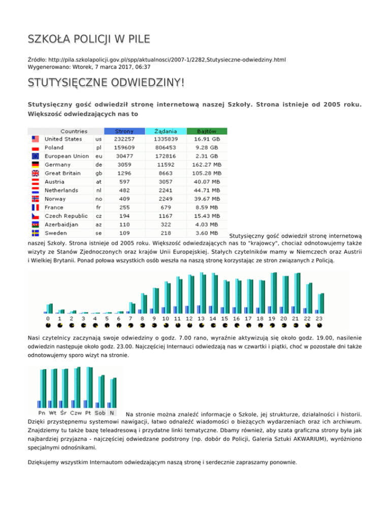 SZKOŁA POLICJI W PILE Źródło: http://pila.szkolapolicji.gov.pl/spp/aktualnosci/2007-1/2282,Stutysieczne-odwiedziny.html Wygenerowano: Wtorek, 7 marca 2017, 06:37 STUTYSIĘCZNE ODWIEDZINY! Stutysięczny gość odwiedził stronę internetową naszej Szkoły. Strona istnieje od 2005 roku. Większość odwiedzających nas to Stutysięczny gość odwiedził stronę internetową naszej Szkoły. Strona istnieje od 2005 roku. Większość odwiedzających nas to "krajowcy", chociaż odnotowujemy także wizyty ze Stanów Zjednoczonych oraz krajów Unii Europejskiej. Stałych czytelników mamy w Niemczech oraz Austrii i Wielkiej Brytanii. Ponad połowa wszystkich osób weszła na naszą stronę korzystając ze stron związanych z Policją. Nasi czytelnicy zaczynają swoje odwiedziny o godz. 7.00 rano, wyraźnie aktywizują się około godz. 19.00, nasilenie odwiedzin następuje około godz. 23.00. Najczęściej Internauci odwiedzają nas w czwartki i piątki, choć w pozostałe dni także odnotowujemy sporo wizyt na stronie. Na stronie można znaleźć informacje o Szkole, jej strukturze, działalności i historii. Dzięki przystępnemu systemowi nawigacji, łatwo odnaleźć wiadomości o bieżących wydarzeniach oraz ich archiwum. Znajdziemy tu także bazę teleadresową i przydatne linki tematyczne. Dbamy również, aby szata graficzna strony była jak najbardziej przyjazna - najczęściej odwiedzane podstrony (np. dobór do Policji, Galeria Sztuki AKWARIUM), wyróżniono specjalnymi odnośnikami. Dziękujemy wszystkim Internautom odwiedzającym naszą stronę i serdecznie zapraszamy ponownie. (20.05.07) Ocena: 0/5 (0) Tweetnij