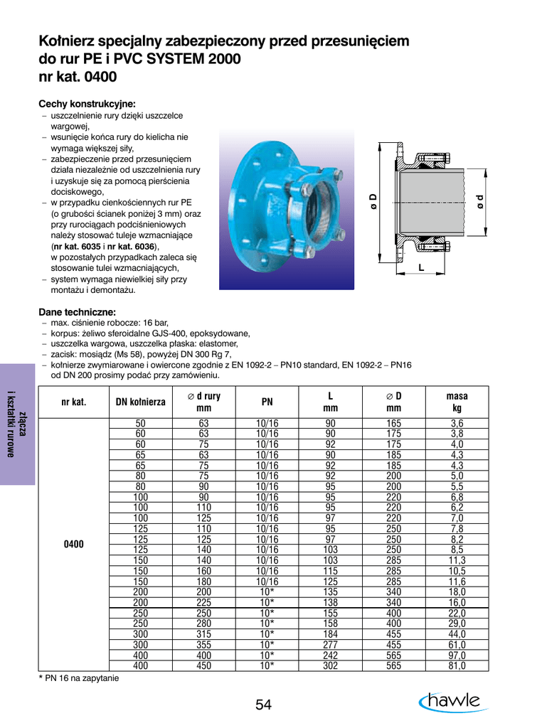 Kołnierz specjalny zabezpieczony przed przesunięciem do rur PE i PVC SYSTEM 2000 nr kat. 0400 Cechy konstrukcyjne: ød øD –– uszczelnienie rury dzięki uszczelce wargowej, –– wsunięcie końca rury do kielicha nie wymaga większej siły, –– zabezpieczenie przed przesunięciem działa niezależnie od uszczelnienia rury i uzyskuje się za pomocą pierścienia dociskowego, –– w przypadku cienkościennych rur PE (o grubości ścianek poniżej 3 mm) oraz przy rurociągach podciśnieniowych należy stosować tuleje wzmacniające (nr kat. 6035 i nr kat. 6036), w pozostałych przypadkach zaleca się stosowanie tulei wzmacniających, –– system wymaga niewielkiej siły przy montażu i demontażu. L Dane techniczne: –– max. ciśnienie robocze: 16 bar, –– korpus: żeliwo sferoidalne GJS-400, epoksydowane, –– uszczelka wargowa, uszczelka płaska: elastomer, –– zacisk: mosiądz (Ms 58), powyżej DN 300 Rg 7, –– kołnierze zwymiarowane i owiercone zgodnie z EN 1092-2 – PN10 standard, EN 1092-2 – PN16 od DN 200 prosimy podać przy zamówieniu. złącza i kształtki rurowe nr kat. DN kołnierza ∅ d rury mm PN L mm ∅D mm masa kg 0400 50 60 60 65 65 80 80 100 100 100 125 125 125 150 150 150 200 200 250 250 300 300 400 400 63 63 75 63 75 75 90 90 110 125 110 125 140 140 160 180 200 225 250 280 315 355 400 450 10/16 10/16 10/16 10/16 10/16 10/16 10/16 10/16 10/16 10/16 10/16 10/16 10/16 10/16 10/16 10/16 10* 10* 10* 10* 10* 10* 10* 10* 90 90 92 90 92 92 95 95 95 97 95 97 103 103 115 125 135 138 155 158 184 277 242 302 165 175 175 185 185 200 200 220 220 220 250 250 250 285 285 285 340 340 400 400 455 455 565 565 3,6 3,8 4,0 4,3 4,3 5,0 5,5 6,8 6,2 7,0 7,8 8,2 8,5 11,3 10,5 11,6 18,0 16,0 22,0 29,0 44,0 61,0 97,0 81,0 * PN 16 na zapytanie 54