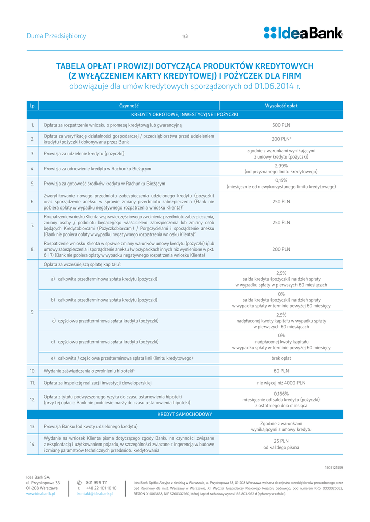 Duma Przedsiębiorcy 1/3 TABELA OPŁAT I PROWIZJI dOTycZącA PROdukTóW kREdyTOWych (Z WyŁącZEnIEm kARTy kREdyTOWEJ) I POŻycZEk dLA FIRm obowiązuje dla umów kredytowych sporządzonych od 01.06.2014 r. Lp. Czynność Wysokość opłat KREDYTY OBROTOWE, INWESTYCYJNE I POŻYCZKI 1. Opłata za rozpatrzenie wniosku o promesę kredytową lub gwarancyjną 500 PLN 2. Opłata za weryfikację działalności gospodarczej / przedsiębiorstwa przed udzieleniem kredytu (pożyczki) dokonywana przez Bank 200 PLN1 3. Prowizja za udzielenie kredytu (pożyczki) 4. Prowizja za odnowienie kredytu w Rachunku Bieżącym 5. Prowizja za gotowość środków kredytu w Rachunku Bieżącym 6. Zweryfikowanie nowego przedmiotu zabezpieczenia udzielonego kredytu (pożyczki) oraz sporządzenie aneksu w sprawie zmiany przedmiotu zabezpieczenia (Bank nie pobiera opłaty w wypadku negatywnego rozpatrzenia wniosku Klienta)2 7. Rozpatrzenie wniosku Klienta w sprawie częściowego zwolnienia przedmiotu zabezpieczenia, zmiany osoby / podmiotu będącej/ego właścicielem zabezpieczenia lub zmiany osób będących Kredytobiorcami (Pożyczkobiorcami) / Poręczycielami i sporządzenie aneksu (Bank nie pobiera opłaty w wypadku negatywnego rozpatrzenia wniosku Klienta)2 8. Rozpatrzenie wniosku Klienta w sprawie zmiany warunków umowy kredytu (pożyczki) i/lub umowy zabezpieczenia i sporządzenie aneksu (w przypadkach innych niż wymienione w pkt. 6 i 7) (Bank nie pobiera opłaty w wypadku negatywnego rozpatrzenia wniosku Klienta) zgodnie z warunkami wynikającymi z umowy kredytu (pożyczki) 2,99% (od przyznanego limitu kredytowego) 0,15% (miesięcznie od niewykorzystanego limitu kredytowego) 250 PLN 250 PLN 200 PLN Opłata za wcześniejszą spłatę kapitału3: a) całkowita przedterminowa spłata kredytu (pożyczki) 2,5% salda kredytu (pożyczki) na dzień spłaty w wypadku spłaty w pierwszych 60 miesiącach b) całkowita przedterminowa spłata kredytu (pożyczki) 0% salda kredytu (pożyczki) na dzień spłaty w wypadku spłaty w terminie powyżej 60 miesięcy c) częściowa przedterminowa spłata kredytu (pożyczki) 2,5% nadpłaconej kwoty kapitału w wypadku spłaty w pierwszych 60 miesiącach d) częściowa przedterminowa spłata kredytu (pożyczki) 0% nadpłaconej kwoty kapitału w wypadku spłaty w terminie powyżej 60 miesięcy 9. e) całkowita / częściowa przedterminowa spłata linii (limitu kredytowego) 10. Wydanie zaświadczenia o zwolnieniu hipoteki4 11. Opłata za inspekcję realizacji inwestycji deweloperskiej 12. Opłata z tytułu podwyższonego ryzyka do czasu ustanowienia hipoteki (przy tej opłacie Bank nie podniesie marży do czasu ustanowienia hipoteki) brak opłat 60 PLN nie więcej niż 4000 PLN 0,166% miesięcznie od salda kredytu (pożyczki) z ostatniego dnia miesiąca KREDYT SAMOCHODOWY 13. Prowizja Banku (od kwoty udzielonego kredytu) 14. Wydanie na wniosek Klienta pisma dotyczącego zgody Banku na czynności związane z eksploatacją i użytkowaniem pojazdu, w szczególności związane z ingerencją w budowę i zmianę parametrów technicznych przedmiotu kredytowania Zgodnie z warunkami wynikającymi z umowy kredytu 25 PLN od każdego pisma 1505121559 Idea Bank SA ul. Przyokopowa 33 01-208 Warszawa www.ideabank.pl 801 999 111 +48 22 101 10 10 [email protected] T: Idea Bank Spółka Akcyjna z siedzibą w Warszawie, ul. Przyokopowa 33, 01-208 Warszawa, wpisana do rejestru przedsiębiorców prowadzonego przez Sąd Rejonowy dla m.st. Warszawy w Warszawie, XII Wydział Gospodarczy Krajowego Rejestru Sądowego, pod numerem KRS 0000026052, REGON 011063638, NIP 5260307560, której kapitał zakładowy wynosi 156 803 962 zł (opłacony w całości). Duma Przedsiębiorcy 15. 2/3 Sporządzenie aneksu w sprawie zmiany warunków umowy kredytu w tym również sporządzenie aneksu w sprawie zmiany przedmiotu zabezpieczenia (Bank nie pobiera opłaty w wypadku negatywnego rozpatrzenia wniosku Klienta) 250 PLN Opłata za wcześniejszą spłatę kapitału: 3% w wypadku spłaty w pierwszych 12 miesiącach a) całkowita przedterminowa spłata kredytu przed upływem 36 miesięcy od dnia zawarcia Umowy o kredyt (liczone od salda kredytu) 2% w wypadku spłaty w terminie powyżej 12 miesięcy do 24 miesięcy 1% w wypadku spłaty w terminie powyżej 24 miesięcy 16. 3% w wypadku spłaty w pierwszych 12 miesiącach b) częściowa przedterminowa spłata kredytu przed upływem 36 miesięcy od dnia zawarcia umowy o kredyt (liczone od kwoty nadpłaconej) 2% w wypadku spłaty w terminie powyżej 12 miesięcy do 24 miesięcy 1% w wypadku spłaty w terminie powyżej 24 miesięcy 17. Prolongata spłaty (okres dłuższy niż 1 miesiąc) 1% kwoty pozostałej do spłaty, nie mniej niż 200 PLN Opłaty wspólne DLA WSZYSTKICH KREDYTÓW i POŻYCZEK: 18. Sporządzenie opinii o kredycie (pożyczce) na wniosek Klienta 100 PLN 19. Wystawienie zaświadczenia na wniosek Klienta 70 PLN 20. Sporządzenie kopii dokumentów na wniosek Klienta 40 PLN 21. Ponowne sporządzenie harmonogramu spłaty kredytu (pożyczki) na wniosek Klienta 40 PLN 22. Sporządzenie historii spłaty kredytu (pożyczki) 40 PLN za bieżący rok, 80 PLN za każdy poprzedni rok, ale nie więcej niż 500 PLN 23. Wydanie zaświadczenia o zwolnieniu zastawu4 60 PLN 24. Sporządzenie uwierzytelnionych kopii lub odpisów dokumentów na wniosek Klienta 40 PLN 25. Opłata za kolejne wezwanie do spełnienia warunków wymaganych zgodnie z umową o kredyt (pożyczkę) 30 PLN 26. Opłata za kolejne wezwanie do dostarczenia dokumentów dotyczących sytuacji finansowo-ekonomicznej 30 PLN opłaty za Czynności restrukturyzacyjne, MONITORUJĄCE i windykacyjne5: 27. Wezwanie do zapłaty6, 7 28. Sporządzenie umowy o ugodę, porozumienia spłaty zadłużenia 1,5% wartości należności 29. Sporządzenie aneksu do umowy ugody 1,5% wartości należności 30. Opłata za wizytę terenową6, 7 31. Opłata za ustalenie adresu dłużnika 115,29 PLN 32. Opłata za wniosek o wyjawienie majątku 128,6