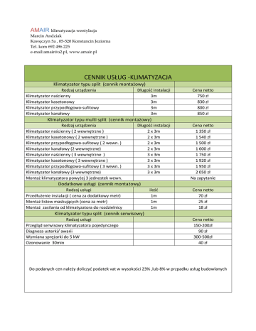 AMAIR klimatyzacja wentylacja Marcin Andziak Kawęczyn 5a , 05-520 Konstancin Jeziorna Tel. kom 692 496 225 e-mail:[email protected], www.amair.pl CENNIK USŁUG -KLIMATYZACJA Klimatyzator typu split (cennik montażowy) Rodzaj urządzenia Klimatyzator naścienny Klimatyzator kasetonowy Klimatyzator przypodłogowo-sufitowy Klimatyzator kanałowy Długość instalacji 3m 3m 3m 3m Cena netto 750 zł 830 zł 800 zł 850 zł Klimatyzator typu multi split (cennik montażowy) Rodzaj urządzenia Klimatyzator naścienny ( 2 wewnętrzne ) Klimatyzator kasetonowy ( 2 wewnętrzne ) Klimatyzator przypodłogowo-sufitowy ( 2 wewn. ) Klimatyzator kanałowy (2 wewnętrzne) Klimatyzator naścienny ( 3 wewnętrzne ) Klimatyzator kasetonowy ( 3 wewnętrzne ) Klimatyzator przypodłogowo-sufitowy ( 3 wewn. ) Klimatyzator kanałowy (3 wewnętrzne) Montaż klimatyzatora powyżej 3 jednostek wewn. Długość instalacji 2 x 3m 2 x 3m 2 x 3m 2 x 3m 3 x 3m 3 x 3m 3 x 3m 3 x 3m Cena netto 1 350 zł 1 540 zł 1 500 zł 1 600 zł 1 750 zł 1 920 zł 1 950 zł 2 050 zł Na zapytanie Dodatkowe usługi (cennik montażowy) Rodzaj usługi Przedłużenie instalacji ( cena za dodatkowy metr) Montaż listew maskujących (cena za metr) Montaż zasilania od klimatyzatora do rozdzielnicy ilość 1m 1m 1m Cena netto 70 zł 25 zł 18 zł Klimatyzator typu split (cennik serwisowy) Rodzaj usługi Przegląd serwisowy klimatyzatora pojedynczego Diagnoza usterki/ awarii Wymiana sprężarki do 5 kW Ozonowanie 30min Cena netto 150-200zł 90 zł 300-500zł 40 zł Do podanych cen należy doliczyć podatek vat w wysokości 23% ,lub 8% w przpadku usług budowlanych
