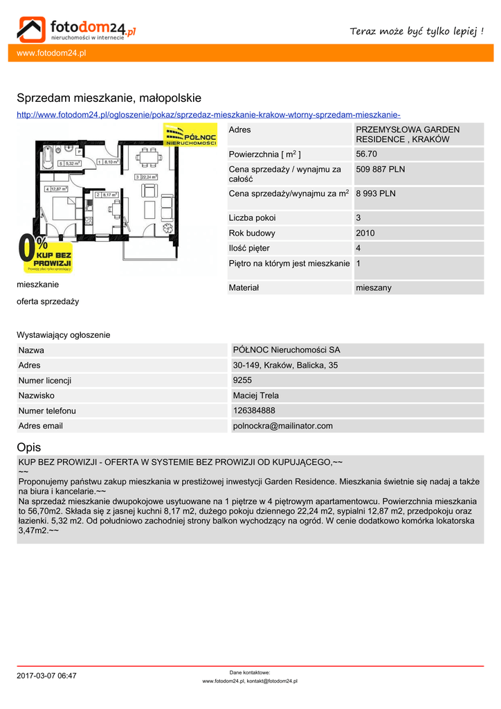 Teraz może być tylko lepiej ! www.fotodom24.pl Sprzedam mieszkanie, małopolskie http://www.fotodom24.pl/ogloszenie/pokaz/sprzedaz-mieszkanie-krakow-wtorny-sprzedam-mieszkanieAdres PRZEMYSŁOWA GARDEN RESIDENCE , KRAKÓW Powierzchnia [ m2 ] 56.70 Cena sprzedaży / wynajmu za całość 509 887 PLN Cena sprzedaży/wynajmu za m2 8 993 PLN Liczba pokoi 3 Rok budowy 2010 Ilość pięter 4 Piętro na którym jest mieszkanie 1 mieszkanie Materiał mieszany oferta sprzedaży Wystawiający ogłoszenie Nazwa PÓŁNOC Nieruchomości SA Adres 30-149, Kraków, Balicka, 35 Numer licencji 9255 Nazwisko Maciej Trela Numer telefonu 126384888 Adres email [email protected] Opis KUP BEZ PROWIZJI - OFERTA W SYSTEMIE BEZ PROWIZJI OD KUPUJĄCEGO,~~ ~~ Proponujemy państwu zakup mieszkania w prestiżowej inwestycji Garden Residence. Mieszkania świetnie się nadaj a także na biura i kancelarie.~~ Na sprzedaż mieszkanie dwupokojowe usytuowane na 1 piętrze w 4 piętrowym apartamentowcu. Powierzchnia mieszkania to 56,70m2. Składa się z jasnej kuchni 8,17 m2, dużego pokoju dziennego 22,24 m2, sypialni 12,87 m2, przedpokoju oraz łazienki. 5,32 m2. Od południowo zachodniej strony balkon wychodzący na ogród. W cenie dodatkowo komórka lokatorska 3,47m2.~~ 2017-03-07 06:47 Dane kontaktowe: www.fotodom24.pl, [email protected]
