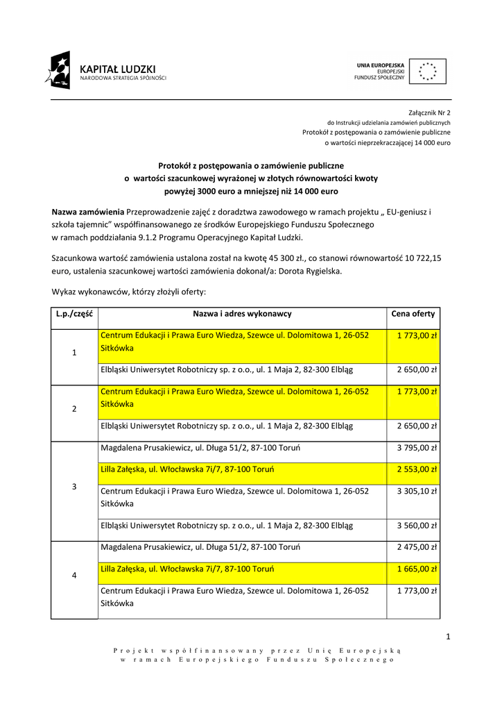 Załącznik Nr 2 do Instrukcji udzielania zamówień publicznych Protokół z postępowania o zamówienie publiczne o wartości nieprzekraczającej 14 000 euro Protokół z postępowania o zamówienie publiczne o wartości szacunkowej wyrażonej w złotych równowartości kwoty powyżej 3000 euro a mniejszej niż 14 000 euro Nazwa zamówienia Przeprowadzenie zajęć z doradztwa zawodowego w ramach projektu „ EU-geniusz i szkoła tajemnic” współfinansowanego ze środków Europejskiego Funduszu Społecznego w ramach poddziałania 9.1.2 Programu Operacyjnego Kapitał Ludzki. Szacunkowa wartość zamówienia ustalona został na kwotę 45 300 zł., co stanowi równowartość 10 722,15 euro, ustalenia szacunkowej wartości zamówienia dokonał/a: Dorota Rygielska. Wykaz wykonawców, którzy złożyli oferty: L.p./część 1 2 3 4 Nazwa i adres wykonawcy Cena oferty Centrum Edukacji i Prawa Euro Wiedza, Szewce ul. Dolomitowa 1, 26-052 Sitkówka 1 773,00 zł Elbląski Uniwersytet Robotniczy sp. z o.o., ul. 1 Maja 2, 82-300 Elbląg 2 650,00 zł Centrum Edukacji i Prawa Euro Wiedza, Szewce ul. Dolomitowa 1, 26-052 Sitkówka 1 773,00 zł Elbląski Uniwersytet Robotniczy sp. z o.o., ul. 1 Maja 2, 82-300 Elbląg 2 650,00 zł Magdalena Prusakiewicz, ul. Długa 51/2, 87-100 Toruń 3 795,00 zł Lilla Załęska, ul. Włocławska 7i/7, 87-100 Toruń 2 553,00 zł Centrum Edukacji i Prawa Euro Wiedza, Szewce ul. Dolomitowa 1, 26-052 Sitkówka 3 305,10 zł Elbląski Uniwersytet Robotniczy sp. z o.o., ul. 1 Maja 2, 82-300 Elbląg 3 560,00 zł Magdalena Prusakiewicz, ul. Długa 51/2, 87-100 Toruń 2 475,00 zł Lilla Załęska, ul. Włocławska 7i/7, 87-100 Toruń 1 665,00 zł Centrum Edukacji i Prawa Euro Wiedza, Szewce ul. Dolomitowa 1, 26-052 Sitkówka 1 773,00 zł 1 P r o j e k t w s p ó ł f i n a n s o w a n y p r z e z U n i ę E u r o p e j s k ą w r a m a c h E u r o p e j s k i e g o F u n d u s z u S p o ł e c z n e g o 5 6 7 8 9 10 Elbląski Uniwersytet Robotniczy sp. z o.o., ul. 1 Maja 2, 82-300 Elbląg 2 850,00 zł Agnieszka Pankowska, ul. Rydygiera 17A/16, 87-100 Toruń 2 530,00 zł Lilla Załęska, ul. Włocławska 7i/7, 87-100 Toruń 1 702,00 zł Centrum Edukacji i Prawa Euro Wiedza, Szewce ul. Dolomitowa 1, 26-052 Sitkówka 1 812,40 zł Elbląski Uniwersytet Robotniczy sp. z o.o., ul. 1 Maja 2, 82-300 Elbląg 2 540,00 zł Anna Jankowska, Mierzynek 36, 87-162 Lubicz 1 680,00 zł Lilla Załęska, ul. Włocławska 7i/7, 87-100 Toruń 1 110,00 zł Centrum Edukacji i Prawa Euro Wiedza, Szewce ul. Dolomitowa 1, 26-052 Sitkówka 1 182,00 zł Elbląski Uniwersytet Robotniczy sp. z o.o., ul. 1 Maja 2, 82-300 Elbląg 2 000,00 zł Janusz Drapała, ul. Dworcowa 27A, 87-162 Lubicz 4 800,00 zł Centrum Edukacji i Prawa Euro Wiedza, Szewce ul. Dolomitowa 1, 26-052 Sitkówka 3 152,00 zł Elbląski Uniwersytet Robotniczy sp. z o.o., ul. 1 Maja 2, 82-300 Elbląg 4 000,00 zł Janusz Drapała, ul. Dworcowa 27A, 87-162 Lubicz 1 200,00 zł Centrum Edukacji i Prawa Euro Wiedza, Szewce ul. Dolomitowa 1, 26-052 Sitkówka 958,00 zł Elbląski Uniwersytet Robotniczy sp. z o.o., ul. 1 Maja 2, 82-300 Elbląg 1 600,00 zł Monika Trawińska, ul. Gajowa 10, 87-100 Toruń 3 000,00 zł Centrum Edukacji i Prawa Euro Wiedza, Szewce ul. Dolomitowa 1, 26-052 Sitkówka 1 970,00 zł Elbląski Uniwersytet Robotniczy sp. z o.o., ul. 1 Maja 2, 82-300 Elbląg 2 500,00 zł Katarzyna Kołtun, Gronowo 28, 87-162 Lubicz 1 740,00 zł Lilla Załęska, ul. Włocławska 7i/7, 87-100 Toruń 1 110,00 zł Centrum Edukacji i Prawa Euro Wiedza, Szewce ul. Dolomitowa 1, 26-052 1 437,00 zł 2 P r o j e k t w s p ó ł f i n a n s o w a n y p r z e z U n i ę E u r o p e j s k ą w r a m a c h E u r o p e j s k i e g o F u n d u s z u S p o ł e c z n e g o Sitkówka 11 12 13 Elbląski Uniwersytet Robotniczy sp. z o.o., ul. 1 Maja 2, 82-300 Elbląg 1 940,00 zł Renata Krasińska, ul. Toruńska 13,87-640 Czernikowo 1 740,00 zł Lilla Załęska, ul. Włocławska 7i/7, 87-100 Toruń 1 110,00 zł Centrum Edukacji i Prawa Euro Wiedza, Szewce ul. Dolomitowa 1, 26-052 Sitkówka 1 182,00 zł Elbląski Uniwersytet Robotniczy sp. z o.o., ul. 1 Maja 2, 82-300 Elbląg 1 960,00 zł Anna Borowicz, Młyniec Pierwszy ul. Słoneczna 10a, 87-162 Lubicz 6 300,00 zł Lilla Załęska, ul. Włocławska 7i/7, 87-100 Toruń 3 885,00 zł Centrum Edukacji i Prawa Euro Wiedza, Szewce ul. Dolomitowa 1, 26-052 Sitkówka 5 029,50 zł Elbląski Uniwersytet Robotniczy sp. z o.o., ul. 1 Maja 2, 82-300 Elbląg 6 200,00 zł Centrum Edukacji i Prawa Euro Wiedza, Szewce ul. Dolomitowa 1, 26-052 Sitkówka 6 304,00 zł Elbląski Uniwersytet Robotniczy sp. z o.o., ul. 1 Maja 2, 82-300 Elbląg 8 400,00 zł W wyniku przeprowadzonego postępowania wybrano ofertę: Centrum Edukacji i Prawa Euro Wiedza, Szewce ul. Dolomitowa 1, 26-052 Sitkówka na części nr: 1,2,7,8,9,13 oraz Lilla Załęska, ul. Włocławska 7i/7, 87-100 Toruń na części nr: 3,4,5,6,10,11,12 (zaznaczono kolorem żółtym w powyższej tabeli). Uzasadnienie wyboru oferty: Wyłonieni Oferenci dysponują odpowiednim do oczekiwań Zamawiającego doświadczeniem oraz złożyli najkorzystniejsze oferty cenowe, które miesza się w założeniach budżetowych projektu. Dokumentację sporządziła: Dorota Rygielska. ……………………………… podpis osoby przygotowującej postępowanie 3 P r o j e k t w s p ó ł f i n a n s o w a n y p r z e z U n i ę E u r o p e j s k ą w r a m a c h E u r o p e j s k i e g o F u n d u s z u S p o ł e c z n e g o