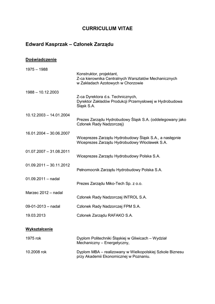 CURRICULUM VITAE Edward Kasprzak – Członek Zarządu Doświadczenie 1975 – 1988 Konstruktor, projektant, Z-ca kierownika Centralnych Warsztatów Mechanicznych w Zakładach Azotowych w Chorzowie 1988 – 10.12.2003 Z-ca Dyrektora d.s. Technicznych, Dyrektor Zakładów Produkcji Przemysłowej w Hydrobudowa Śląsk S.A. 10.12.2003 – 14.01.2004 Prezes Zarządu Hydrobudowy Śląsk S.A. (oddelegowany jako Członek Rady Nadzorczej) 16.01.2004 – 30.06.2007 Wiceprezes Zarządu Hydrobudowy Śląsk S.A., a następnie Wiceprezes Zarządu Hydrobudowy Włocławek S.A. 01.07.2007 – 31.08.2011 Wiceprezes Zarządu Hydrobudowy Polska S.A. 01.09.2011 – 30.11.2012 Pełnomocnik Zarządu Hydrobudowy Polska S.A. 01.09.2011 – nadal Prezes Zarządu Miko-Tech Sp. z o.o. Marzec 2012 – nadal Członek Rady Nadzorczej INTROL S.A. 09-01-2013 – nadal Członek Rady Nadzorczej FPM S.A. 19.03.2013 Członek Zarządu RAFAKO S.A. Wykształcenie 1975 rok Dyplom Politechniki Śląskiej w Gliwicach – Wydział Mechaniczny – Energetyczny, 10.2008 rok Dyplom MBA – realizowany w Wielkopolskiej Szkole Biznesu przy Akademii Ekonomicznej w Poznaniu.