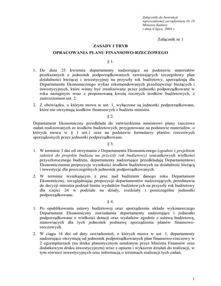 Załączniki do Instrukcji wprowadzonej zarządzeniem Nr 18 Ministra Kultury z dnia 6 lipca. 2004 r. Załącznik nr 1 ZASADY I TRYB OPRACOWANIA PLANU FINANSOWO-RZECZOWEGO § 1. 1. Do dnia 25 kwietnia departamenty nadzorujące na podstawie materiałów przekazanych z jednostek podporządkowanych zawierających szczegółowy plan działalności bieżącej i inwestycyjnej na przyszły rok budżetowy, sporządzają dla Departamentu Ekonomicznego wykaz rekomendowanych przedsięwzięć bieżących i inwestycyjnych, które winny być zrealizowane przez jednostki podporządkowane w roku następnym wraz z proponowaną kwotą rocznych środków budżetowych, z zastrzeżeniem ust. 2. 2. Z obowiązku, o którym mowa w ust. 1, wyłączone są jednostki podporządkowane, które nie otrzymują środków finansowych z budżetu ministra. § 2. Departament Ekonomiczny przedkłada do zatwierdzenia ministrowi plany rzeczowe zadań realizowanych ze środków budżetowych, przygotowane na podstawie materiałów, o których mowa w § 1 ust.1 oraz na podstawie formularzy planów rzeczowych sporządzonych przez jednostki podporządkowane. § 3. 1. W terminie 3 dni od otrzymania z Departamentu Ekonomicznego (zgodnie z projektem założeń do projektu budżetu na przyszły rok budżetowy) szacunkowych wielkości przyszłorocznego budżetu, departamenty nadzorujące przedkładają Departamentowi Ekonomicznemu propozycje wysokości środków budżetowych na działalność bieżącą i inwestycje dla poszczególnych jednostek podporządkowanych. 2. W terminie wynikającym z prac nad budżetem danego roku Departament Ekonomiczny, uwzględniając propozycje departamentów nadzorujących, przedstawia do decyzji ministra podział limitu wydatków budżetowych na przyszły rok budżetowy dla części 24 w podziale na działy, rozdziały i poszczególne jednostki podporządkowane. § 4. 1. Po opublikowaniu ustawy budżetowej oraz sporządzeniu układu wykonawczego Departament Ekonomiczny zawiadamia departamenty nadzorujące i jednostki podporządkowane o wielkości dotacji oraz wydatków zgodnie z ustawą budżetową, stanowiących dla tych jednostek podstawę sporządzenia planów finansoworzeczowych. 2. W ciągu 14 dni od daty zawiadomień, o których mowa w ust. 1, departamenty nadzorujące otrzymują od jednostek podporządkowanych plan finansowo-rzeczowy w 2 egzemplarzach (na druku planistycznym ustalonym przez Ministra Finansów oraz dodatkowym druku inwestycyjnym) wraz z opisem i wykazem działań do realizacji, w tym również inwestycyjnych oraz informacją o terminach realizacji tych zadań. 1 3. Po zaakceptowaniu przez dyrektora departamentu nadzorującego, a w przypadku państwowych instytucji filmowych po zatwierdzeniu przez ministra, indywidualnych planów finansowo-rzeczowych sporządzonych przez jednostki podporządkowane, departamenty nadzorujące przesyłają – w ciągu kolejnych 7 dni – jeden egzemplarz planu do Departamentu Ekonomicznego. 4. Ustalony zgodnie z ust. 2 i 3, plan finansowo-rzeczowy podporządkowanych jest podstawą oceny, o której mowa w instrukcji. jednostek § 5. Wszelkie zmiany w stosunku do powyższych ustaleń wymagają zachowania trybu i formy przewidzianej prawem oraz procedur ustalonych w instrukcji. 2