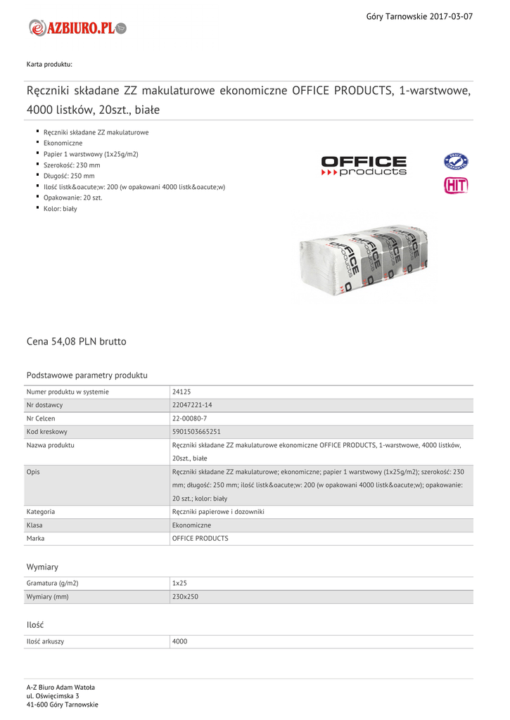 Góry Tarnowskie 2017-03-07 Karta produktu: Ręczniki składane ZZ makulaturowe ekonomiczne OFFICE PRODUCTS, 1-warstwowe, 4000 listków, 20szt., białe Ręczniki składane ZZ makulaturowe Ekonomiczne Papier 1 warstwowy (1x25g/m2) Szerokość: 230 mm Długość: 250 mm Ilość listków: 200 (w opakowani 4000 listków) Opakowanie: 20 szt. Kolor: biały Cena 54,08 PLN brutto Podstawowe parametry produktu Numer produktu w systemie 24125 Nr dostawcy 22047221-14 Nr Celcen 22-00080-7 Kod kreskowy 5901503665251 Nazwa produktu Ręczniki składane ZZ makulaturowe ekonomiczne OFFICE PRODUCTS, 1-warstwowe, 4000 listków, 20szt., białe Opis Ręczniki składane ZZ makulaturowe; ekonomiczne; papier 1 warstwowy (1x25g/m2); szerokość: 230 mm; długość: 250 mm; ilość listków: 200 (w opakowani 4000 listków); opakowanie: 20 szt.; kolor: biały Kategoria Ręczniki papierowe i dozowniki Klasa Ekonomiczne Marka OFFICE PRODUCTS Wymiary Gramatura (g/m2) 1x25 Wymiary (mm) 230x250 Ilość Ilość arkuszy A-Z Biuro Adam Watoła ul. Oświęcimska 3 41-600 Góry Tarnowskie 4000 Góry Tarnowskie 2017-03-07 Karta katalogowa produktu cd. Ręczniki składane ZZ makulaturowe ekonomiczne OFFICE PRODUCTS, 1-warstwowe, 4000 listków, 20szt., białe Cecha Produkt Ręczniki składane zz W ofercie od 2015-01 Typ 1-warstwowy Materiał Papier Wspólny słownik zamówień CPV 33763000-6 Certyfikaty Nowy produkt w ofercie Standard Hit Standard Kolor Kolor Serdecznie zapraszamy do współpracy A-Z Biuro Adam Watoła zespół. A-Z Biuro Adam Watoła ul. Oświęcimska 3 41-600 Góry Tarnowskie Biały