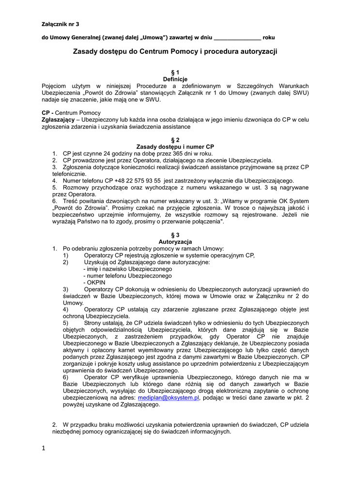 Załącznik nr 3 do Umowy Generalnej (zwanej dalej „Umową”) zawartej w dniu ______________ roku Zasady dostępu do Centrum Pomocy i procedura autoryzacji §1 Definicje Pojęciom użytym w niniejszej Procedurze a zdefiniowanym w Szczególnych Warunkach Ubezpieczenia „Powrót do Zdrowia” stanowiących Załącznik nr 1 do Umowy (zwanych dalej SWU) nadaje się znaczenie, jakie mają one w SWU. CP - Centrum Pomocy Zgłaszający – Ubezpieczony lub każda inna osoba działająca w jego imieniu dzwoniąca do CP w celu zgłoszenia zdarzenia i uzyskania świadczenia assistance §2 Zasady dostępu i numer CP 1. CP jest czynne 24 godziny na dobę przez 365 dni w roku. 2. CP prowadzone jest przez Operatora, działającego na zlecenie Ubezpieczyciela. 3. Zgłoszenia dotyczące konieczności realizacji świadczeń assistance przyjmowane są przez CP telefonicznie. 4. Numer telefonu CP +48 22 575 93 55 jest zastrzeżony wyłącznie dla Ubezpieczającego. 5. Rozmowy przychodzące oraz wychodzące z numeru wskazanego w ust. 3 są nagrywane przez Operatora. 6. Treść powitania dzwoniących na numer wskazany w ust. 3: „Witamy w programie OK System „Powrót do Zdrowia”. Prosimy czekać na przyjęcie zgłoszenia. W trosce o najwyższą jakość i bezpieczeństwo uprzejmie informujemy, że wszystkie rozmowy są rejestrowane. Jeżeli nie wyrażają Państwo na to zgody, prosimy o przerwanie połączenia". §3 Autoryzacja 1. Po odebraniu zgłoszenia potrzeby pomocy w ramach Umowy: 1) Operatorzy CP rejestrują zgłoszenie w systemie operacyjnym CP, 2) Uzyskują od Zgłaszającego dane autoryzacyjne: - imię i nazwisko Ubezpieczonego - numer telefonu Ubezpieczonego - OKPIN 3) Operatorzy CP dokonują w odniesieniu do Ubezpieczonych autoryzacji uprawnień do świadczeń w Bazie Ubezpieczonych, której mowa w Umowie oraz w Załączniku nr 2 do Umowy. 4) Operatorzy CP ustalają czy zdarzenie zgłaszane przez Zgłaszającego objęte jest ochroną Ubezpieczyciela. 5) Strony ustalają, że CP udziela świadczeń tylko w odniesieniu do tych Ubezpieczonych objętych odpowiedzialnością Ubezpieczyciela, których dane znajdują się w Bazie Ubezpieczonych, z zastrzeżeniem przypadków, gdy Operator CP nie znajduje Ubezpieczonego w Bazie Ubezpieczonych a Zgłaszający deklaruje, że Ubezpieczony posiada aktywny i opłacony karnet wyemitowany przez Ubezpieczającego lub tylko część danych podanych przez Zgłaszającego jest zgodna z danymi zawartymi w Bazie Ubezpieczonych. CP zorganizuje i pokryje koszty usług assistance po uprzednim potwierdzeniu z Ubezpieczającym uprawnienia do świadczeń Ubezpieczonego. 6) Operator CP weryfikuje uprawnienia Ubezpieczonego, którego danych nie ma w Bazie Ubezpieczonych lub którego dane różnią się od danych zawartych w Bazie Ubezpieczonych, wysyłając do Ubezpieczającego drogą elektroniczną zapytanie o ochronę ubezpieczeniową na adres: [email protected], podając w treści dane zawarte w pkt. 2 powyżej uzyskane od Zgłaszającego. 2. W przypadku braku możliwości uzyskania potwierdzenia uprawnień do świadczeń, CP udziela niezbędnej pomocy ograniczającej się do świadczeń informacyjnych. 1