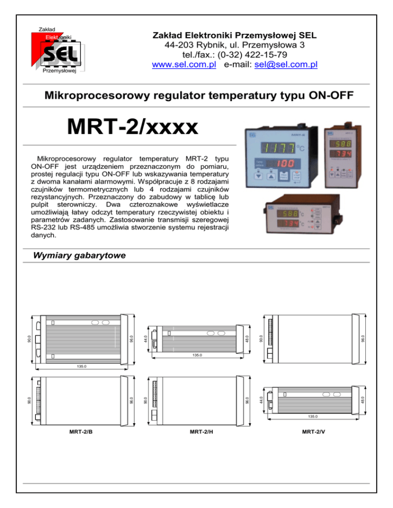 Zakład Zakład Elektroniki Przemysłowej SEL 44-203 Rybnik, ul. Przemysłowa 3 tel./fax.: (0-32) 422-15-79 www.sel.com.pl e-mail: [email protected] Elekt roniki Przemysłowej Mikroprocesorowy regulator temperatury typu ON-OFF MRT-2/xxxx Mikroprocesorowy regulator temperatury MRT-2 typu ON-OFF jest urządzeniem przeznaczonym do pomiaru, prostej regulacji typu ON-OFF lub wskazywania temperatury z dwoma kanałami alarmowymi. Współpracuje z 8 rodzajami czujników termometrycznych lub 4 rodzajami czujników rezystancyjnych. Przeznaczony do zabudowy w tablicę lub pulpit sterowniczy. Dwa czteroznakowe wyświetlacze umożliwiają łatwy odczyt temperatury rzeczywistej obiektu i parametrów zadanych. Zastosowanie transmisji szeregowej RS-232 lub RS-485 umożliwia stworzenie systemu rejestracji danych. 90.0 44.0 96.0 48.0 96.0 44.0 96.0 90.0 Wymiary gabarytowe 135.0 48.0 90.0 96.0 90.0 135.0 135.0 MRT-2/B MRT-2/H MRT-2/V Podstawowe cechy !"automatyczna kompensacja zimnego końca termopary (MRT-2/xT); !"kontrola przekroczenia zakresu pomiarowego; !"kontrola rozwarcia obwodu czujnika; !"kontrola odwrotnej polaryzacji termopary (MRT-2/xT); !"ustawiana histereza dla każdego wyjścia; !"pamięć startu; !"programowanie konwencji działania styków przekaźnika (normalnie zwarty lub rozwarty); !"8 rodzajów termopar wybieranych za pomocą odpowiedniej kombinacji trzech przełączników (MRT-2/xT); !"4 rodzaje czujników oporowych wybieranych za pomocą dwóch przełączników (MRT-2/xR); !"linia 2- lub 3- przewodowa (czujnika oporowego) z pełną kompensacją rezystancji linii oraz zmian rezystancji linii wraz ze zmianą temperatury (MRT-2/xR); !"transmisja szeregowa RS-232 lub RS-485 (opcjonalnie). Dane techniczne • • • • • • • • • • • • Zakres mierzonych temperatur Błąd wskazań temperatury: - typowy maksymalny Temperatura pracy Zakres ustawianej histerezy Ilość wejść pomiarowych Ilość wyjść sterujących Rodzaj wyjść sterujących z przekaźnikiem - bez przekaźnika Zasilanie Rodzaje możliwych termopar Rodzaje możliwych czujników oporowych Wysokość cyfr wyświetlacza: - temperatury rzeczywistej - parametrów zadanych Obudowa - wykonanie - wymiary – 0 ÷ 1800°C (w zależności od użytego czujnika) – – – – – – +/- 1°C +/- 2°C -30 ÷ 70°C 1 ÷ 100°C 1 2 – – – – – styk przełączny, 220VAC, 2,5A otwarty kolektor 300mA, 30V 90 ÷ 230VAC, 50Hz B, E, J, K, N, R, S, T (MRT-2/xT) Pt100, Ni100, Cu100, Pt1000 (MRT-2/xR) – – 14,2mm (MRT-2/Bx), 8mm (MRT-2/Vx, MRT-2/Hx) 9,9mm (MRT-2/Bx), 8mm (MRT-2/Vx, MRT-2/Hx) – – NORYL UL 94 V-0 na rysunku Oznaczenie MRT - 2 / x x x x Rodzaj transmisji 0 - brak 2 - RS-232 4 - RS-485 Rodzaj wyjść P - przekaźnik C - otwarty kolektor Rodzaj czujników T - termopary R - oporowe Rodzaj obudowy B - duża H - pozioma mała V - pionowa mała Przykład oznaczenia: MRT – 2/BTC2 – mikroprocesorowy regulator temperatury typu ON-OFF, umieszczony w dużej obudowie, przeznaczony do współpracy z 8 rodzajami termopar, z 2 wyjściami typu otwarty kolektor i transmisją RS-232