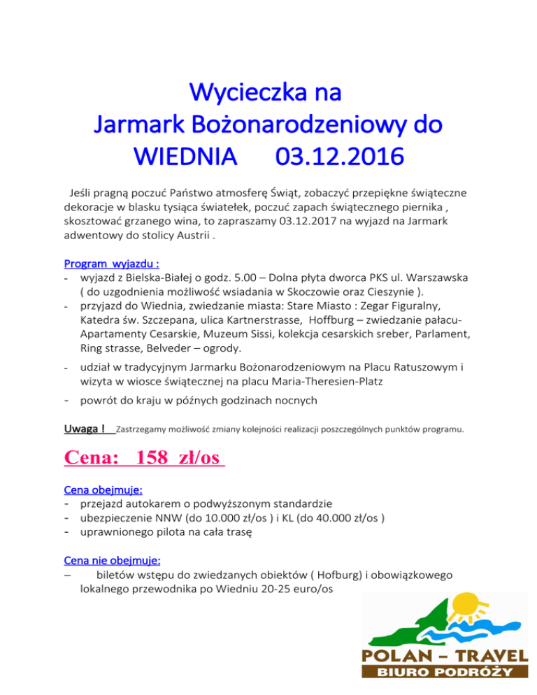 Wycieczka na Jarmark Bożonarodzeniowy do WIEDNIA 03.12.2016 Jeśli pragną poczuć Państwo atmosferę Świąt, zobaczyć przepiękne świąteczne dekoracje w blasku tysiąca światełek, poczuć zapach świątecznego piernika , skosztować grzanego wina, to zapraszamy 03.12.2017 na wyjazd na Jarmark adwentowy do stolicy Austrii . Program wyjazdu : - wyjazd z Bielska-Białej o godz. 5.00 – Dolna płyta dworca PKS ul. Warszawska ( do uzgodnienia możliwość wsiadania w Skoczowie oraz Cieszynie ). - przyjazd do Wiednia, zwiedzanie miasta: Stare Miasto : Zegar Figuralny, Katedra św. Szczepana, ulica Kartnerstrasse, Hoffburg – zwiedzanie pałacuApartamenty Cesarskie, Muzeum Sissi, kolekcja cesarskich sreber, Parlament, Ring strasse, Belveder – ogrody. - udział w tradycyjnym Jarmarku Bożonarodzeniowym na Placu Ratuszowym i wizyta w wiosce świątecznej na placu Maria-Theresien-Platz - powrót do kraju w późnych godzinach nocnych Uwaga ! Zastrzegamy możliwość zmiany kolejności realizacji poszczególnych punktów programu. Cena: 158 zł/os Cena obejmuje: - przejazd autokarem o podwyższonym standardzie - ubezpieczenie NNW (do 10.000 zł/os ) i KL (do 40.000 zł/os ) - uprawnionego pilota na cała trasę Cena nie obejmuje: biletów wstępu do zwiedzanych obiektów ( Hofburg) i obowiązkowego lokalnego przewodnika po Wiedniu 20-25 euro/os