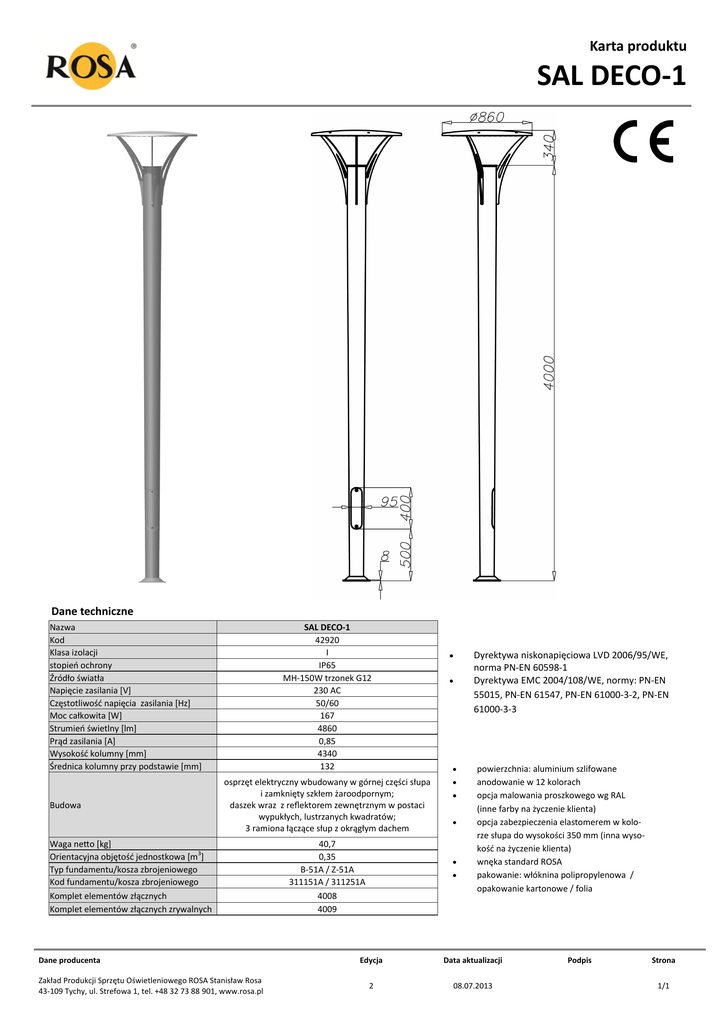 Karta produktu SAL DECO-1 Dane techniczne Nazwa Kod Klasa izolacji stopień ochrony Źródło światła Napięcie zasilania [V] Częstotliwość napięcia zasilania [Hz] Moc całkowita [W] Strumień świetlny [lm] Prąd zasilania [A] Wysokość kolumny [mm] Średnica kolumny przy podstawie [mm] Budowa SAL DECO-1 42920 I IP65 MH-150W trzonek G12 230 AC 50/60 167 4860 0,85 4340 132 osprzęt elektryczny wbudowany w górnej części słupa i zamknięty szkłem żaroodpornym; daszek wraz z reflektorem zewnętrznym w postaci wypukłych, lustrzanych kwadratów; 3 ramiona łączące słup z okrągłym dachem Waga netto [kg] Orientacyjna objętość jednostkowa [m3] Typ fundamentu/kosza zbrojeniowego Kod fundamentu/kosza zbrojeniowego Komplet elementów złącznych Komplet elementów złącznych zrywalnych Dane producenta Zakład Produkcji Sprzętu Oświetleniowego ROSA Stanisław Rosa 43-109 Tychy, ul. Strefowa 1, tel. +48 32 73 88 901, www.rosa.pl 40,7 0,35 B-51A / Z-51A 311151A / 311251A 4008 4009 Dyrektywa niskonapięciowa LVD 2006/95/WE, norma PN-EN 60598-1 Dyrektywa EMC 2004/108/WE, normy: PN-EN 55015, PN-EN 61547, PN-EN 61000-3-2, PN-EN 61000-3-3 powierzchnia: aluminium szlifowane anodowanie w 12 kolorach opcja malowania proszkowego wg RAL (inne farby na życzenie klienta) opcja zabezpieczenia elastomerem w kolorze słupa do wysokości 350 mm (inna wysokość na życzenie klienta) wnęka standard ROSA pakowanie: włóknina polipropylenowa / opakowanie kartonowe / folia Edycja Data aktualizacji 2 08.07.2013 Podpis Strona 1/1