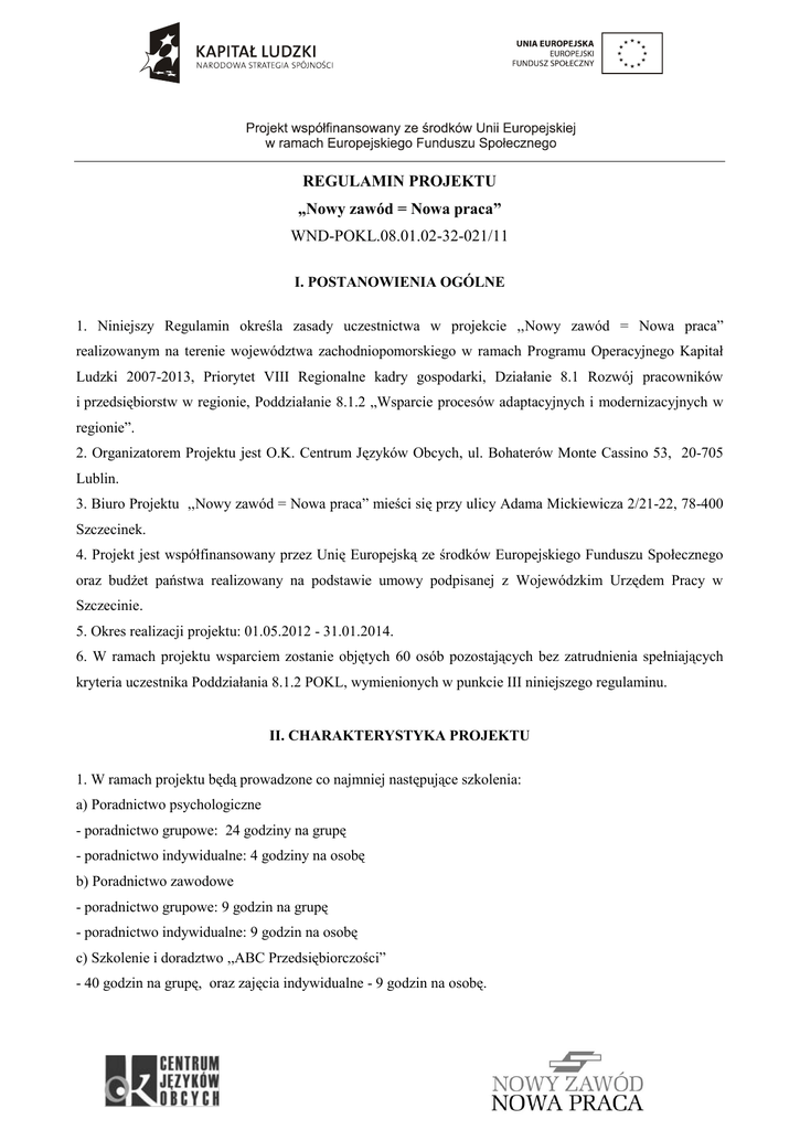 REGULAMIN PROJEKTU „Nowy zawód = Nowa praca” WND-POKL.08.01.02-32-021/11 I. POSTANOWIENIA OGÓLNE 1. Niniejszy Regulamin określa zasady uczestnictwa w projekcie ,,Nowy zawód = Nowa praca” realizowanym na terenie województwa zachodniopomorskiego w ramach Programu Operacyjnego Kapitał Ludzki 2007-2013, Priorytet VIII Regionalne kadry gospodarki, Działanie 8.1 Rozwój pracowników i przedsiębiorstw w regionie, Poddziałanie 8.1.2 „Wsparcie procesów adaptacyjnych i modernizacyjnych w regionie”. 2. Organizatorem Projektu jest O.K. Centrum Języków Obcych, ul. Bohaterów Monte Cassino 53, 20-705 Lublin. 3. Biuro Projektu ,,Nowy zawód = Nowa praca” mieści się przy ulicy Adama Mickiewicza 2/21-22, 78-400 Szczecinek. 4. Projekt jest współfinansowany przez Unię Europejską ze środków Europejskiego Funduszu Społecznego oraz budżet państwa realizowany na podstawie umowy podpisanej z Wojewódzkim Urzędem Pracy w Szczecinie. 5. Okres realizacji projektu: 01.05.2012 - 31.01.2014. 6. W ramach projektu wsparciem zostanie objętych 60 osób pozostających bez zatrudnienia spełniających kryteria uczestnika Poddziałania 8.1.2 POKL, wymienionych w punkcie III niniejszego regulaminu. II. CHARAKTERYSTYKA PROJEKTU 1. W ramach projektu będą prowadzone co najmniej następujące szkolenia: a) Poradnictwo psychologiczne - poradnictwo grupowe: 24 godziny na grupę - poradnictwo indywidualne: 4 godziny na osobę b) Poradnictwo zawodowe - poradnictwo grupowe: 9 godzin na grupę - poradnictwo indywidualne: 9 godzin na osobę c) Szkolenie i doradztwo ,,ABC Przedsiębiorczości” - 40 godzin na grupę, oraz zajęcia indywidualne - 9 godzin na osobę. d) Szkolenie zawodowe (do wyboru przez UP) – 180 godzin na grupę Kadry i płace Grafik komputerowy Przedstawiciel handlowy Fryzjer e) Staż u przedsiębiorcy – okres 3 miesiące, 40 godzin na tydzień, 8 godzin dziennie. III. KRYTERIA UCZESTNICTWA W PROJEKCIE 1. Profil Beneficjenta: a) W projekcie mogą uczestniczyć osoby pozostające bez zatrudnienia, zarejestrowane w Urzędzie Pracy jako osoby bezrobotne, które utraciły pracę w okresie nie dłuższym, niż 6 miesięcy przed dniem przystąpienia do projektu z przyczyn dotyczących zakładu pracy1 przechodzących procesy adaptacyjne i modernizacyjne2 mających jednostkę organizacyjną na obszarze województwa zachodniopomorskiego. b) Ponadto muszą być to osoby zamieszkujące lub uczące się na terenie woj. zachodniopomorskiego i chcące zmienić swoje kwalifikacje zawodowe. c) W celu spełnienia kryterium równości szans – priorytetowo będą kwalifikowane kobiety (min. 60 % UP). 1 Zwolnienie z przyczyn dotyczących zakładu pracy należy rozumieć jako: - rozwiązanie stosunku pracy lub stosunku służbowego z przyczyn niedotyczących pracowników, zgodnie z przepisami o szczególnych zasadach rozwiązywania z pracownikami stosunków pracy z przyczyn niedotyczących pracowników lub zgodnie z przepisami Kodeksu Pracy, w przypadku rozwiązania stosunku pracy lub stosunku służbowego z tych przyczyn u pracodawcy zatrudniającego mniej niż 20 pracowników, - rozwiązanie stosunku pracy lub stosunku służbowego z powodu ogłoszenia upadłości pracodawcy, jego likwidacji lub likwidacji stanowiska pracy z przyczyn ekonomicznych, organizacyjnych, produkcyjnych albo technologicznych, - wygaśnięcia stosunku pracy lub stosunku służbowego w przypadku śmierci pracodawcy lub gdy odrębne przepisy przewidują wygaśnięcie stosunku pracy lub stosunku służbowego w wyniku przejścia zakładu pracy lub jego części na innego pracodawcę i niezaproponowania przez tego pracodawcę nowych warunków pracy i płacy, rozwiązanie stosunku pracy przez pracownika na podstawie art. 55 § 1¹ Kodeksy Pracy z uwagi na ciężkie naruszenie podstawowych obowiązków wobec pracownika - Zgodnie z art. 2 ust. 1 pkt 29 ustawy z dnia 20 kwietnia 2004 r. o promocji zatrudnienia i instytucjach rynku pracy ( Dz.U. z 2008 r. Nr 69, poz. 415) 2 Z procesami adaptacyjnymi i modernizacyjnymi zakład ma do czynienia np. wówczas, gdy zmienia on profil działalności (np. poprzez zmianę branży, w której działa), rozpoczyna prowadzenie działalności eksportowej, zasadniczo zmienia strukturę organizacyjną, przechodzi proces prywatyzacji, dokonuje outsourcingu znacznej części dotychczasowej działalności, czy wreszcie dokonuje zwolnień grupowych pracowników. Przedstawione przejawy procesów modernizacyjnych i adaptacyjnych należy traktować jako przykładowe. 2. Warunkiem zakwalifikowania do udziału w projekcie jest: a) Zapoznanie się z niniejszym regulaminem oraz złożenie kompletu dokumentów listownie lub osobiście w biurze projektu: - formularz zgłoszeniowy do projektu zawierający analizę motywacji, - oświadczenie o spełnianiu kryteriów grupy docelowej, - podpisanie oświadczenia o wyrażaniu zgody na przetwarzanie danych osobowych oraz deklaracji uczestnictwa w projekcie w dniu pierwszych zajęć. b) W/w dokumenty dostępne są na stronie www.nowyzawodnowapraca.pl lub w siedzibie Biura Projektu. c) Pozytywna ocena doradcy zawodowego, który oceniać będzie punktowo (1-3 pkt.) predyspozycje, motywację oraz potrzebę udziału w projekcie. Otrzymane punkty będą rozpatrywane oddzielnie dla każdej grupy – kobiet i mężczyzn. Do projekty wybrane zostaną osoby z największą ilością punktów(z tym, że priorytetowo będą traktowane kobiety). d) Rekrutacja do udziału w projekcie odbywać się będzie 3-etapowo i zostanie zawieszona w momencie zebrania 120 % osób spełniających kryteria uczestnictwa dla każdego etapu.. W przypadku większej ilości chętnych osób zostaną utworzone listy rezerwowe. e) Etapy rekrutacji będą przebiegały następująco: I etap – maj-czerwiec 2012 – dwie grupy średnio po 10 osób, II etap – listopad-grudzień 2012 - dwie grupy średnio po 10 osób, III etap – maj-czerwiec 2013– dwie grupy średnio po 10 osób. f) Rodzaj szkole