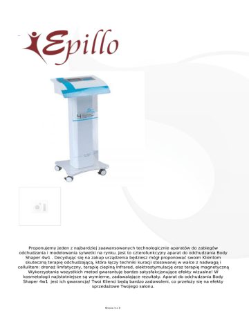Proponujemy jeden z najbardziej zaawansowanych technologicznie aparatów do zabiegów odchudzania i modelowania sylwetki na rynku. Jest to czterofunkcyjny aparat do odchudzania Body Shaper 4w1 . Decydując się na zakup urządzenia będziesz mógł proponować swoim Klientom skuteczną terapię odchudzającą, która łączy techniki kuracji stosowanej w walce z nadwagą i cellulitem: drenaż limfatyczny, terapię cieplną Infrared, elektrostymulację oraz terapię magnetyczną Wykorzystanie wszystkich metod gwarantuje bardzo satysfakcjonujące efekty wizualne! W kosmetologii najistotniejsze są wymierne, zadawalające rezultaty. Aparat do odchudzania Body Shaper 4w1 jest ich gwarancją! Twoi Klienci będą bardzo zadowoleni, co przełoży się na efekty sprzedażowe Twojego salonu. Strona 1 z 3 Funkcje: drenaż limfatyczny, terapia cieplna Infrared stymulacja prądowa (elektroskulyur) terapia magnetyczna Wiele zabiegów w jednym , Zabiegi wykonywane jednocześnie dają efekt ujędrnienia, rozbicia tkanki tłuszczowej oraz regeneracji tkanki łącznej, która wspomaga detoksykację i podnosi odporność organizmu. Połączenie w jednym zabiegu funkcji drenażu limfatycznego z elektroterapią, terapią cieplną infrared i magnetyczną daje bardzo trwały i skuteczny efekt odchudzania oraz modelowania sylwetki. Funkcje Terapii cieplnej Infrared i Elektroterapii typu „Elektroskultur” znakomicie się uzupełniają wywołując piorunujący efekt redukcji tkanki tłuszczowej szczególnie skuteczny przy leczeniu Cellulitu. Podczas jednego zabiegu następuje rozdrobnienie (emulgacja) tkanki tłuszczowej przy silnej penetracji specjalistycznych preparatów oraz usuwanie zemulgowanego tłuszczu przy pomocy drenażu uciskowego i działania magnesów. Zamiast fitness Aparat do odchudzania Body Shaper 4w1 skutecznie zastępuje ćwiczenia fitness. Skomputeryzowany system obsługi aparatu umożliwia wybór programu ćwiczeń i ich intensywność Selektywny dobór programu 1. Odchudzanie / slimming 1 / - czas 20 minut - intensywny drenaż, intensywne grzanie infrared oraz duża moc fal magnetycznych i stymulacji prądowej 2. Kształtowanie figury / slimming 2 / - czas 30 minut - mniej intensywne funkcje drenażu, infrared oraz fal magnetycznych i stymulacji prądowej. 3. Masaż / massage / - czas 45 minut - włączone funkcje: grzanie infrared, fale magnetyczne i stymulacja. /bez drenażu/ 4. Ćwiczenie / exercise / - czas 15 minut - włączone funkcje: drenaż limfatyczny, fale magnetyczne i stymulacja. /bez infrared/ Aparat umożliwia wykonywanie zabiegów na konkretne partie ciała: biodra, nogi lub ręce. Strona 2 z 3 Podczas zabiegu możemy decydować o intensywności zabiegu sterując ręcznie za pomocą funkcji „+ - „ lub je wyłączyć. Strona 3 z 3