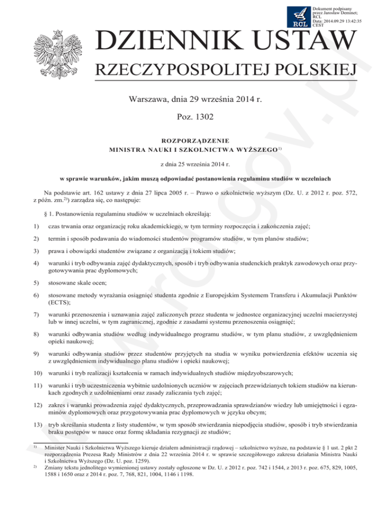 Dokument podpisany przez Jarosław Deminet; RCL Data: 2014.09.29 13:42:35 CEST DZIENNIK USTAW v.p l RZECZYPOSPOLITEJ POLSKIEJ Warszawa, dnia 29 września 2014 r. Poz. 1302 ROZPORZĄDZENIE MINISTRA NAUKI i SZKOLNICTWA WYŻSZEGO 1) .go z dnia 25 września 2014 r. w sprawie warunków, jakim muszą odpowiadać postanowienia regulaminu studiów w uczelniach Na podstawie art. 162 ustawy z dnia 27 lipca 2005 r. – Prawo o szkolnictwie wyższym (Dz. U. z 2012 r. poz. 572, z późn. zm.2)) zarządza się, co następuje: § 1. Postanowienia regulaminu studiów w uczelniach określają: czas trwania oraz organizację roku akademickiego, w tym terminy rozpoczęcia i zakończenia zajęć; 2) termin i sposób podawania do wiadomości studentów programów studiów, w tym planów studiów; 3) prawa i obowiązki studentów związane z organizacją i tokiem studiów; 4) 5) 6) 7) 8) 9) w. rcl 1) warunki i tryb odbywania zajęć dydaktycznych, sposób i tryb odbywania studenckich praktyk zawodowych oraz przygotowywania prac dyplomowych; stosowane skale ocen; stosowane metody wyrażania osiągnięć studenta zgodnie z Europejskim Systemem Transferu i Akumulacji Punktów (ECTS); warunki przenoszenia i uznawania zajęć zaliczonych przez studenta w jednostce organizacyjnej uczelni macierzystej lub w innej uczelni, w tym zagranicznej, zgodnie z zasadami systemu przenoszenia osiągnięć; warunki odbywania studiów według indywidualnego programu studiów, w tym planu studiów, z uwzględnieniem opieki naukowej; warunki odbywania studiów przez studentów przyjętych na studia w wyniku potwierdzenia efektów uczenia się z uwzględnieniem indywidualnego planu studiów i opieki naukowej; ww 10) warunki i tryb realizacji kształcenia w ramach indywidualnych studiów międzyobszarowych; 11) warunki i tryb uczestniczenia wybitnie uzdolnionych uczniów w zajęciach przewidzianych tokiem studiów na kierunkach zgodnych z uzdolnieniami oraz zasady zaliczania tych zajęć; 12) zakres i warunki prowadzenia zajęć dydaktycznych, przeprowadzania sprawdzianów wiedzy lub umiejętności i egzaminów dyplomowych oraz przygotowywania prac dyplomowych w języku obcym; 13) tryb skreślania studenta z listy studentów, w tym sposób stwierdzania niepodjęcia studiów, sposób i tryb stwierdzania braku postępów w nauce oraz formę składania rezygnacji ze studiów; 1) 2) Minister Nauki i Szkolnictwa Wyższego kieruje działem administracji rządowej – szkolnictwo wyższe, na podstawie § 1 ust. 2 pkt 2 rozporządzenia Prezesa Rady Ministrów z dnia 22 września 2014 r. w sprawie szczegółowego zakresu działania Ministra Nauki i Szkolnictwa Wyższego (Dz. U. poz. 1259). Zmiany tekstu jednolitego wymienionej ustawy zostały ogłoszone w Dz. U. z 2012 r. poz. 742 i 1544, z 2013 r. poz. 675, 829, 1005, 1588 i 1650 oraz z 2014 r. poz. 7, 768, 821, 1004, 1146 i 1198. Dziennik Ustaw –2– Poz. 1302 15) warunki zmiany kierunku lub formy studiów; v.p l 14) warunki przyznawania studentom urlopów od zajęć, w tym czas trwania urlopu krótkoterminowego i długoterminowego, oraz usprawiedliwiania krótkotrwałej nieobecności na zajęciach; 16) warunki i tryb uzyskiwania zaliczeń i składania egzaminów w roku lub semestrze, w tym zaliczania studenckich praktyk zawodowych; 17) warunki przeprowadzania egzaminu komisyjnego, w tym skład komisji przeprowadzającej egzamin komisyjny oraz formy tego egzaminu, z uwzględnieniem udziału w egzaminie obserwatora wskazanego przez studenta; 18) sposób informowania studentów o uzyskanych wynikach egzaminów i zaliczeń; 19) sposób i tryb udzielania warunkowego zezwolenia na podjęcie studiów w następnym roku lub semestrze; 20) warunki dopuszczenia do egzaminu dyplomowego i tryb jego składania oraz sposób obliczania wyniku studiów; 22) warunki wznawiania studiów; 23) warunki ukończenia studiów. .go 21) tryb przeprowadzania, na wniosek studenta lub promotora, otwartego egzaminu dyplomowego; § 2. Regulamin studiów określa sposób dostosowania organizacji i właściwej realizacji procesu dydaktycznego do szczególnych potrzeb studentów będących osobami niepełnosprawnymi, w tym dostosowania warunków odbywania studiów do rodzaju niepełnosprawności. § 3. Regulaminy studiów uchwalone przed dniem wejścia w życie niniejszego rozporządzenia zachowują moc do końca roku akademickiego 2014/2015. w. rcl § 4. Rozporządzenie wchodzi w życie z dniem 1 października 2014 r.3) ww Minister Nauki i Szkolnictwa Wyższego: wz. M.K. Ratajczak 3) Niniejsze rozporządzenie było poprzedzone rozporządzeniem Ministra Nauki i Szkolnictwa Wyższego z dnia 19 lipca 2011 r. w sprawie warunków, jakim muszą odpowiadać postanowienia regulaminu studiów w uczelniach (Dz. U. Nr 160, poz. 958), które traci moc z dniem wejścia w życie niniejszego rozporządzenia, na podstawie art. 56 pkt 1 ustawy z dnia 11 lipca 2014 r. o zmianie ustawy – Prawo o szkolnictwie wyższym oraz niektórych innych ustaw (Dz. U. poz. 1198).