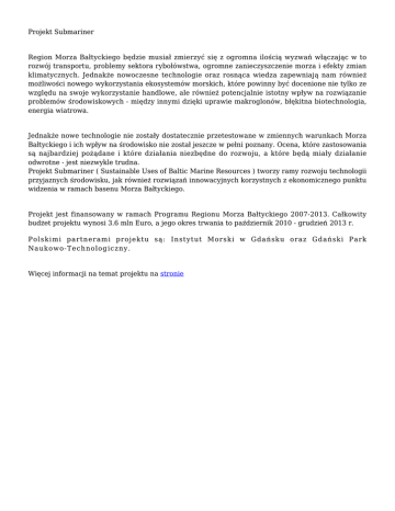Projekt Submariner Region Morza Bałtyckiego będzie musiał zmierzyć się z ogromna ilością wyzwań włączając w to rozwój transportu, problemy sektora rybołówstwa, ogromne zanieczyszczenie morza i efekty zmian klimatycznych. Jednakże nowoczesne technologie oraz rosnąca wiedza zapewniają nam również możliwości nowego wykorzystania ekosystemów morskich, które powinny być docenione nie tylko ze względu na swoje wykorzystanie handlowe, ale również potencjalnie istotny wpływ na rozwiązanie problemów środowiskowych - między innymi dzięki uprawie makroglonów, błękitna biotechnologia, energia wiatrowa. Jednakże nowe technologie nie zostały dostatecznie przetestowane w zmiennych warunkach Morza Bałtyckiego i ich wpływ na środowisko nie został jeszcze w pełni poznany. Ocena, które zastosowania są najbardziej pożądane i które działania niezbędne do rozwoju, a które będą miały działanie odwrotne - jest niezwykle trudna. Projekt Submariner ( Sustainable Uses of Baltic Marine Resources ) tworzy ramy rozwoju technologii przyjaznych środowisku, jak również rozwiązań innowacyjnych korzystnych z ekonomicznego punktu widzenia w ramach basenu Morza Bałtyckiego. Projekt jest finansowany w ramach Programu Regionu Morza Bałtyckiego 2007-2013. Całkowity budżet projektu wynosi 3.6 mln Euro, a jego okres trwania to październik 2010 - grudzień 2013 r. Polskimi partnerami projektu są: Instytut Morski w Gdańsku oraz Gdański Park Naukowo-Technologiczny. Więcej informacji na temat projektu na stronie