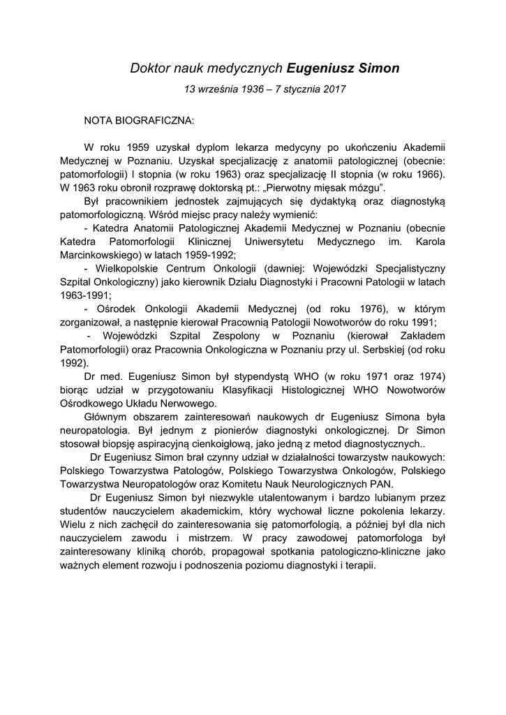 Doktor nauk medycznych Eugeniusz Simon 13 września 1936 – 7 stycznia 2017 NOTA BIOGRAFICZNA: W roku 1959 uzyskał dyplom lekarza medycyny po ukończeniu Akademii Medycznej w Poznaniu. Uzyskał specjalizację z anatomii patologicznej (obecnie: patomorfologii) I stopnia (w roku 1963) oraz specjalizację II stopnia (w roku 1966). W 1963 roku obronił rozprawę doktorską pt.: „Pierwotny mięsak mózgu”. Był pracownikiem jednostek zajmujących się dydaktyką oraz diagnostyką patomorfologiczną. Wśród miejsc pracy należy wymienić: - Katedra Anatomii Patologicznej Akademii Medycznej w Poznaniu (obecnie Katedra Patomorfologii Klinicznej Uniwersytetu Medycznego im. Karola Marcinkowskiego) w latach 1959-1992; - Wielkopolskie Centrum Onkologii (dawniej: Wojewódzki Specjalistyczny Szpital Onkologiczny) jako kierownik Działu Diagnostyki i Pracowni Patologii w latach 1963-1991; - Ośrodek Onkologii Akademii Medycznej (od roku 1976), w którym zorganizował, a następnie kierował Pracownią Patologii Nowotworów do roku 1991; - Wojewódzki Szpital Zespolony w Poznaniu (kierował Zakładem Patomorfologii) oraz Pracownia Onkologiczna w Poznaniu przy ul. Serbskiej (od roku 1992). Dr med. Eugeniusz Simon był stypendystą WHO (w roku 1971 oraz 1974) biorąc udział w przygotowaniu Klasyfikacji Histologicznej WHO Nowotworów Ośrodkowego Układu Nerwowego. Głównym obszarem zainteresowań naukowych dr Eugeniusz Simona była neuropatologia. Był jednym z pionierów diagnostyki onkologicznej. Dr Simon stosował biopsję aspiracyjną cienkoigłową, jako jedną z metod diagnostycznych.. Dr Eugeniusz Simon brał czynny udział w działalności towarzystw naukowych: Polskiego Towarzystwa Patologów, Polskiego Towarzystwa Onkologów, Polskiego Towarzystwa Neuropatologów oraz Komitetu Nauk Neurologicznych PAN. Dr Eugeniusz Simon był niezwykle utalentowanym i bardzo lubianym przez studentów nauczycielem akademickim, który wychował liczne pokolenia lekarzy. Wielu z nich zachęcił do zainteresowania się patomorfologią, a później był dla nich nauczycielem zawodu i mistrzem. W pracy zawodowej patomorfologa był zainteresowany kliniką chorób, propagował spotkania patologiczno-kliniczne jako ważnych element rozwoju i podnoszenia poziomu diagnostyki i terapii.