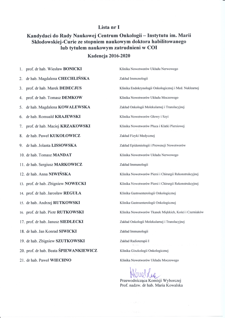 Kandydaci do Rady Naukowej Centrum Onkologii - Instytutu im. Marii
