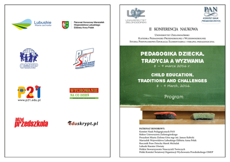 II KONFERENCJA NAUKOWA Uniwersytet Zielonogórski Katedra Pedagogiki Przedszkolnej i Wczesnoszkolnej Studia Podyplomowe Edukacja Elementarna i terapia pedagogiczna Pedagogika dziecka. Tradycja a wyzwania 8 – 9 marca 2016 r. CHILD EDUCATION. TRADITIONS AND CHALLENGES 8 - 9 March, 2016. Program PatronaT honorowy: Komitet Nauk Pedagogicznych PAN Rektor Uniwersytetu Zielonogórskiego Prezydent Miasta Zielona Góra mgr inż. Janusz Kubicki Marszałek Województwa Lubuskiego Elżbieta Anna Polak Rzecznik Praw Dziecka Marek Michalak Lubuski Kurator Oświaty Polskie Stowarzyszenie Nauczycieli Twórczych Polski Komitet Światowej Organizacji Wychowania Przedszkolnego OMEP Komitet naukowy: Komitet Nauk Pedagogicznych PAN jest samorządną reprezentacją nauk pedagogicznych, służącą integrowaniu uczonych z całego kraju, wchodzącą w skład I Wydziału Nauk Humanistycznych i Społecznych PAN. Przewodnicząca – prof. nzw. UZ, dr hab. Marzenna Magda-Adamowicz prof. zw. dr hab. Irena Adamek prof. nzw. dr hab. Jolanta Andrzejewska prof. nzw. dr hab. Józefa Bałachowicz prof. nzw. dr hab. Wiga Bednarkowa doc. dr hab. Radmila Burkovičová prof. zw. dr hab. Krystyna Chałas prof. nzw dr hab. Agata Cudowska prof. nzw. dr hab. Małgorzata Cywińska prof. zw. dr hab. Kazimierz Denek prof. zw. dr hab. Krystyna Duraj-Nowakowa prof. zw. dr hab. Krystyna Ferenz prof. nzw. dr hab. Marek Furmanek prof. nzw. dr hab. Grażyna Gajewska doc. dr hab. Ivana Gejgušová prof. zw. dr hab. Edyta Gruszczyk-Kolczyńska prof. nzw. dr hab. Jan Grzesiak prof. zw. dr hab. Sabina Guz prof. zw. dr hab. Maria Jakowicka prof. nzw. dr hab. Anna Karpińska prof. nzw. dr hab. Lidia Kataryńczuk-Mania prof. nzw. dr hab. Ewa Kobyłecka prof. nzw. dr hab. Mirosław Kowalski prof. zw dr hab. Wojciech Kojs prof. nzw. dr hab. Hanna Krauze-Sikorska prof. nzw. dr hab. Pola Kuleczka prof. nzw. dr hab. Marian Marcinkowski ks. prof. zw. dr hab. Janusz Mastalski prof. zw. dr hab. Bożena Muchacka prof. nzw. dr hab. Ewa Ogrodzka-Mazur prof. zw. dr hab. Stanisław Palka prof. nzw. dr hab. Teresa Parczewska prof. zw. dr hab. Stanisław Popek prof. zw. dr hab. Józef Półturzycki prof. nzw. dr hab. Ewa Skrzetuska prof. dr hab. Barbara Smolińska-Theiss prof. nzw. dr hab. Małgorzata Suświłło prof. nzw. dr hab. Jolanta Szempruch prof. nzw. dr hab. Urszula Szuścik prof. zw. dr hab. Bogusław Śliwerski prof. nzw. dr hab. Dorota Turska prof. nzw. dr hab. Jadwiga Uchyła-Zroski prof. nzw. dr hab. Agnieszka Weiner prof. zw. dr hab. Kazimierz Wenta prof. nzw. dr hab. Krystyna Żuchelkowska prof. nzw. dr hab. Małgorzata Żytko Czasopisma Komitetu Nauk Pedagogicznych PAN lub zespołów Komitetu Nauk Pedagogicznych PAN: • Rocznik Pedagogiczny www.staff.amu.edu.pl/~pedszkol/rocznik_pedagogiczny • Studia Pedagogiczne www.spedagogiczne.ptp-pl.org • Studia z Teorii Wychowania http://wydawnictwo.chat.edu.pl/studia-z-teorii-wychowania/ • Pedagogika Społeczna http://pedagogium.pl/wydawnictwo/pedagogika-spoleczna.html • Resocjalizacja Polska http://pedagogium.pl/wydawnictwo/rocznik-resocjalizacja-polska.html • Biuletyn Historii Wychowania http://www.historiawychowania.amu.edu.pl/biuletyn.html • Przegląd Pedagogiczny http://www.przegladpedagogiczny.ukw.edu.pl/ członkowie: dr Agnieszka Olczak, mgr Katarzyna Miłek, mgr Klaudia Żernik • Paedagogia Christiana http://www.paedchrist.umk.pl/ adres e-mailowy: [email protected] • Chowanna http://www.chowanna.us.edu.pl/ Komitet organizacyjny: sekretarze: dr Iwona Kopaczyńska, dr Mirosława Nyczaj-Drąg