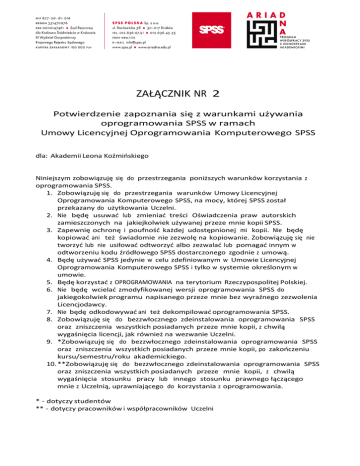 ZAŁĄCZNIK NR 2 Potwierdzenie zapoznania się z warunkami używania oprogramowania SPSS w ramach Umowy Licencyjnej Oprogramowania Komputerowego SPSS dla: Akademii Leona Koźmińskiego Niniejszym zobowiązuję się do przestrzegania poniższych warunków korzystania z oprogramowania SPSS. 1. Zobowiązuję się do przestrzegania warunków Umowy Licencyjnej Oprogramowania Komputerowego SPSS, na mocy, której SPSS został przekazany do użytkowania Uczelni. 2. Nie będę usuwać lub zmieniać treści Oświadczenia praw autorskich zamieszczonych na jakiejkolwiek używanej przeze mnie kopii SPSS. 3. Zapewnię ochronę i poufność każdej udostępnionej mi kopii. Nie będę kopiować ani też świadomie nie zezwolę na kopiowanie. Zobowiązuję się nie tworzyć lub nie usiłować odtworzyć albo zezwalać lub pomagać innym w odtworzeniu kodu źródłowego SPSS dostarczonego zgodnie z umową. 4. Będę używać SPSS jedynie w celu zdefiniowanym w Umowie Licencyjnej Oprogramowania Komputerowego SPSS i tylko w systemie określonym w umowie. 5. Będę korzystać z OPROGRAMOWANIA na terytorium Rzeczypospolitej Polskiej. 6. Nie będę wcielać zmodyfikowanej wersji oprogramowania SPSS do jakiegokolwiek programu napisanego przeze mnie bez wyraźnego zezwolenia Licencjodawcy. 7. Nie będę odkodowywać ani też dekompilować oprogramowania SPSS. 8. Zobowiązuję się do bezzwłocznego zdeinstalowania oprogramowania SPSS oraz zniszczenia wszystkich posiadanych przeze mnie kopii, z chwilą wygaśnięcia licencji, jak również na wezwanie Uczelni. 9. *Zobowiązuję się do bezzwłocznego zdeinstalowania oprogramowania SPSS oraz zniszczenia wszystkich posiadanych przeze mnie kopii, po zakończeniu kursu/semestru/roku akademickiego. 10. **Zobowiązuję się do bezzwłocznego zdeinstalowania oprogramowania SPSS oraz zniszczenia wszystkich posiadanych przeze mnie kopii, z chwilą wygaśnięcia stosunku pracy lub innego stosunku prawnego łączącego mnie z Uczelnią, uprawniającego do korzystania z oprogramowania. * - dotyczy studentów ** - dotyczy pracowników i współpracowników Uczelni