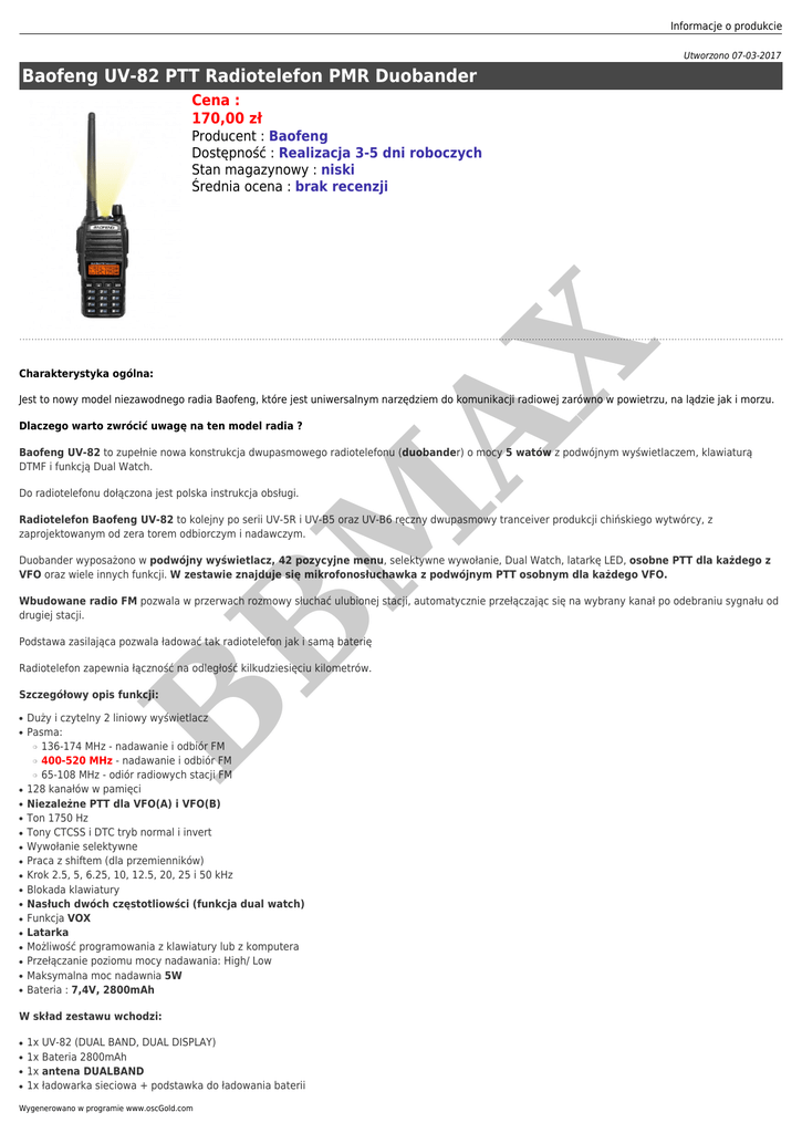 Informacje o produkcie Utworzono 07-03-2017 Baofeng UV-82 PTT Radiotelefon PMR Duobander Cena : 170,00 zł Charakterystyka ogólna: M AX Producent : Baofeng Dostępność : Realizacja 3-5 dni roboczych Stan magazynowy : niski Średnia ocena : brak recenzji Jest to nowy model niezawodnego radia Baofeng, które jest uniwersalnym narzędziem do komunikacji radiowej zarówno w powietrzu, na lądzie jak i morzu. Dlaczego warto zwrócić uwagę na ten model radia ? Baofeng UV-82 to zupełnie nowa konstrukcja dwupasmowego radiotelefonu (duobander) o mocy 5 watów z podwójnym wyświetlaczem, klawiaturą DTMF i funkcją Dual Watch. Do radiotelefonu dołączona jest polska instrukcja obsługi. Radiotelefon Baofeng UV-82 to kolejny po serii UV-5R i UV-B5 oraz UV-B6 ręczny dwupasmowy tranceiver produkcji chińskiego wytwórcy, z zaprojektowanym od zera torem odbiorczym i nadawczym. Duobander wyposażono w podwójny wyświetlacz, 42 pozycyjne menu, selektywne wywołanie, Dual Watch, latarkę LED, osobne PTT dla każdego z VFO oraz wiele innych funkcji. W zestawie znajduje się mikrofonosłuchawka z podwójnym PTT osobnym dla każdego VFO. B Wbudowane radio FM pozwala w przerwach rozmowy słuchać ulubionej stacji, automatycznie przełączając się na wybrany kanał po odebraniu sygnału od drugiej stacji. Podstawa zasilająca pozwala ładować tak radiotelefon jak i samą baterię Radiotelefon zapewnia łączność na odległość kilkudziesięciu kilometrów. ● ● Duży i czytelny 2 liniowy wyświetlacz Pasma: 136-174 MHz - nadawanie i odbiór FM 400-520 MHz - nadawanie i odbiór FM 65-108 MHz - odiór radiowych stacji FM 128 kanałów w pamięci Niezależne PTT dla VFO(A) i VFO(B) Ton 1750 Hz Tony CTCSS i DTC tryb normal i invert Wywołanie selektywne Praca z shiftem (dla przemienników) Krok 2.5, 5, 6.25, 10, 12.5, 20, 25 i 50 kHz Blokada klawiatury Nasłuch dwóch częstotliowści (funkcja dual watch) Funkcja VOX Latarka Możliwość programowania z klawiatury lub z komputera Przełączanie poziomu mocy nadawania: High/ Low Maksymalna moc nadawnia 5W Bateria : 7,4V, 2800mAh ❍ ❍ ❍ ● ● ● ● ● ● ● ● ● ● ● ● ● ● ● B Szczegółowy opis funkcji: W skład zestawu wchodzi: ● ● ● ● 1x UV-82 (DUAL BAND, DUAL DISPLAY) 1x Bateria 2800mAh 1x antena DUALBAND 1x ładowarka sieciowa + podstawka do ładowania baterii Wygenerowano w programie www.oscGold.com M AX 1x mikrofonosłuchawka z podwójnym PTT osobnym dla każdego VFO 1x klips do paska B ● B ●